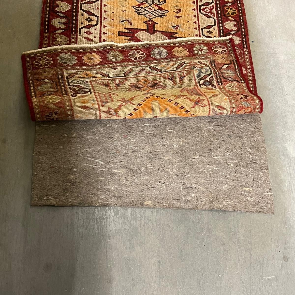 This beautiful fringeless rug has no mfg. label. It has an attractive design in reds and oranges. A pad is included; note one end of pad has been taped together.
