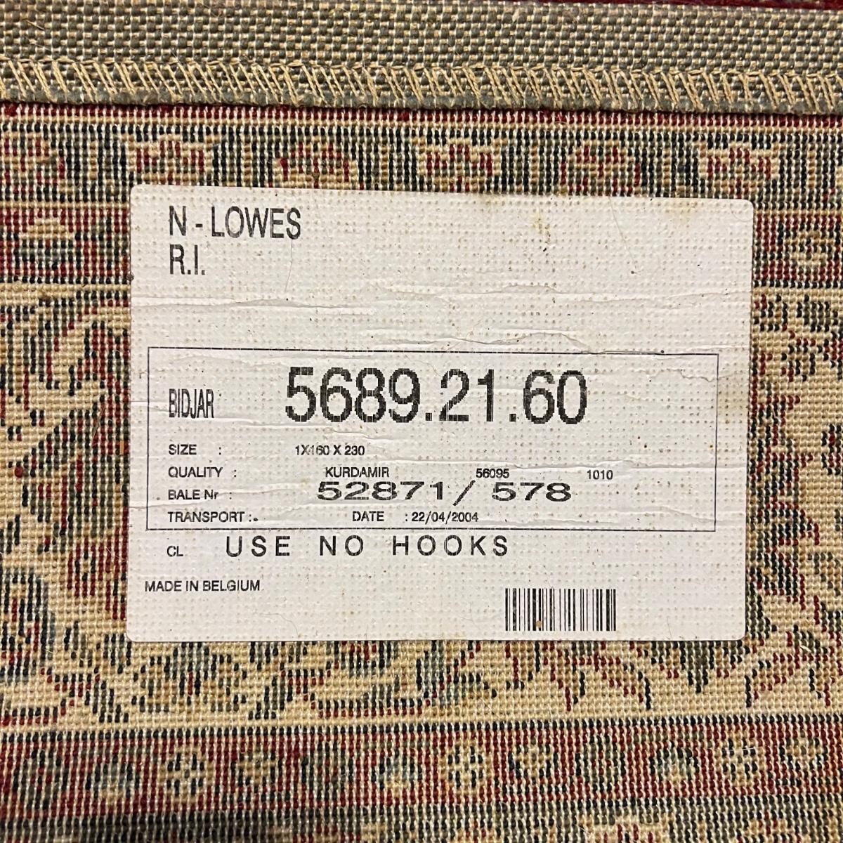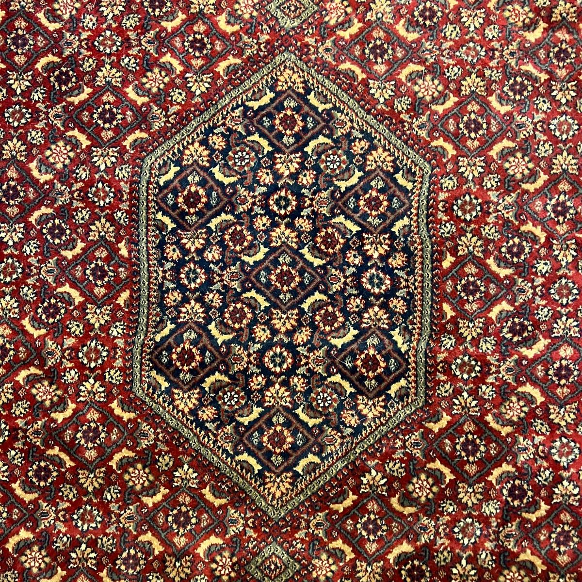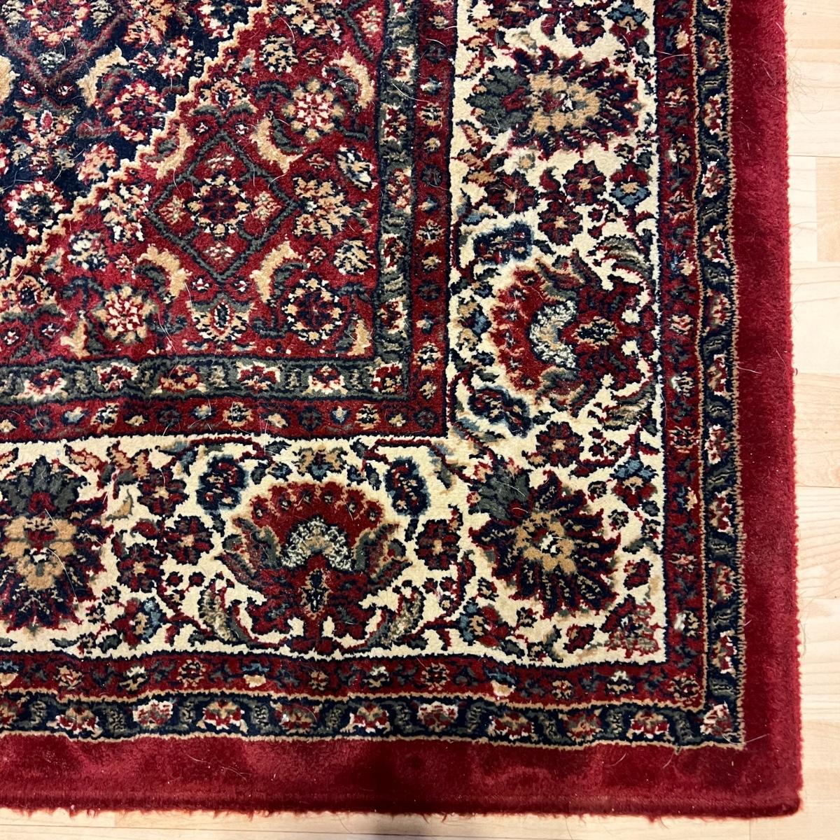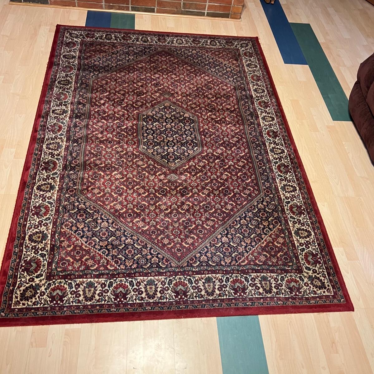 Red toned 5.3’ X 7.7’ Kurdamir Bidjar area rug by Caswell. The right side appears to be gently used and in good condition. The reverse side shows some stains, but does not have any odors.