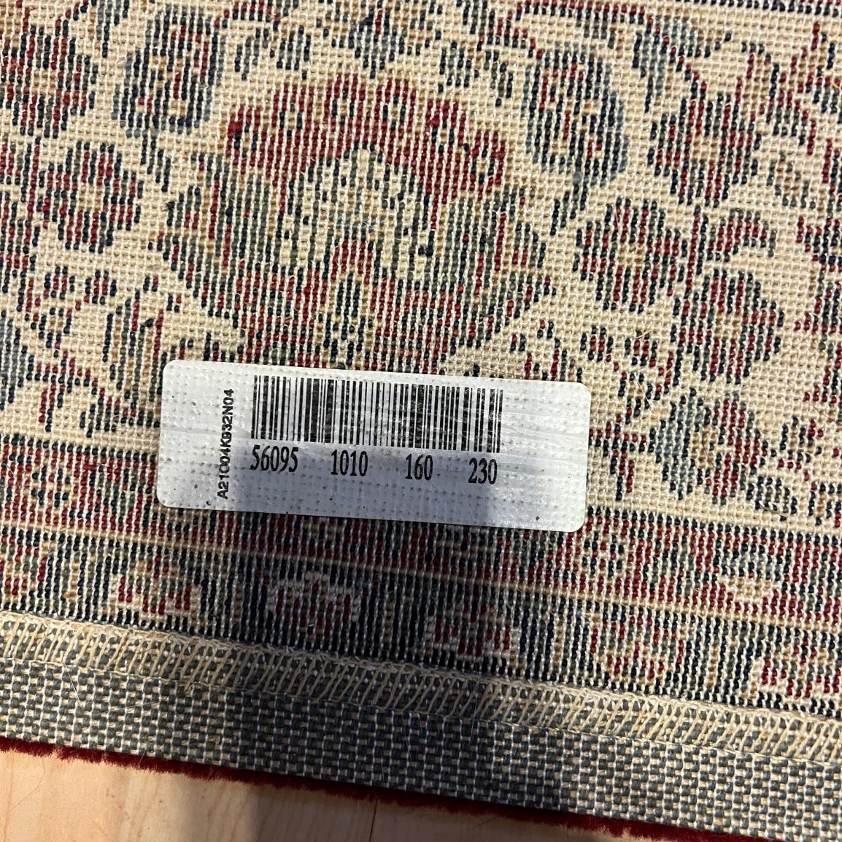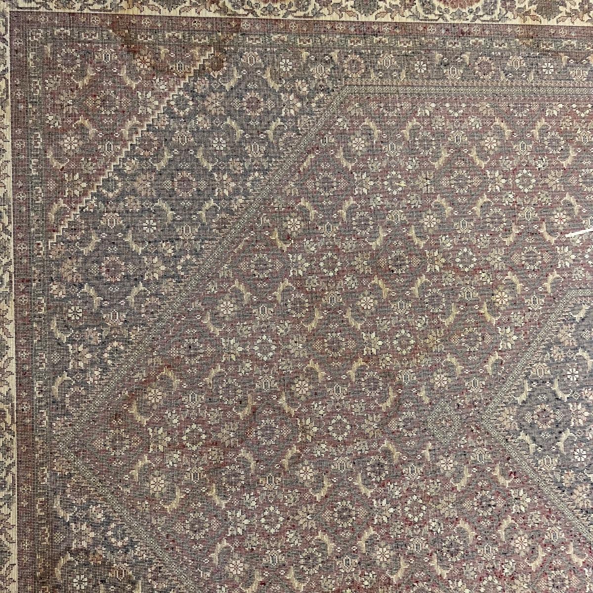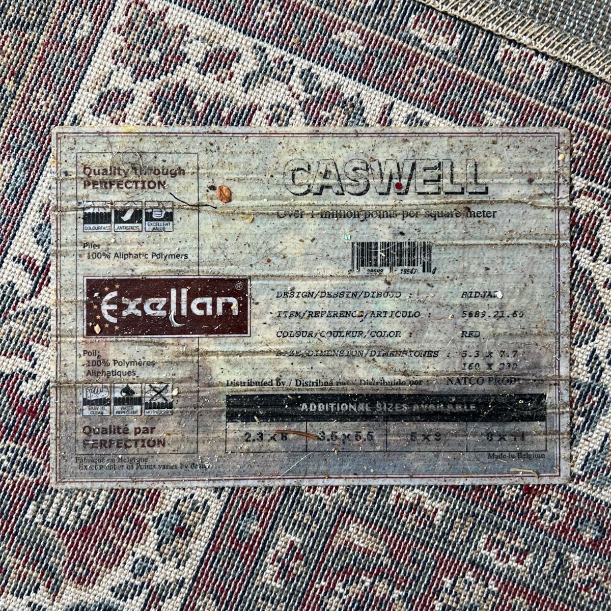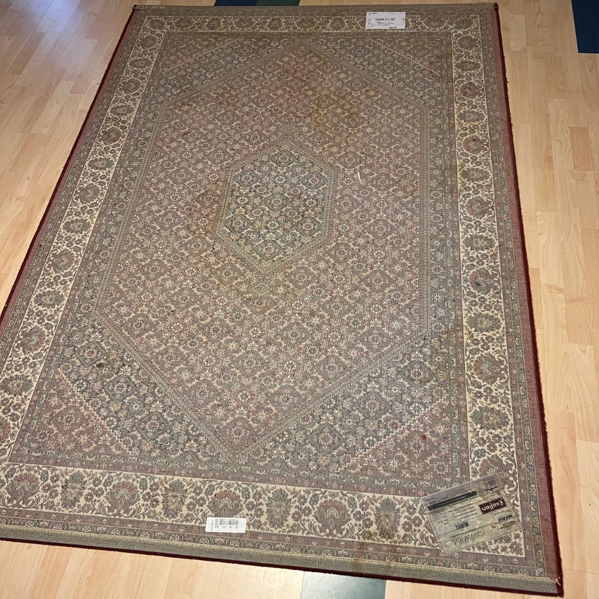 Red toned 5.3’ X 7.7’ Kurdamir Bidjar area rug by Caswell. The right side appears to be gently used and in good condition. The reverse side shows some stains, but does not have any odors.
