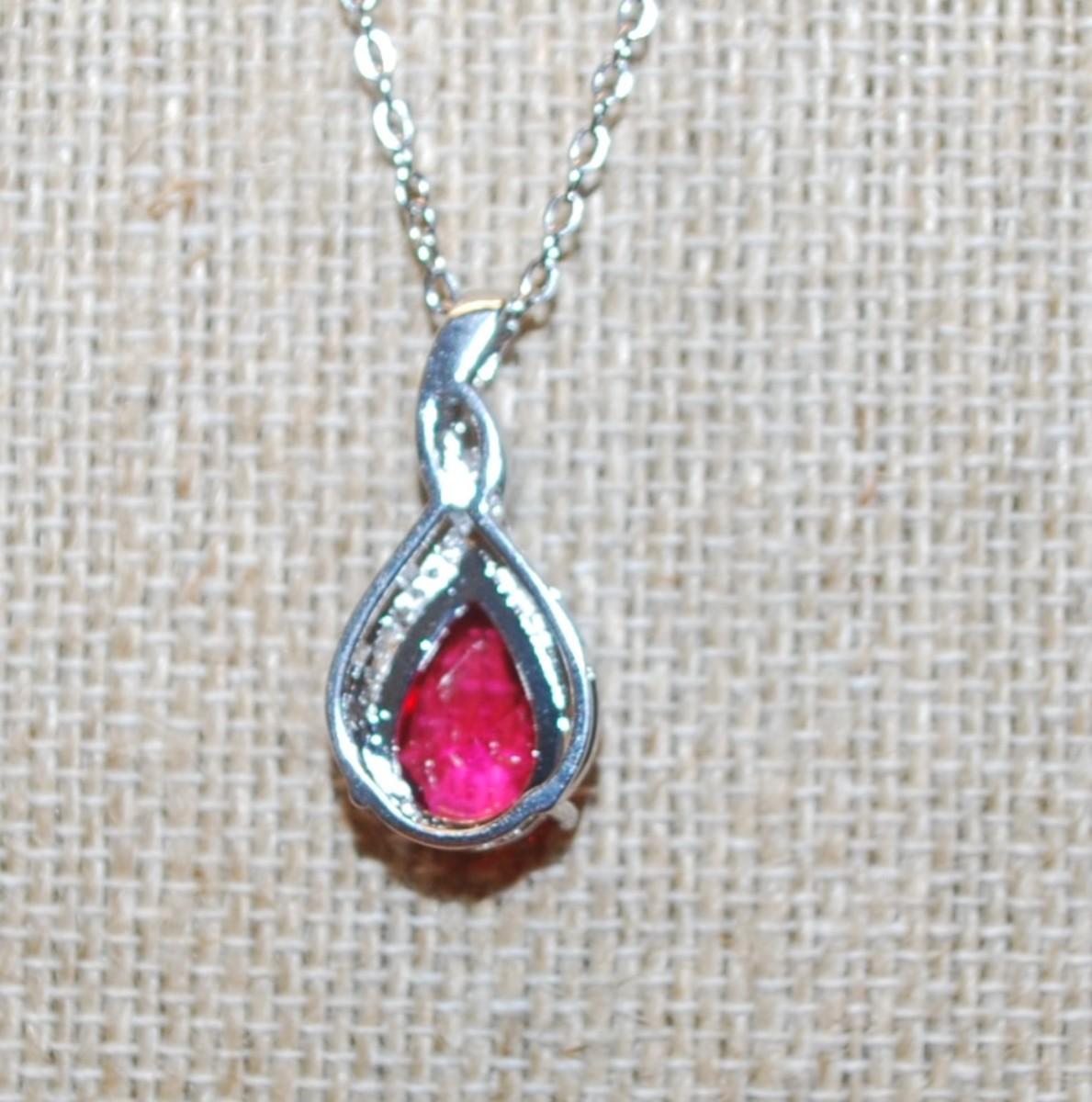 Red Pear Cut Stone PENDANT (1' x ½") on a Silver Tone Necklace Chain 18" L