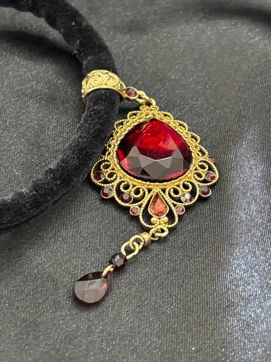 Red pendant Necklace filigree large teardrop velvet cord