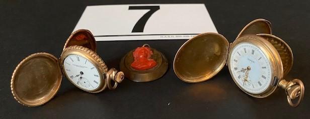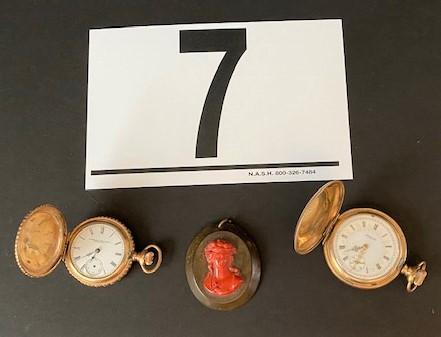 LOT#7: Red Phenolic Cameo & 2 Pocket Watches