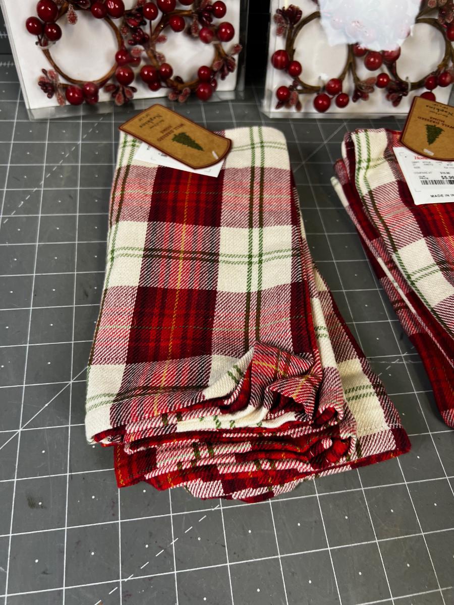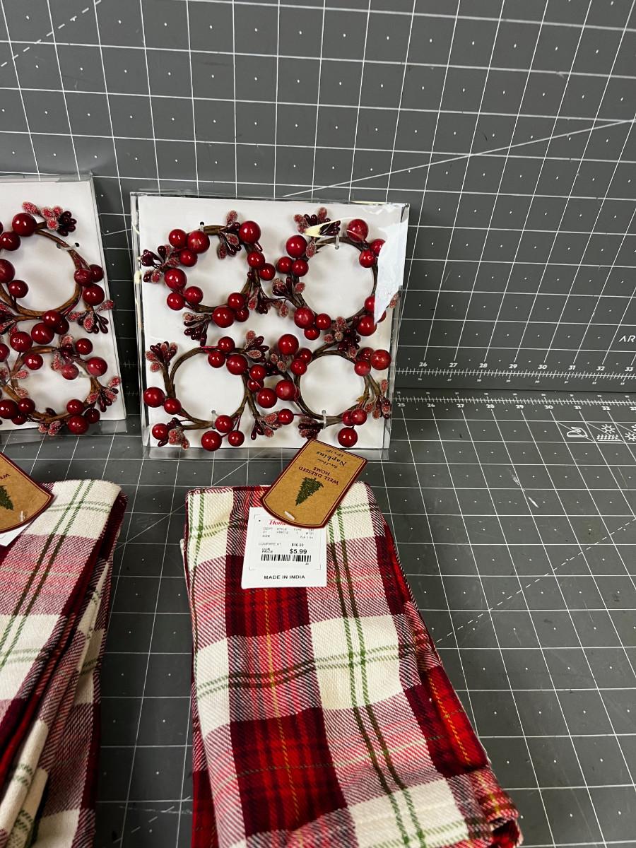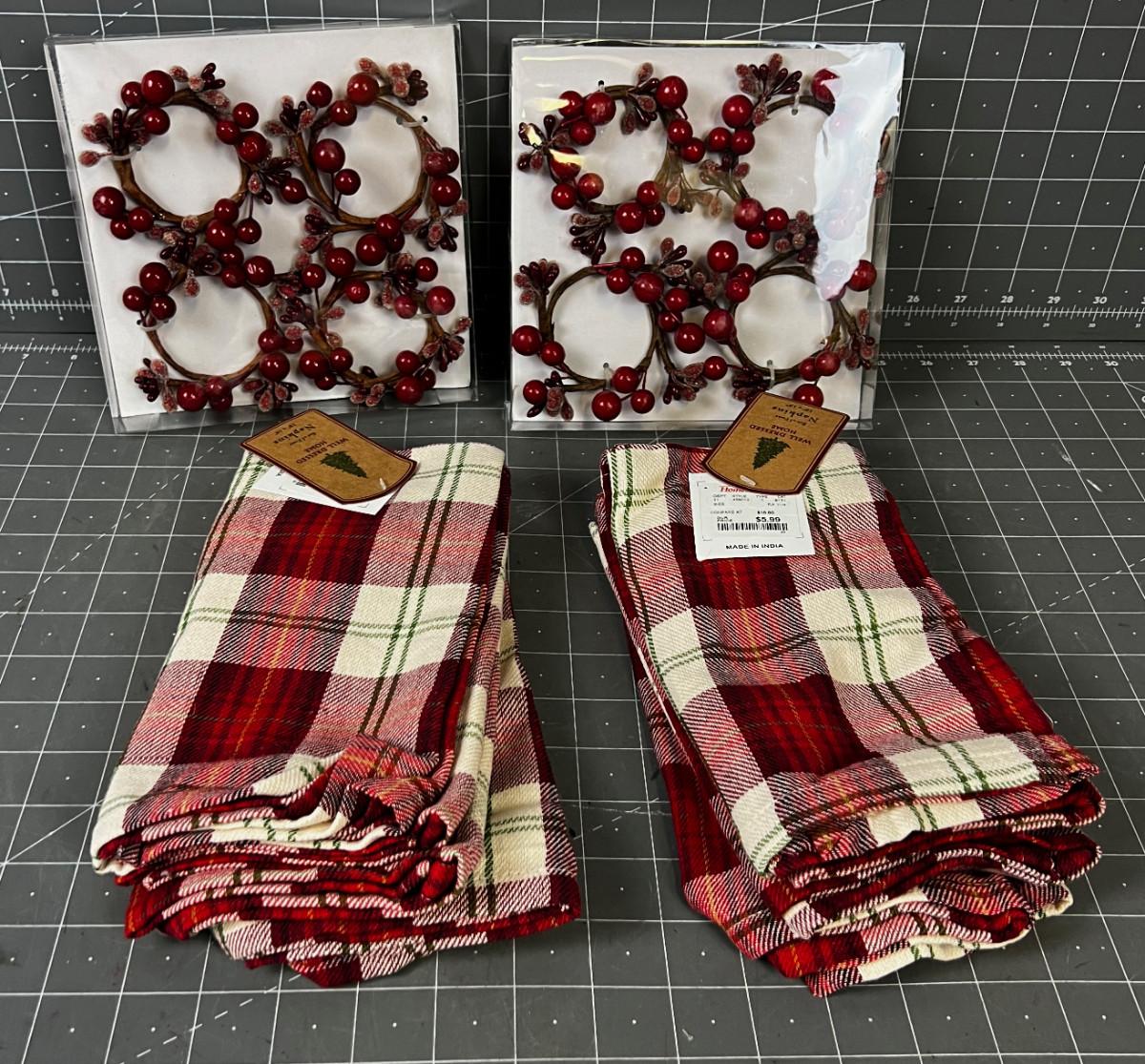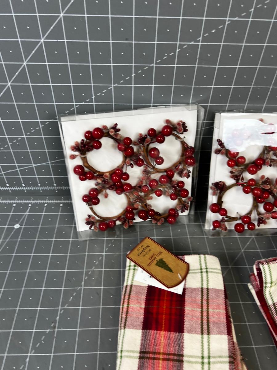 RED PLAID NAPKIN AND 8 HOLLY BERRY RINGS