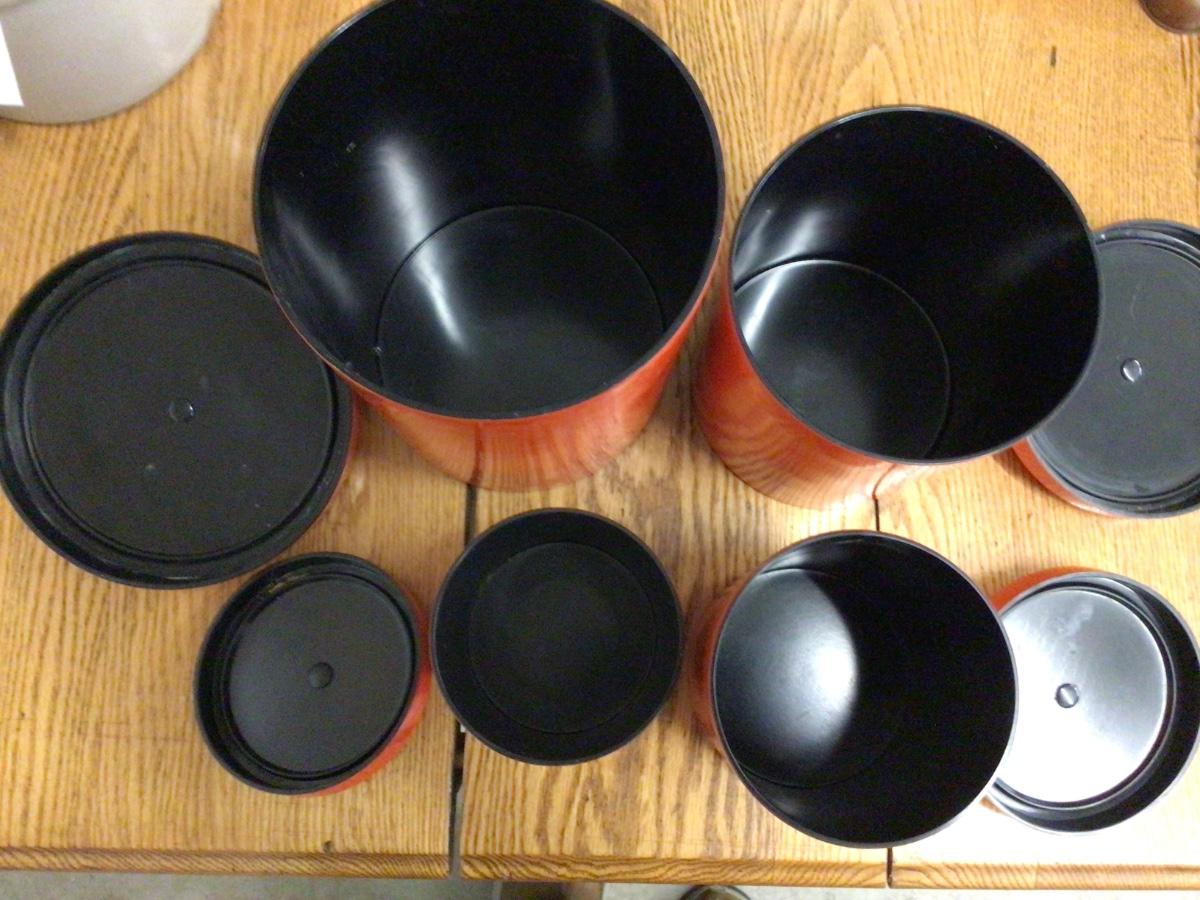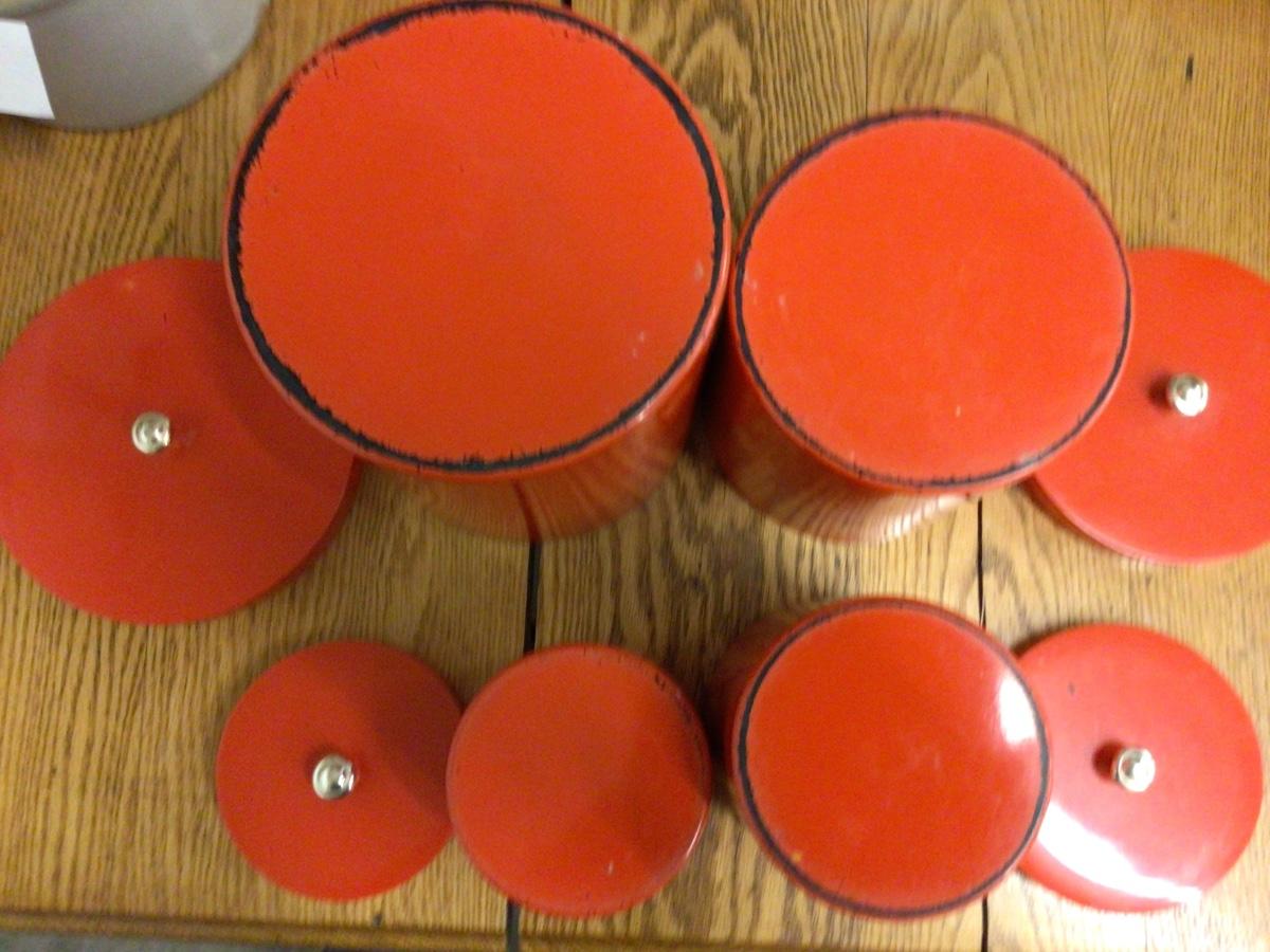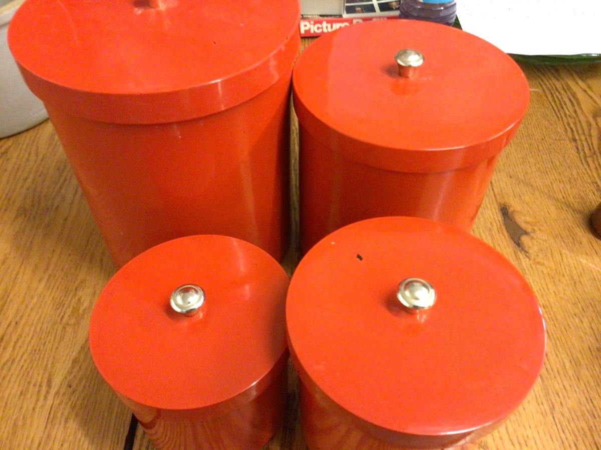 These are great red and black kitchen canisters. Set of 4 that do stack if you want to store them. It great condition.