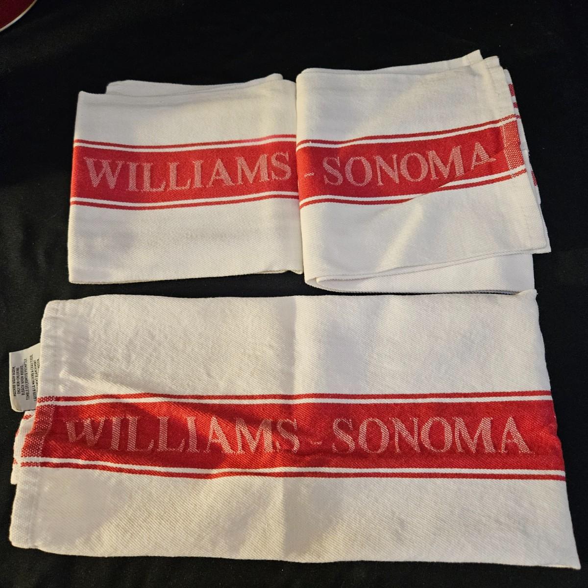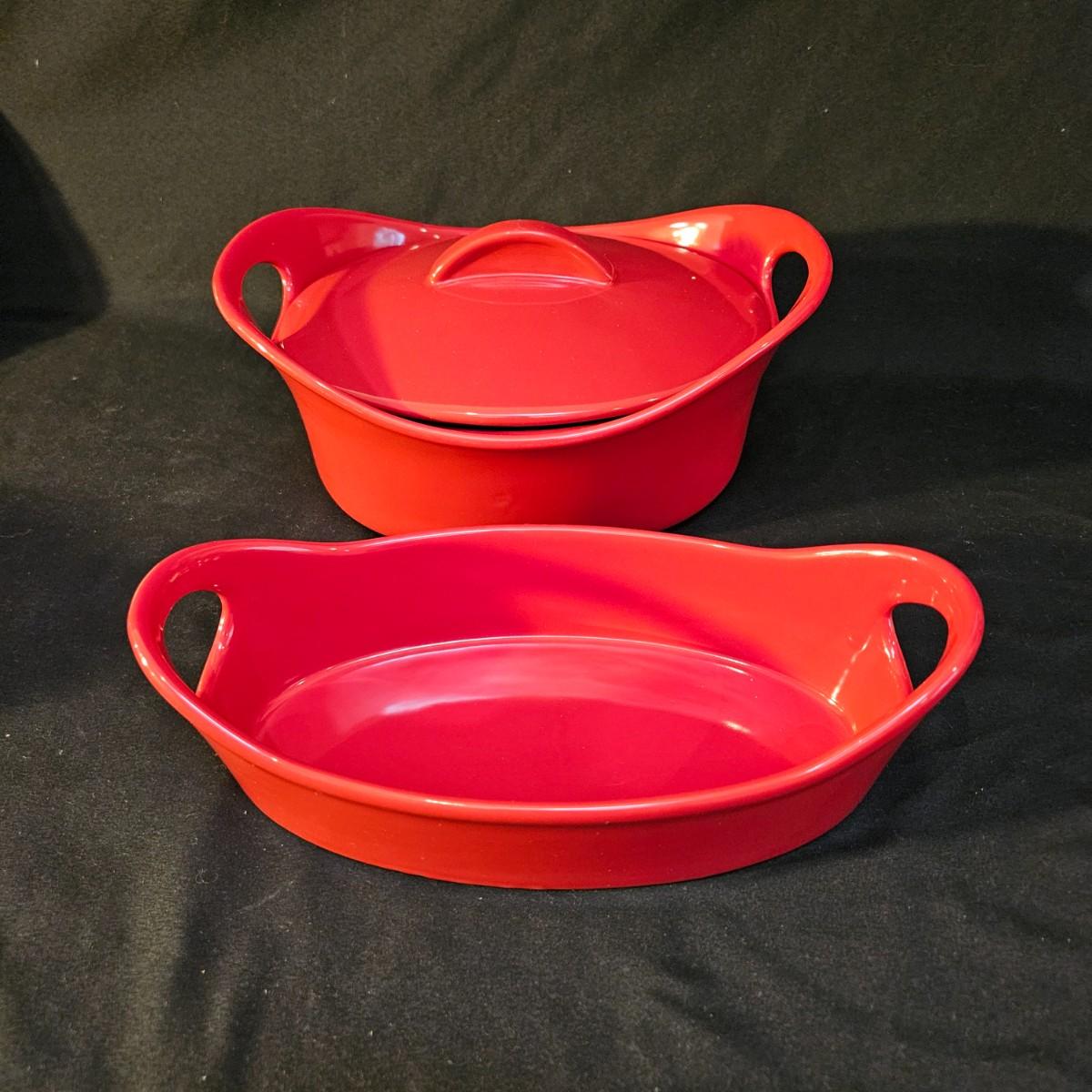 A collection of deep red kitchen items by a variety on manufacturers such as Rachel Ray, ForLife, Old Time Pottery and more. Includes a tea kettle, oil dispensers, coffee cups, a cheese grater, salt and pepper shakers and more. There is also a set of Williams and Sonoma dish towels and an apron. The largest lidded dish measures approximately 10" x 7" x 4.5"H. The oil dispensers have liquids still in them. Local pickup only
