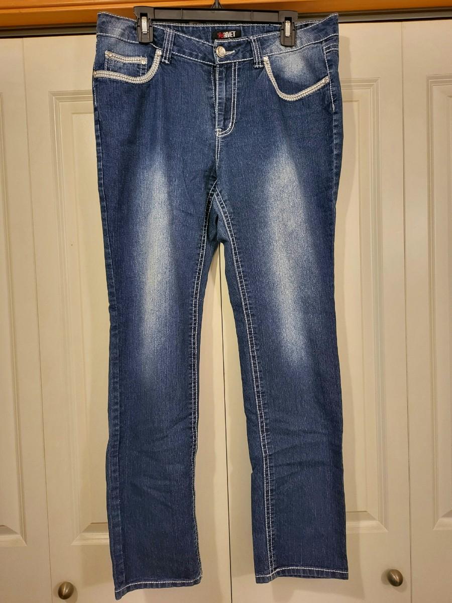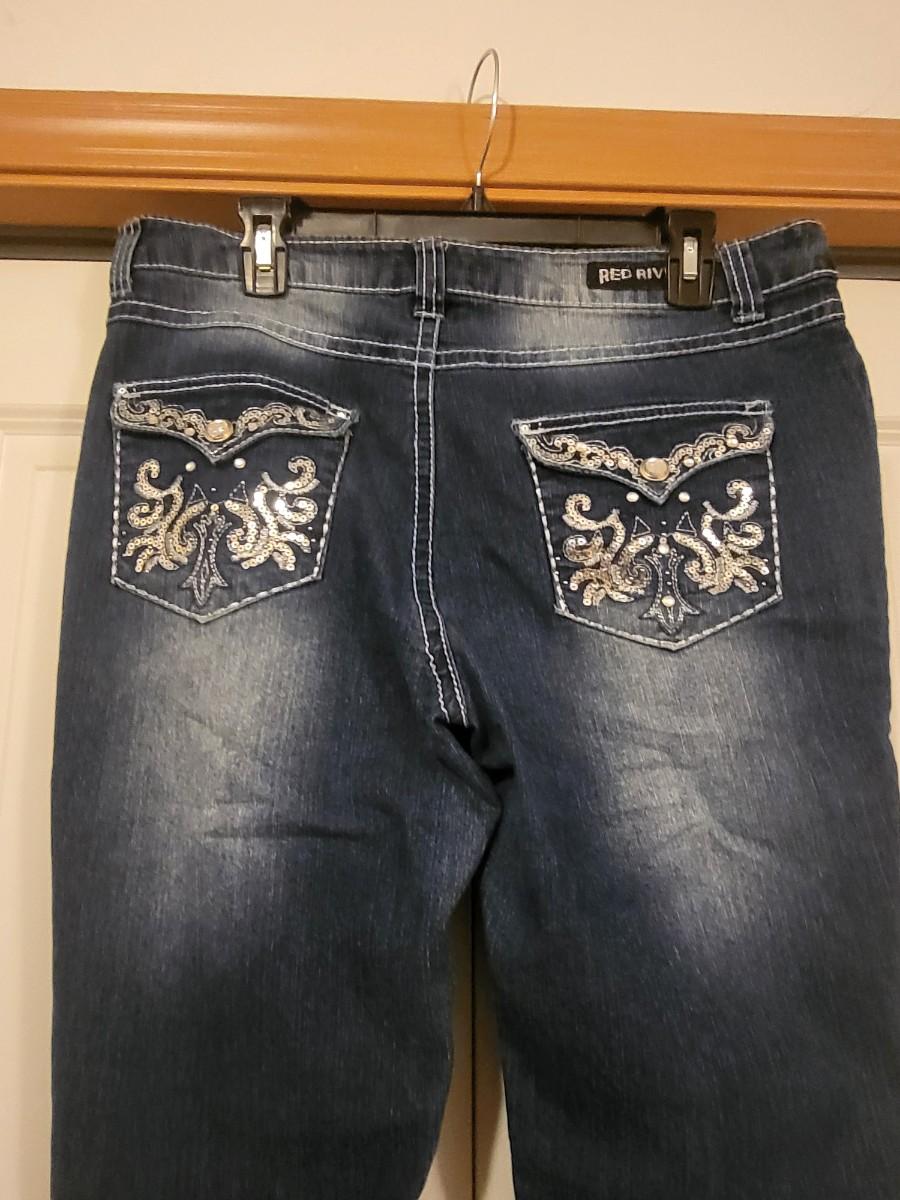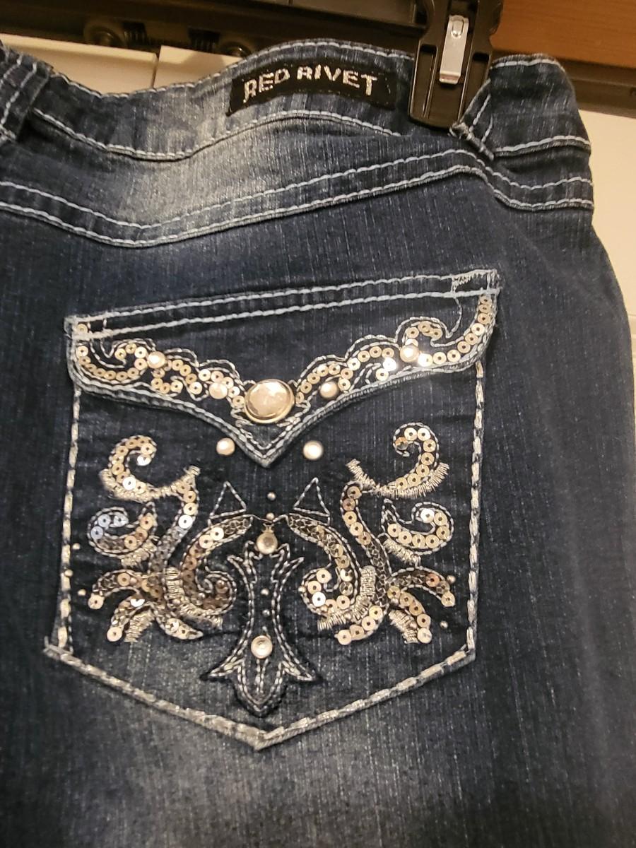 Women's Red Rivet brand, size 14, front white washed blue jeans. 31" inseam. Sequin & acrylic bedazzled back pockets and silver thread embroidered front pockets. Like new condition.