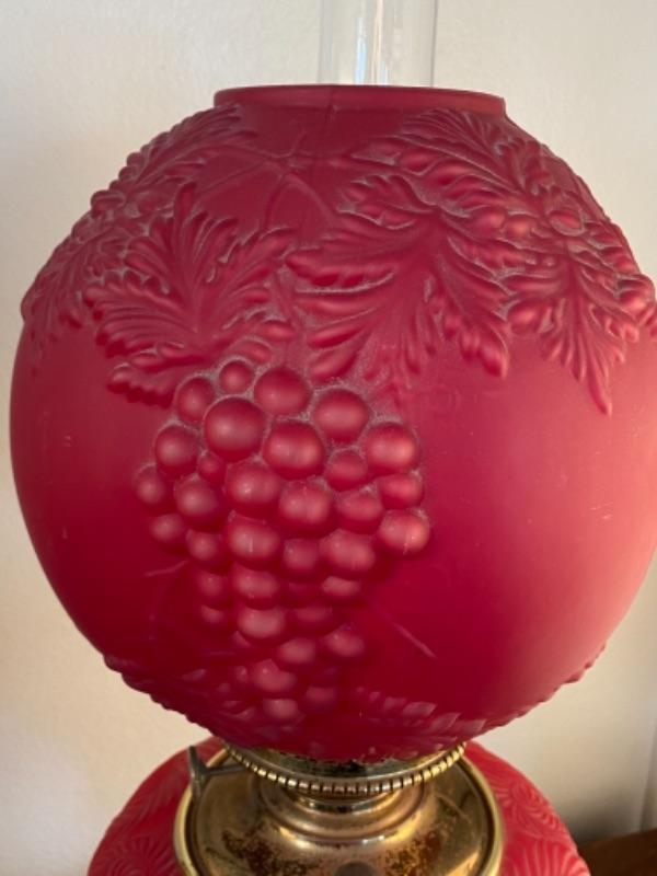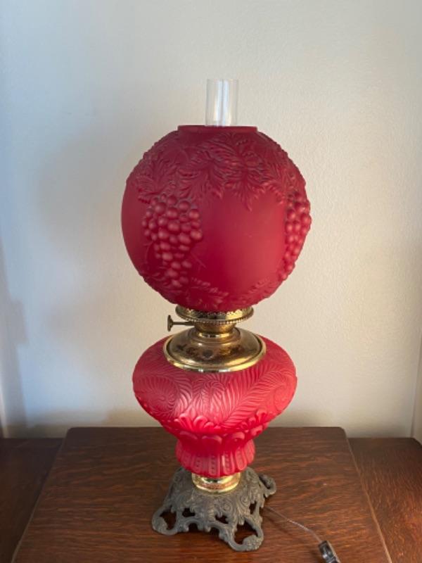Beautiful antique red satin globe success table lamp. Grape embossed pattern on globes. Three way light setting. In good condition. On/off switch on electric cord. About 26" tall.