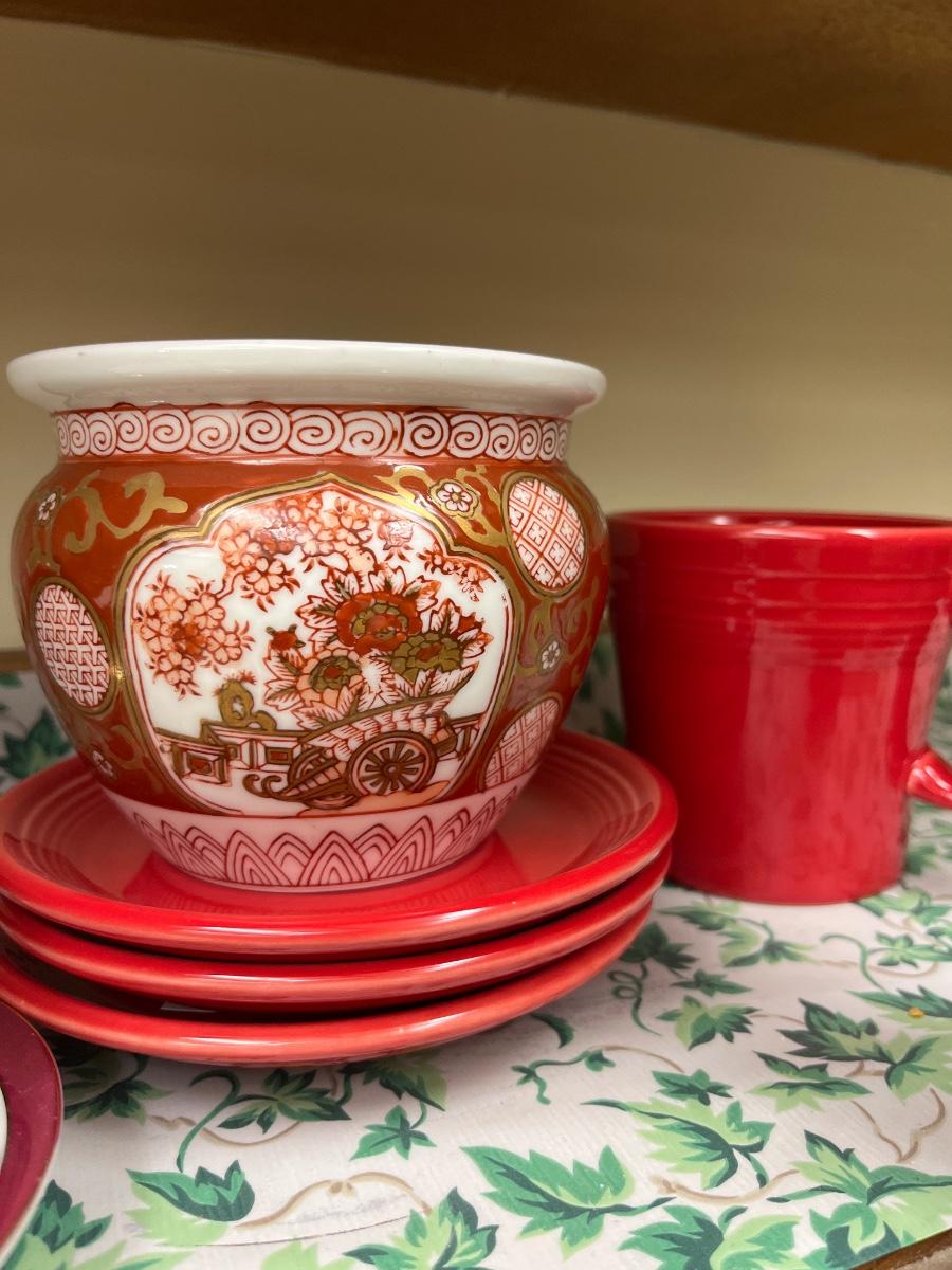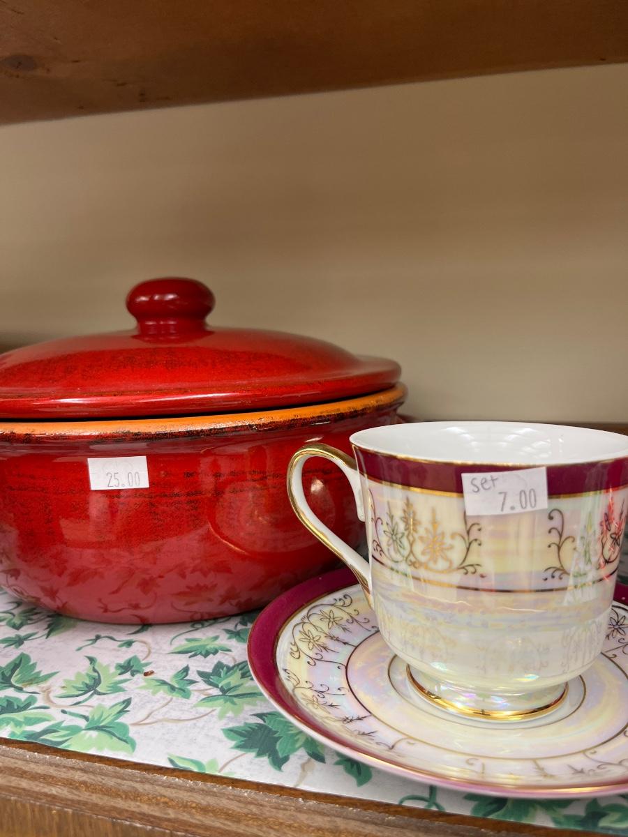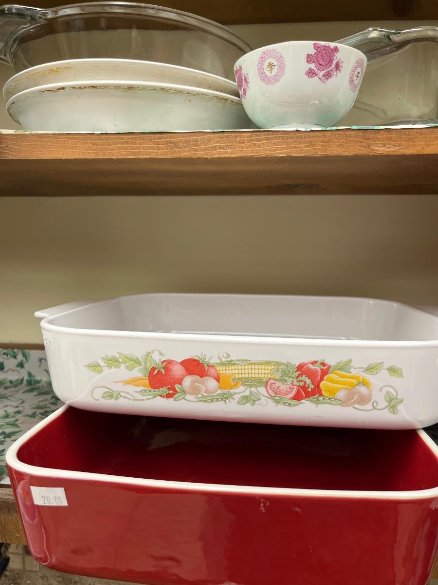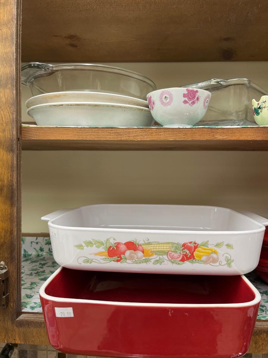 Red Casserole pan and crock, white crock square pan & pie plate., cup & Saucers.