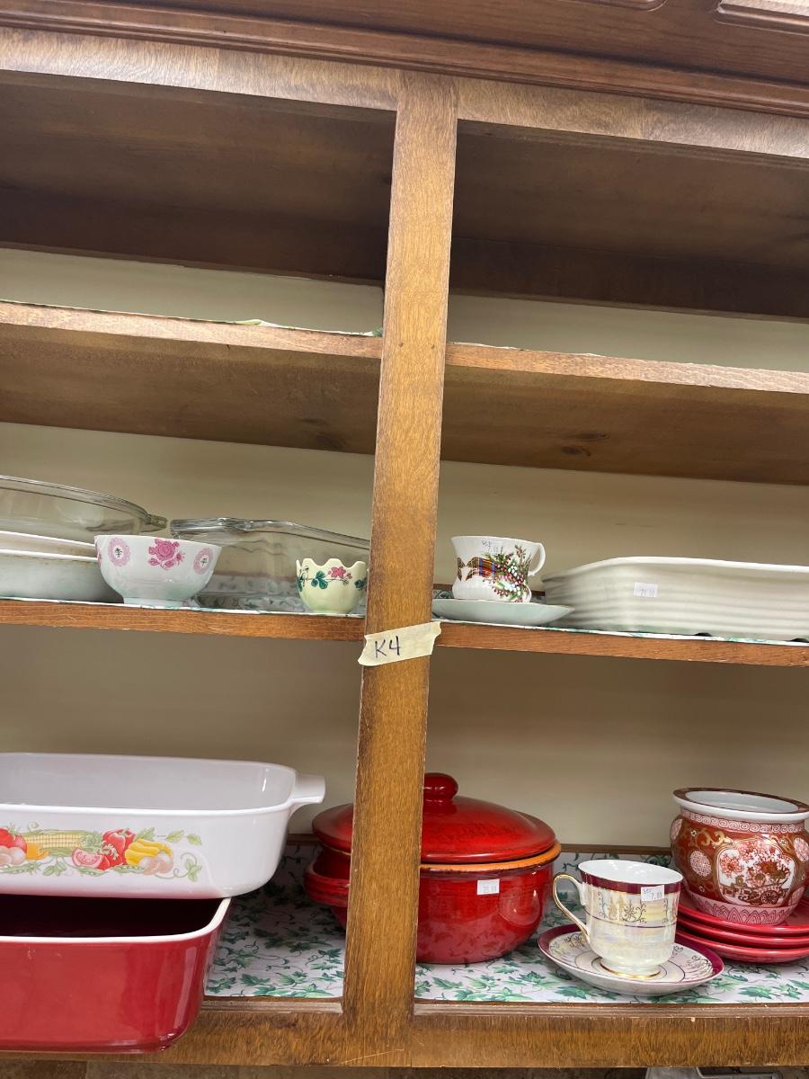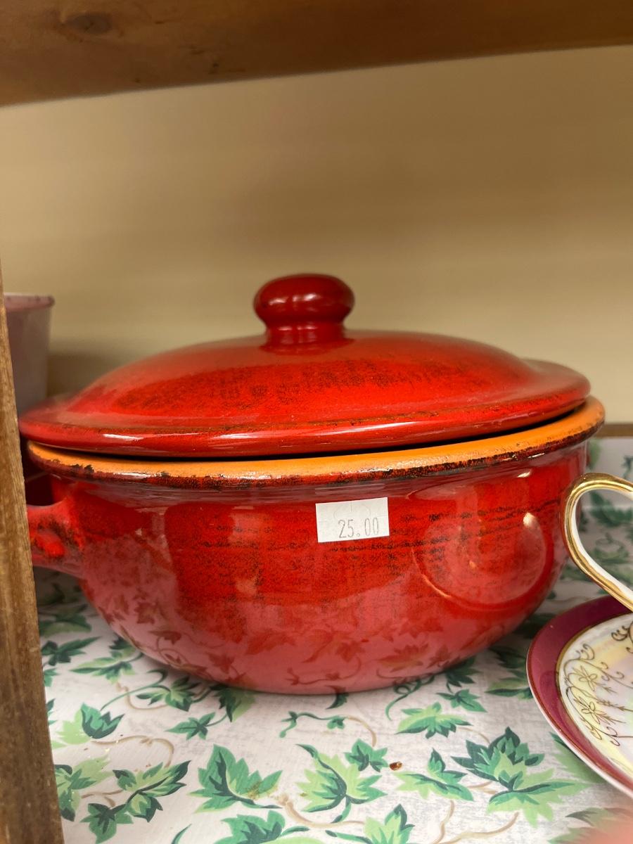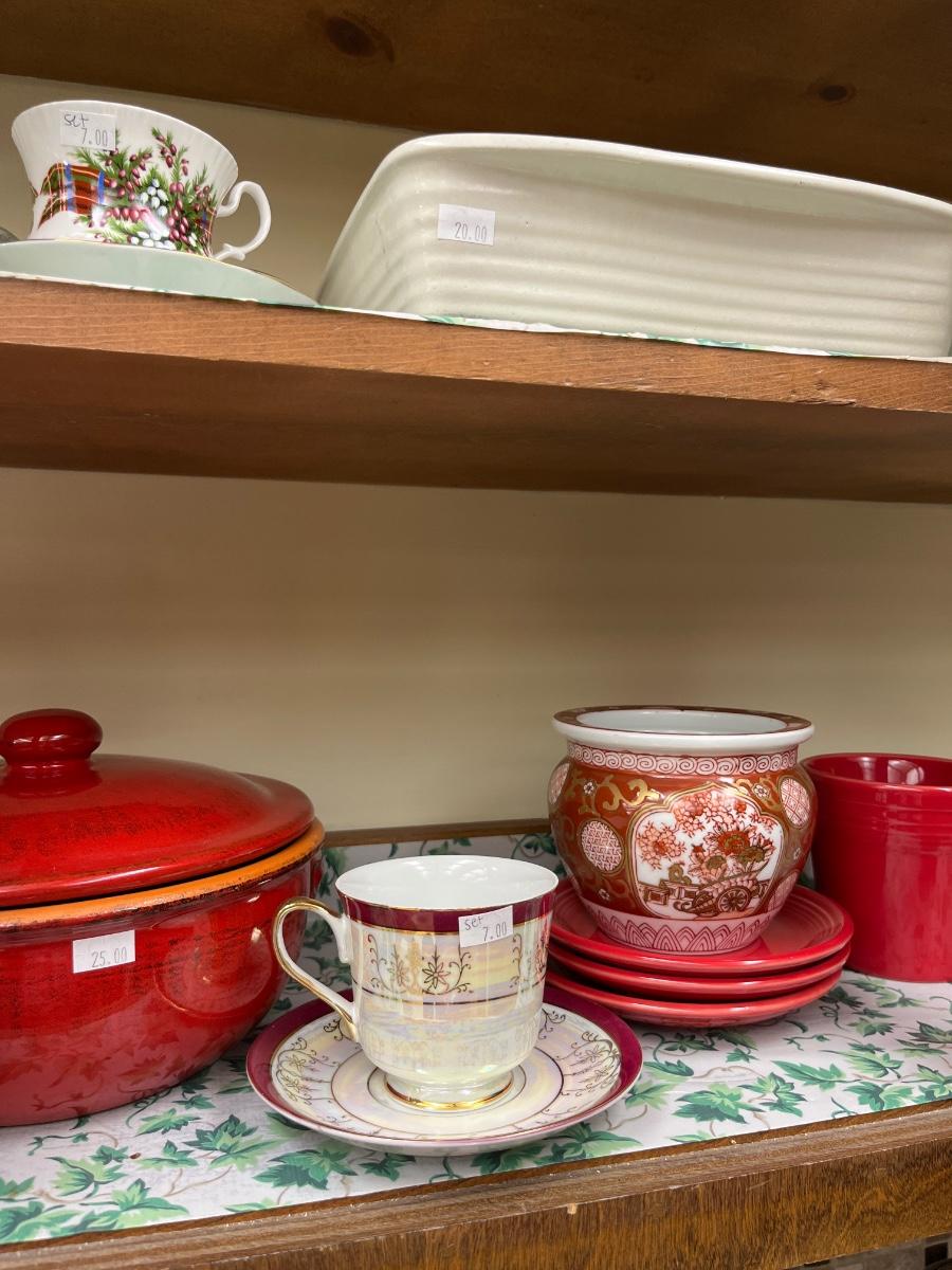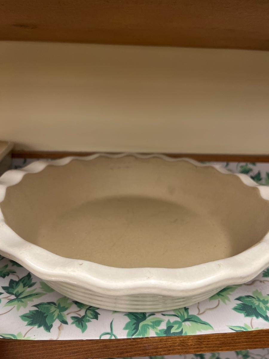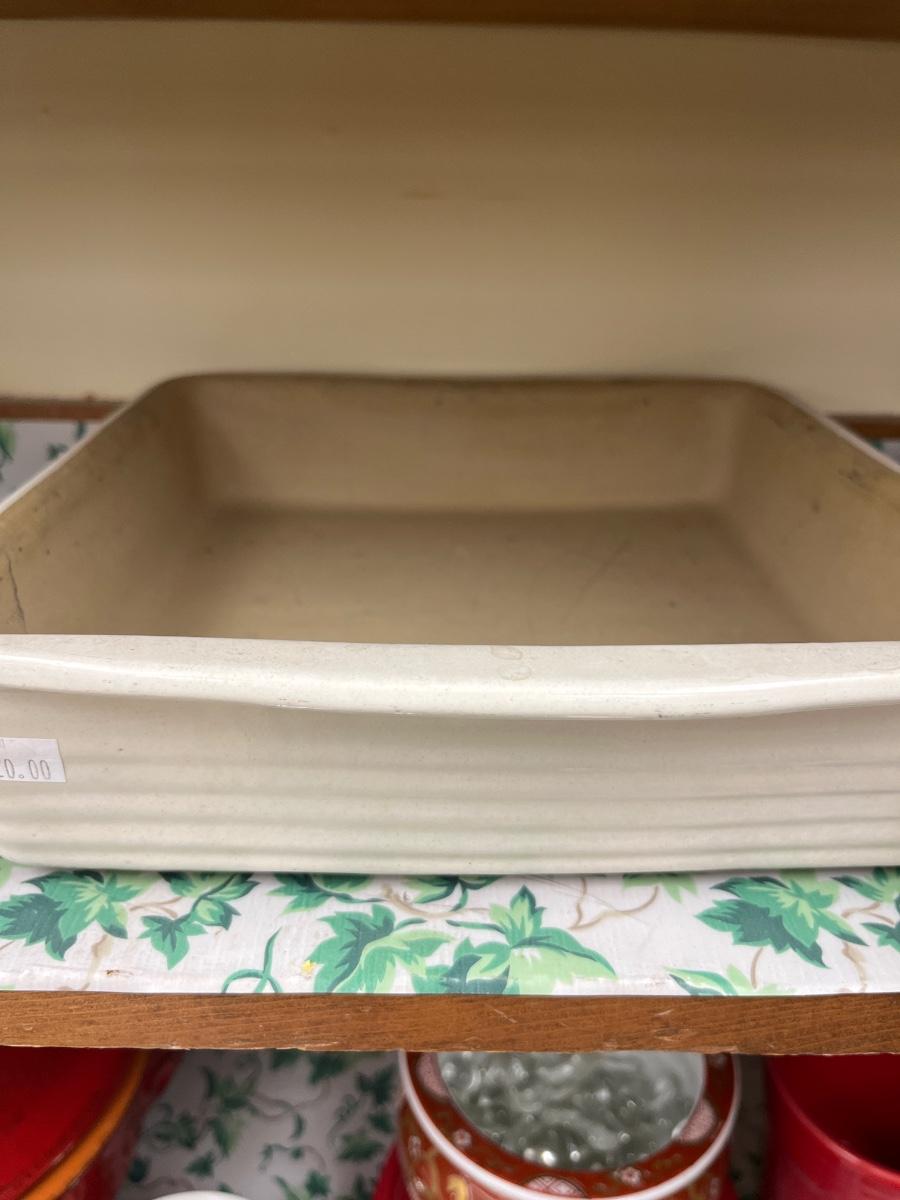 Red Casserole pan and crock, white crock square pan & pie plate., cup & Saucers.