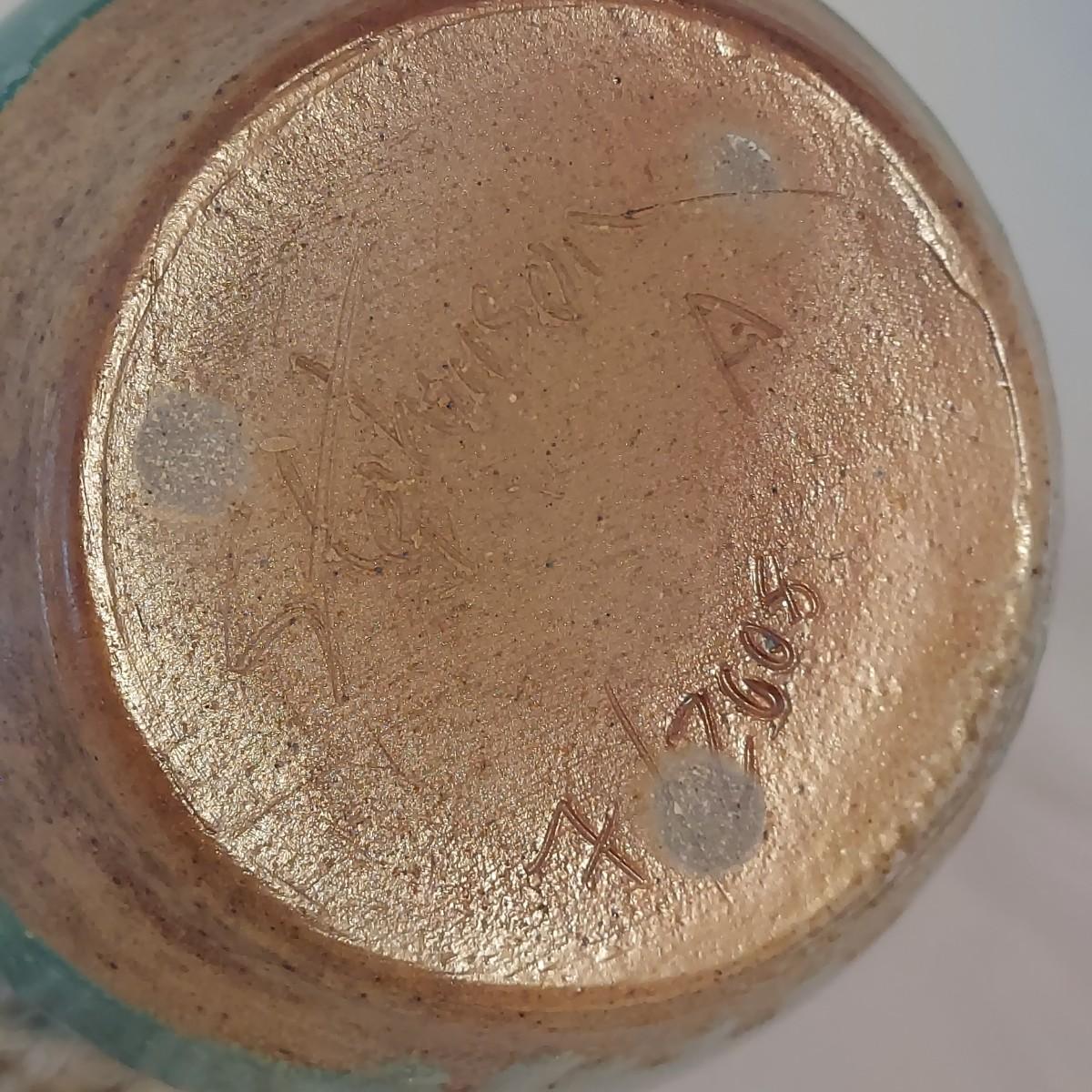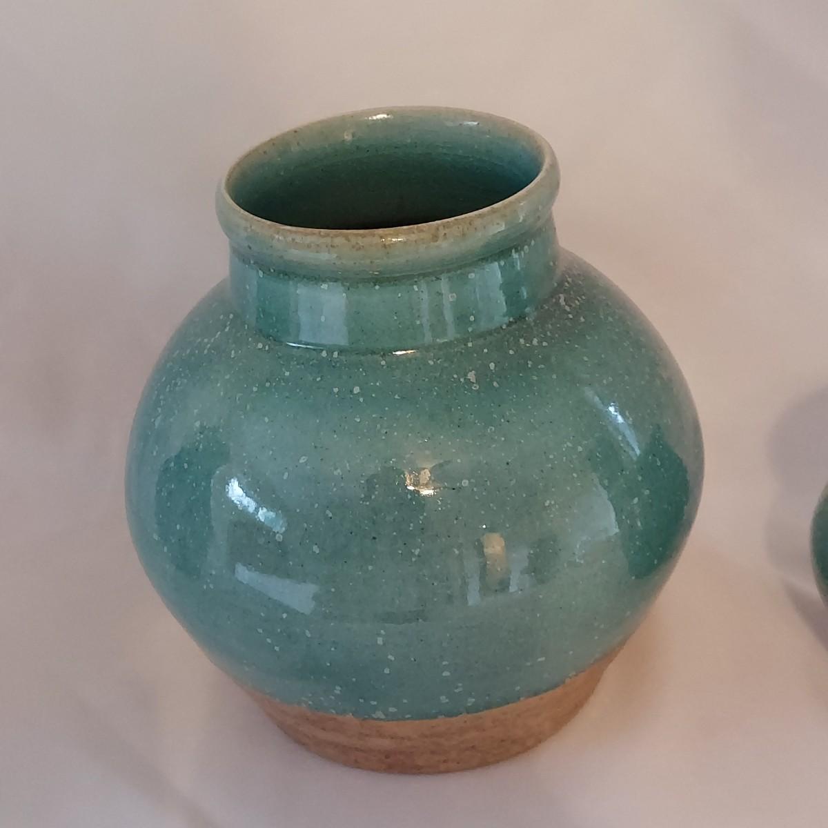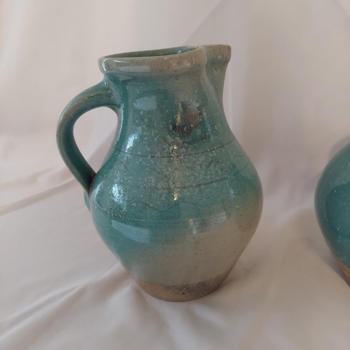 Three pieces of pottery with matching green glaze. Each has a marking on the bottom that appears to be from Red Step Studio out of Hendersonville, NC. The pitcher measures approximately 6"D x 9"H. Please see photos for details. Shipping available