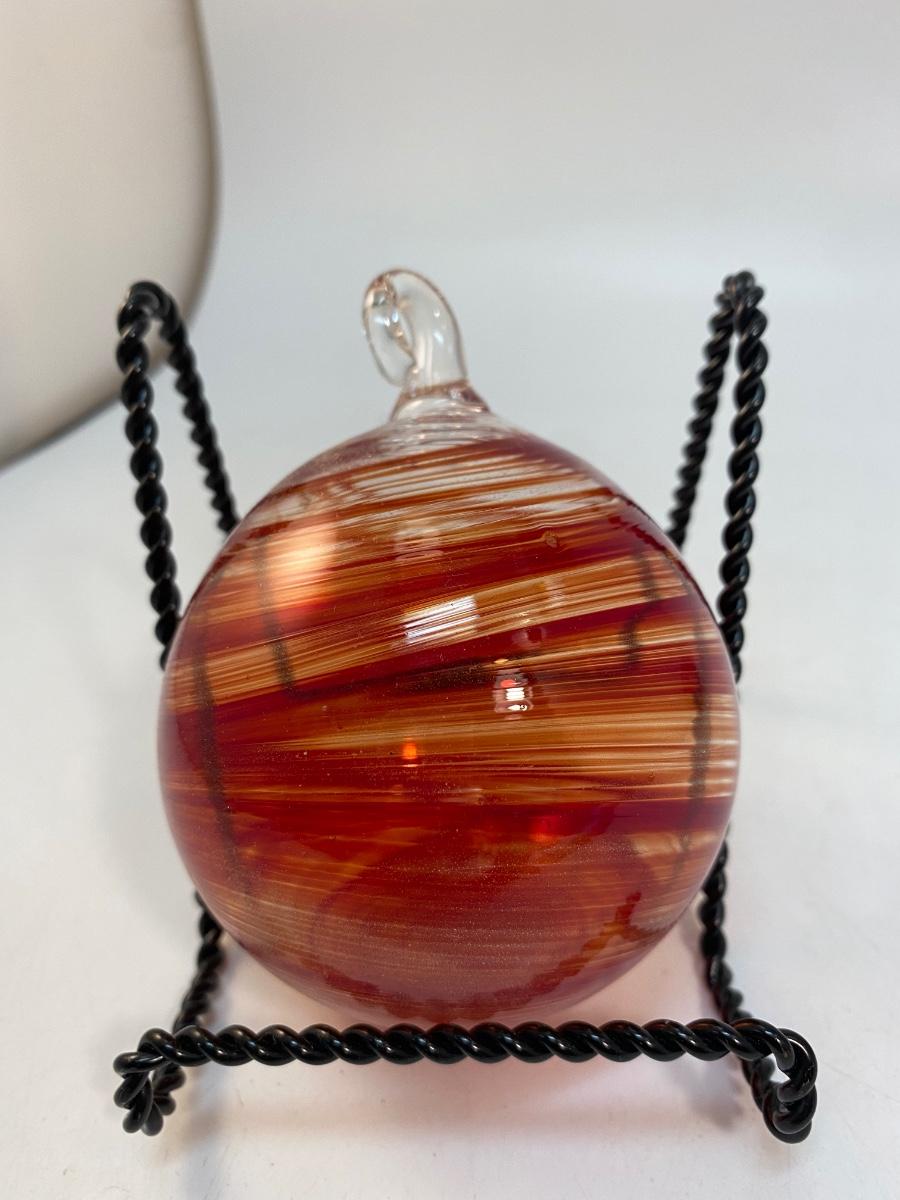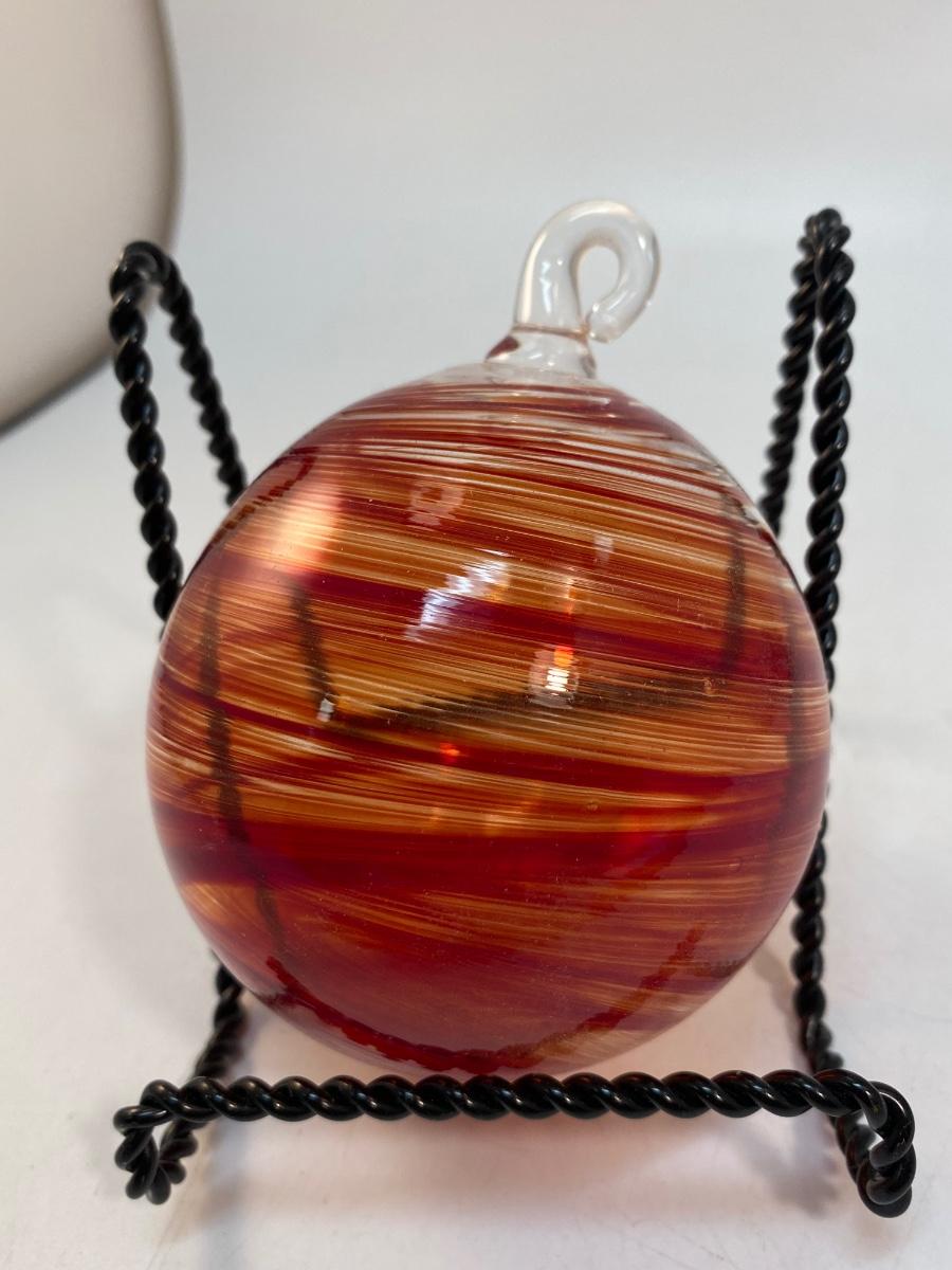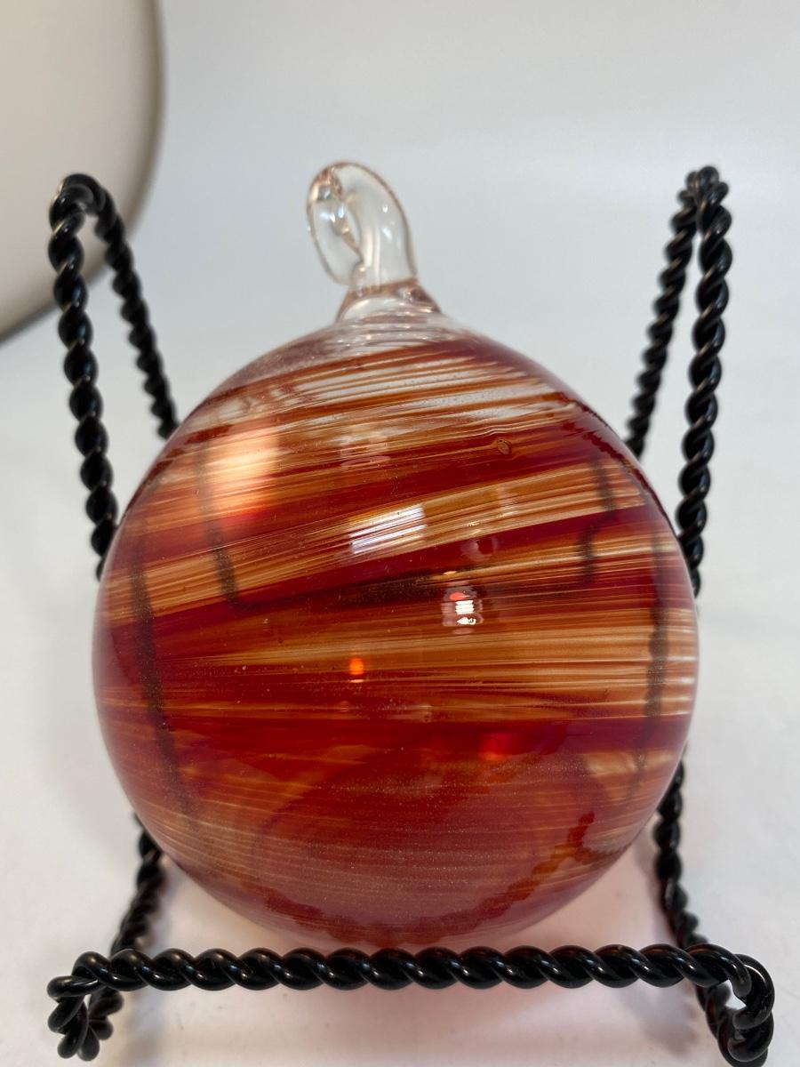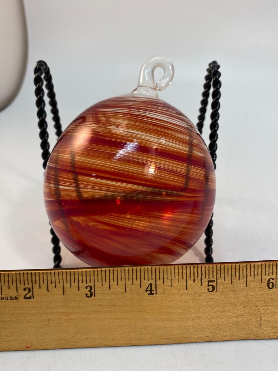 Red Streaked Hand Made Blown Glass Hanging Ornament Orb Suncatcher. In good condition. About 3" size. Unsigned.