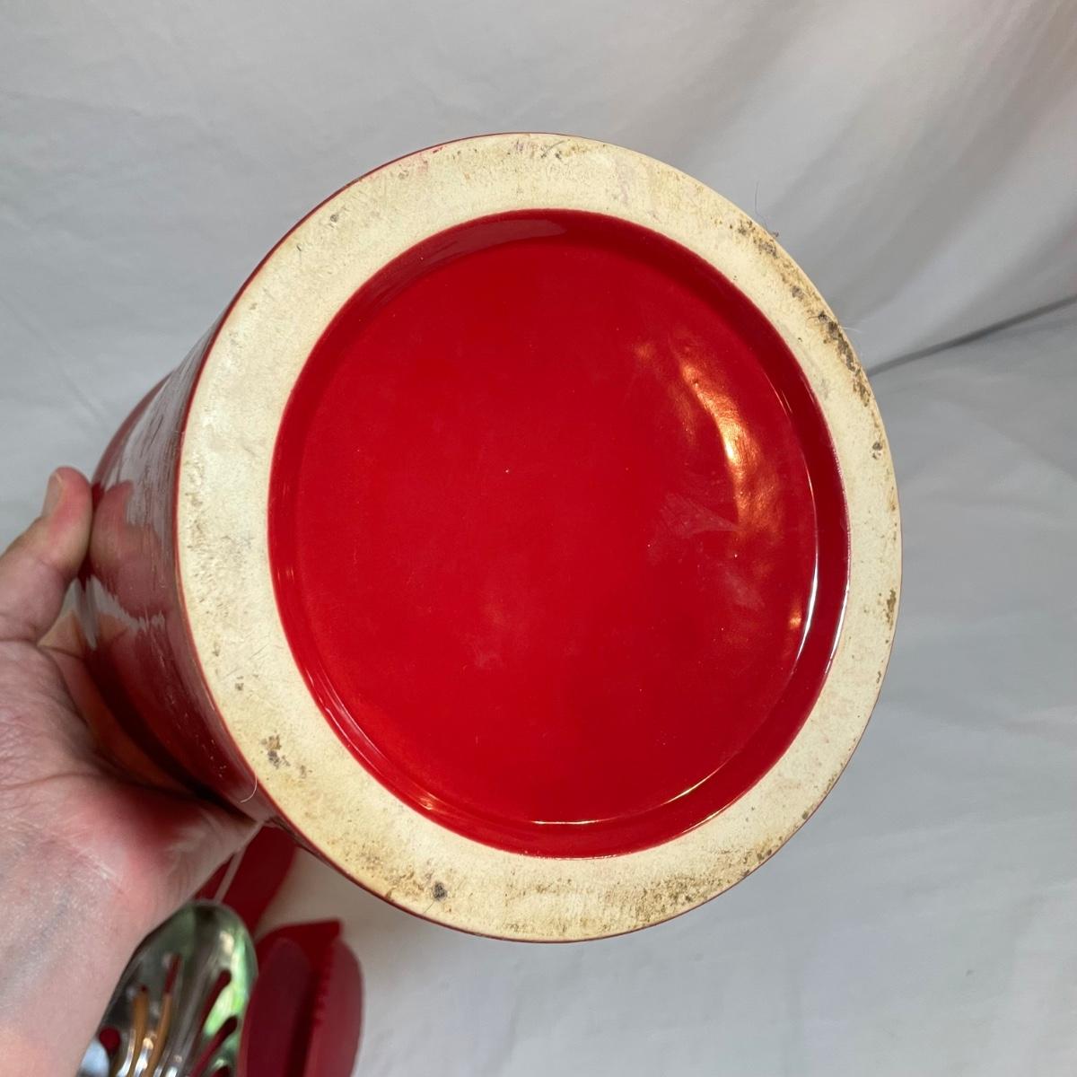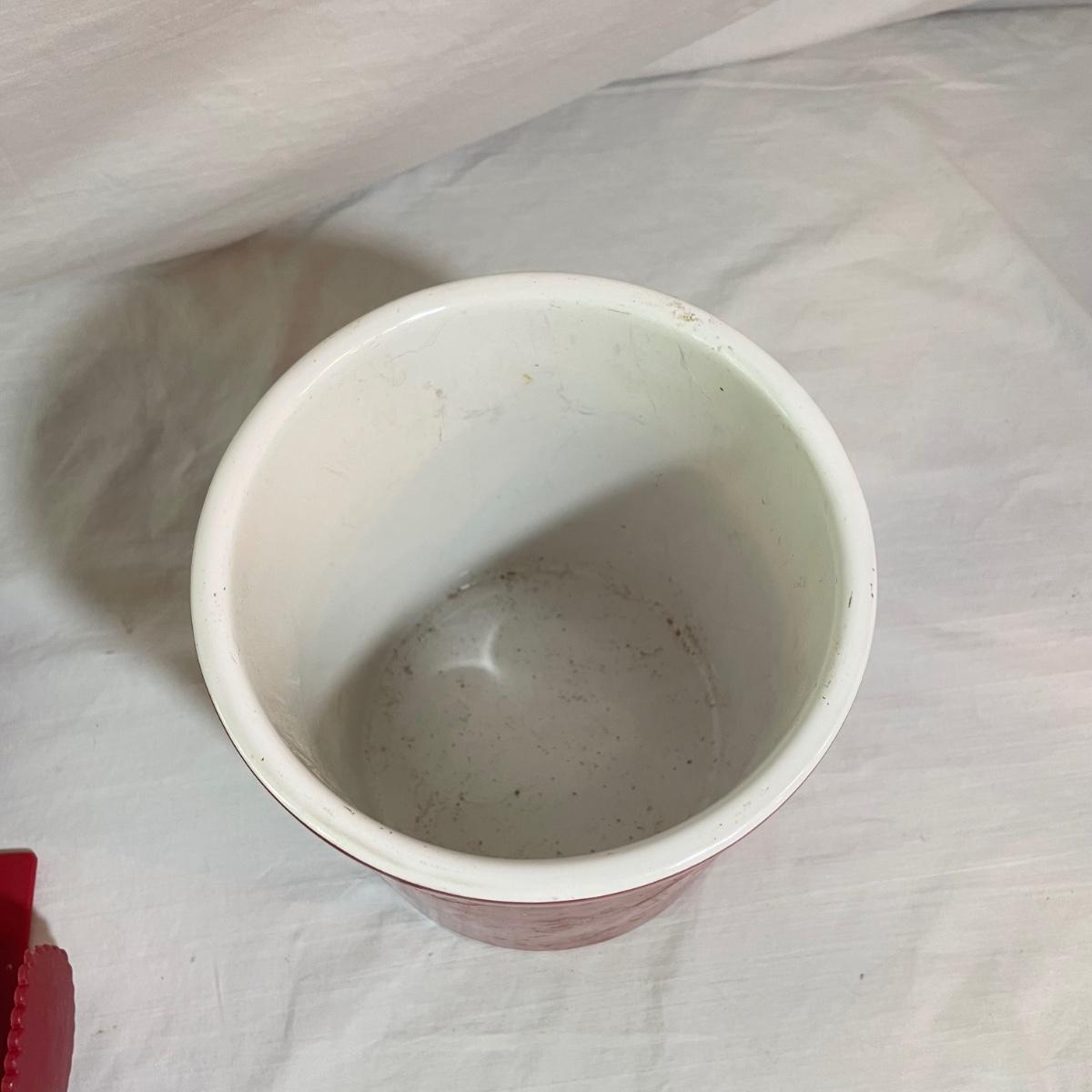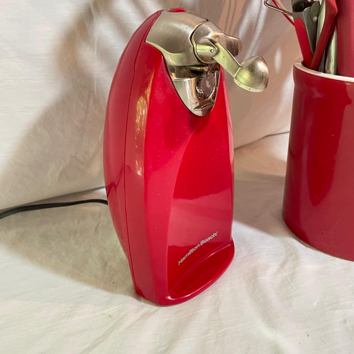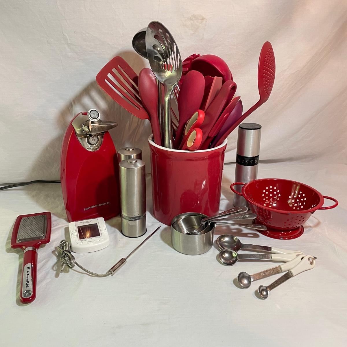 A red themed kitchen lot includes multiple utensils including a few by KitchenAid and Cuisinart. Utensils fit snuggly in a red and white ceramic crock that measures 6.5”D x 7”H. Lot also includes an electric can opener with bottle opener by Hamilton Beach, an olive oil spritzer, a set of heavy salt and pepper shakers and a magnetic battery operated meat thermometer. Both electric items powered on. The longest utensils are a little over 13”. See images. Shipping available.