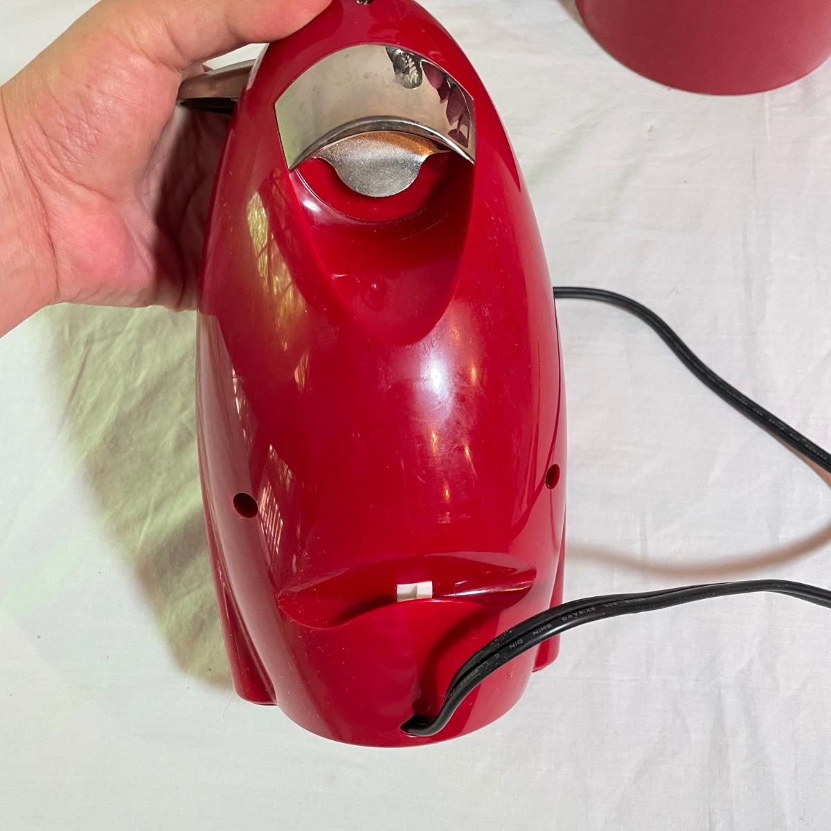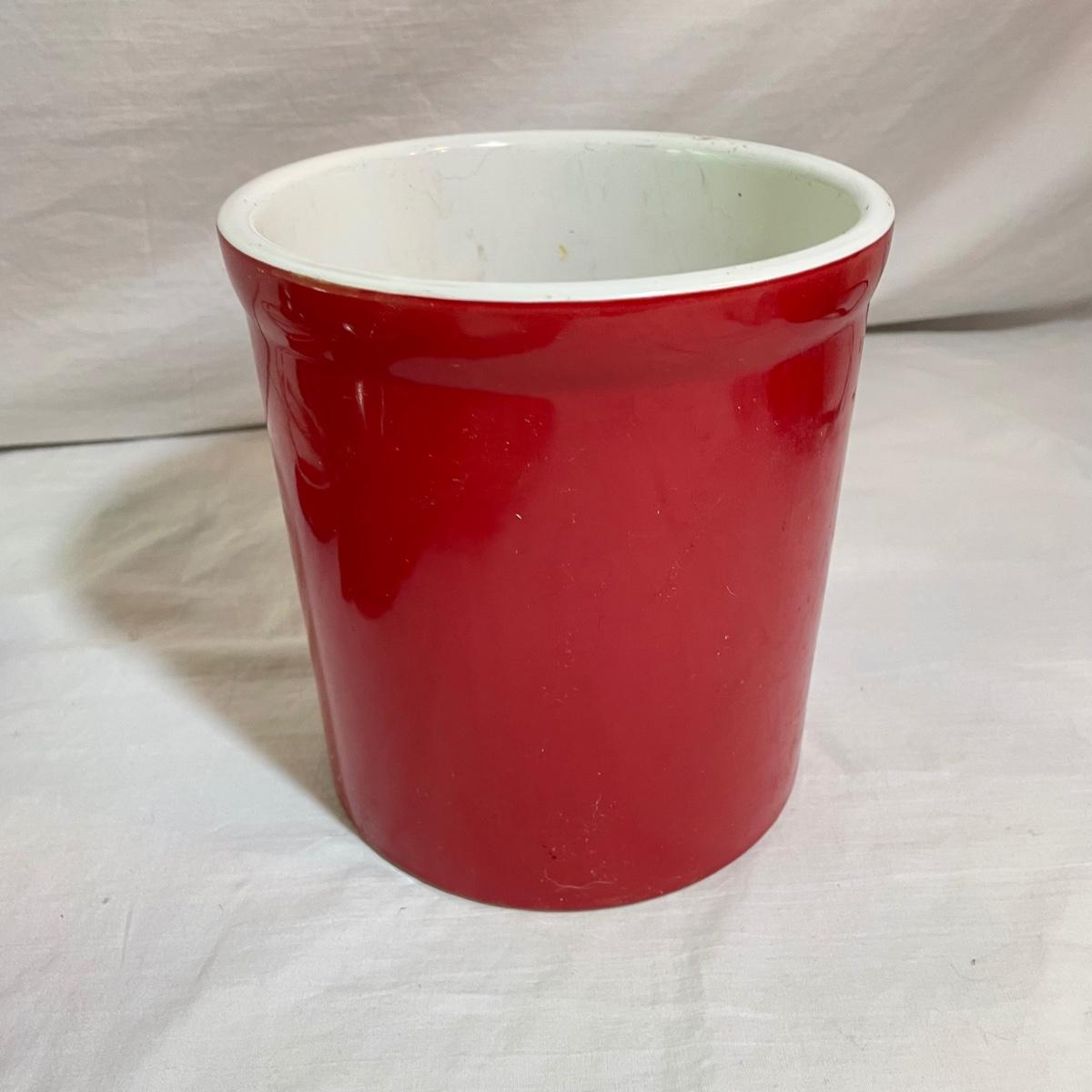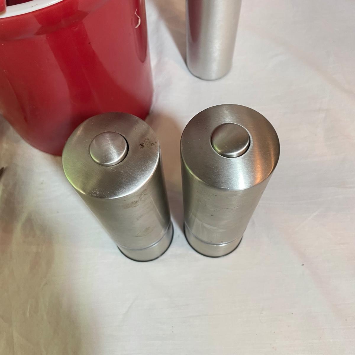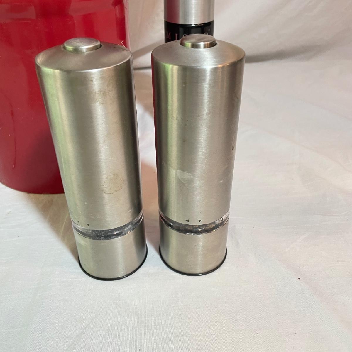 A red themed kitchen lot includes multiple utensils including a few by KitchenAid and Cuisinart. Utensils fit snuggly in a red and white ceramic crock that measures 6.5”D x 7”H. Lot also includes an electric can opener with bottle opener by Hamilton Beach, an olive oil spritzer, a set of heavy salt and pepper shakers and a magnetic battery operated meat thermometer. Both electric items powered on. The longest utensils are a little over 13”. See images. Shipping available.