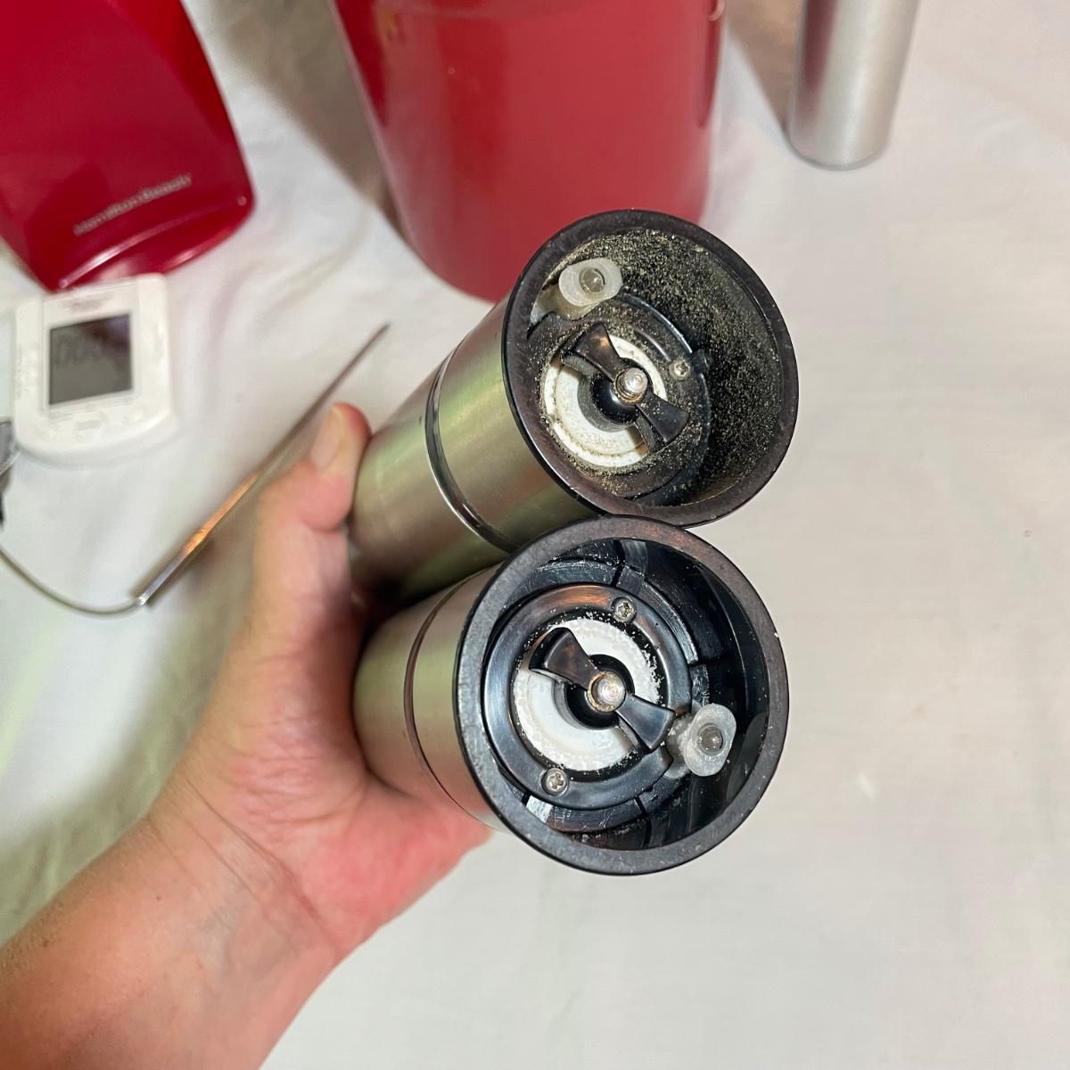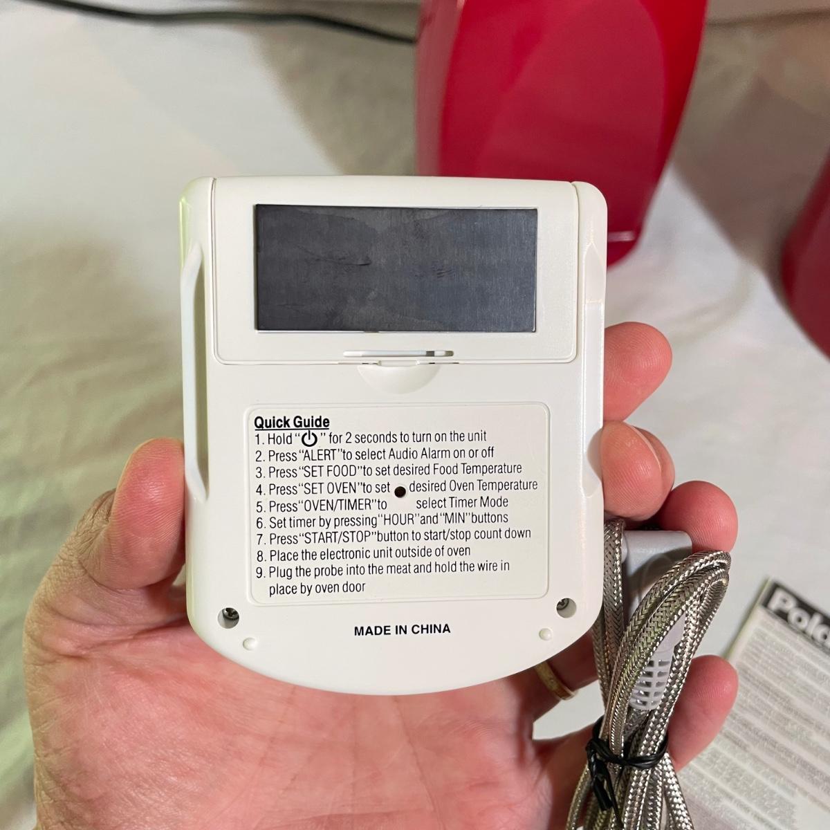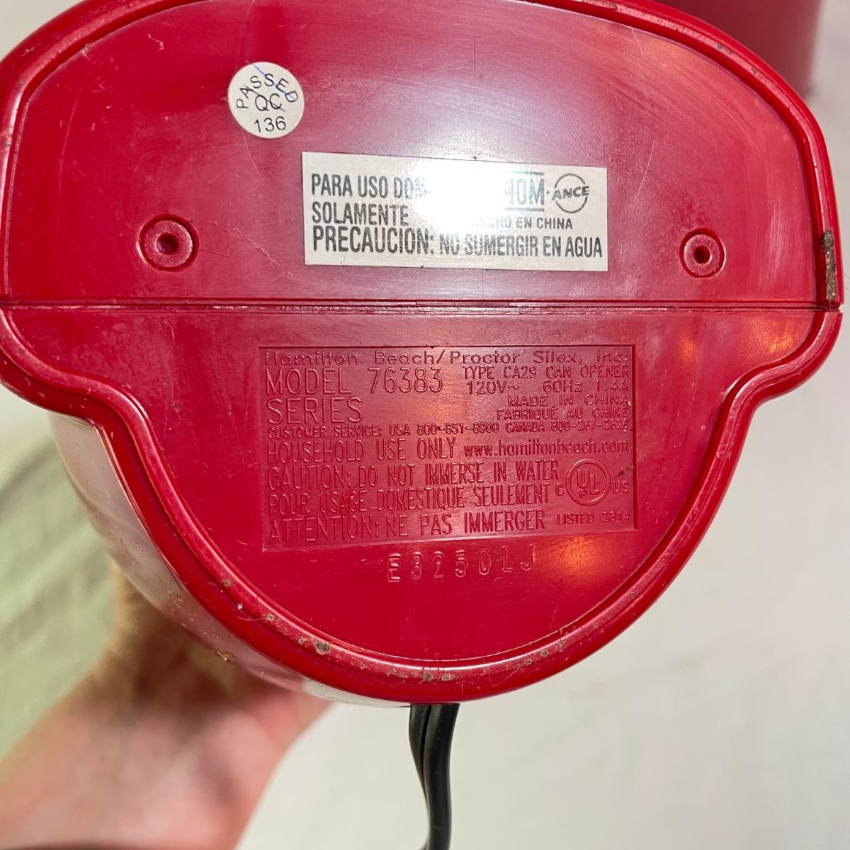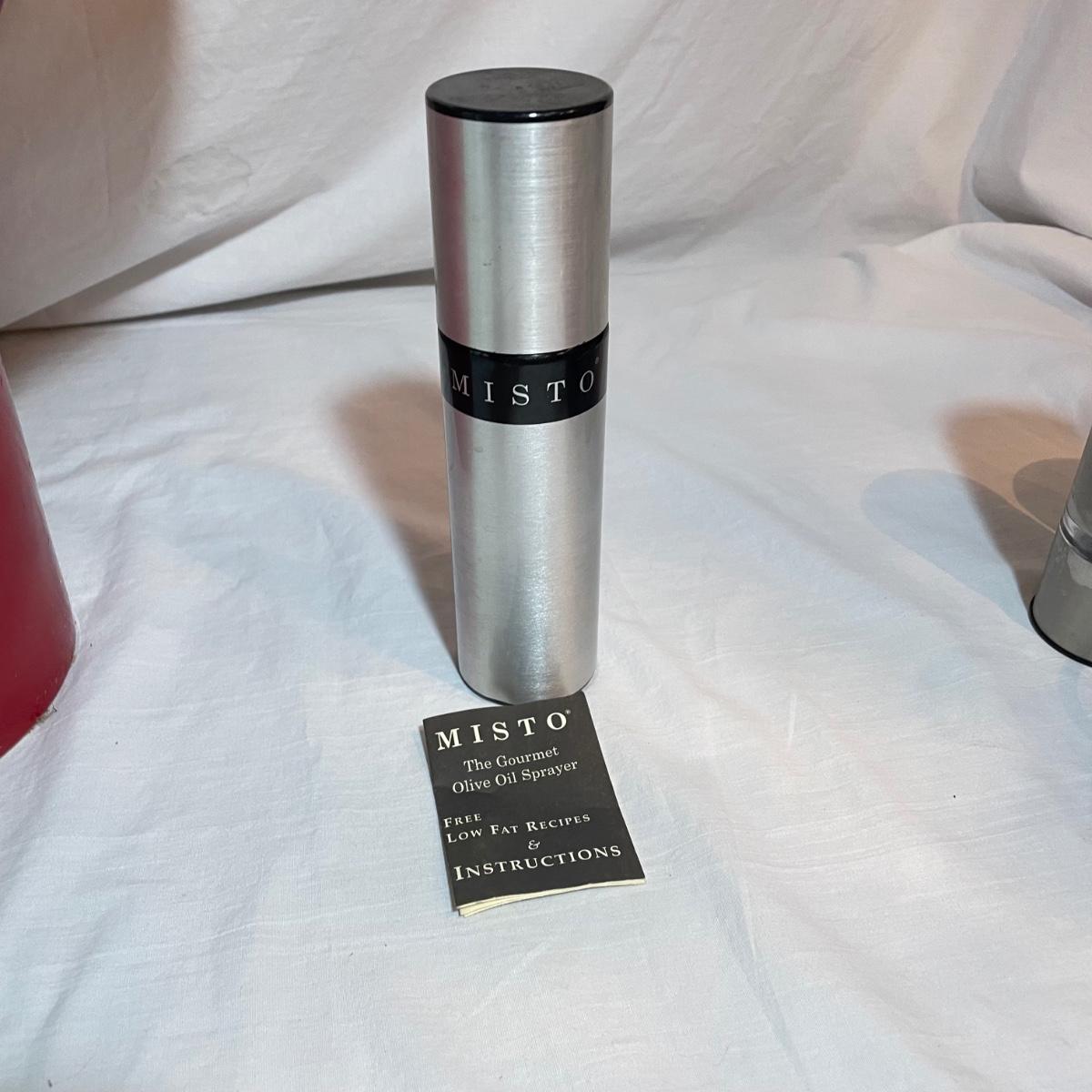 A red themed kitchen lot includes multiple utensils including a few by KitchenAid and Cuisinart. Utensils fit snuggly in a red and white ceramic crock that measures 6.5”D x 7”H. Lot also includes an electric can opener with bottle opener by Hamilton Beach, an olive oil spritzer, a set of heavy salt and pepper shakers and a magnetic battery operated meat thermometer. Both electric items powered on. The longest utensils are a little over 13”. See images. Shipping available.