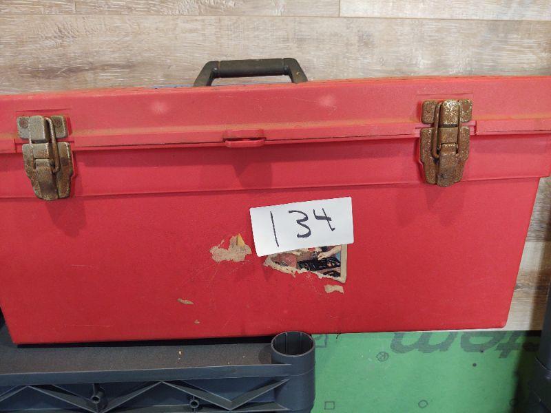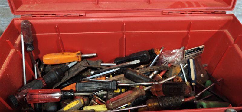lot 134 -Red tool box of 50+ assorted screwdrivers,etc.