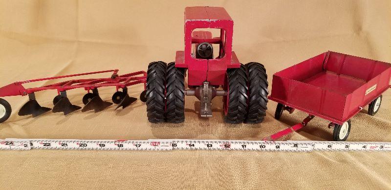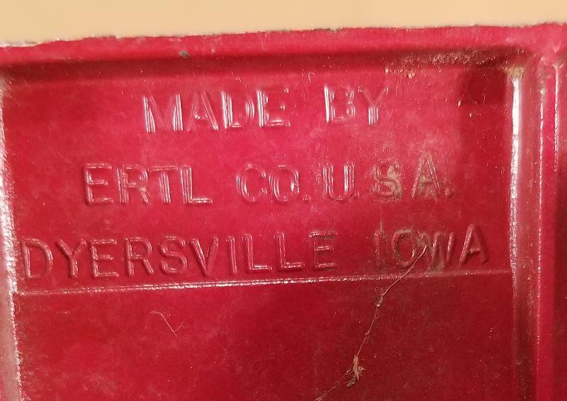 This lot includes a red International Harvester Trailer. Marked made in USA by Ertl Company, Dyersville, Iowa, USA. Trailer measures 8-inches wide X 4-inches tall. All metal. And a Die Cast red Plow marked made in USA by Ertl Company, Dyersville, Iowa