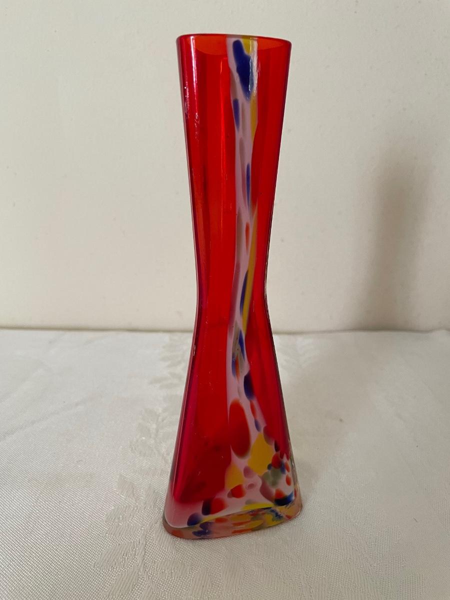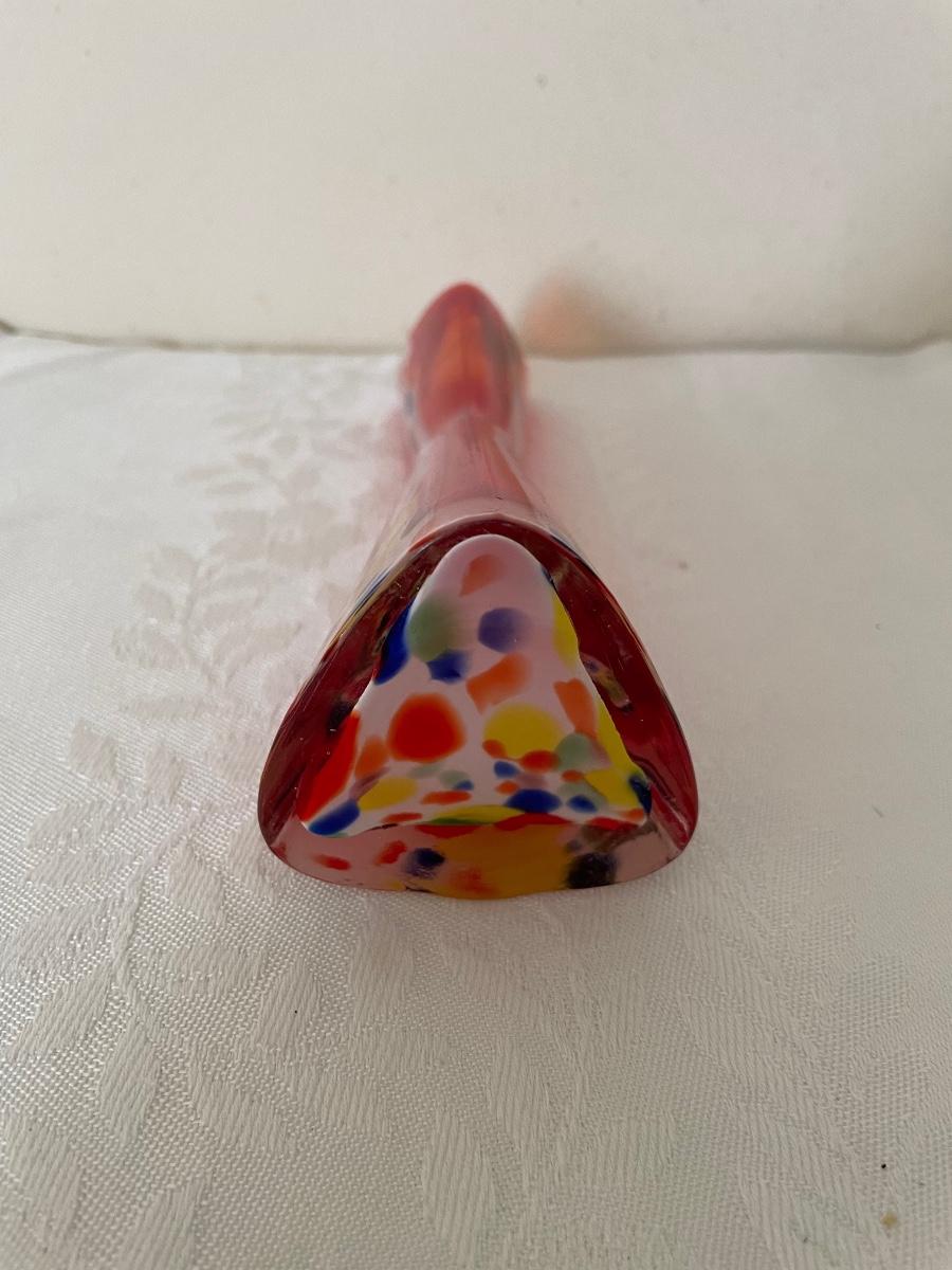 Red Triangular Art Glass Vase. Multi-color frit