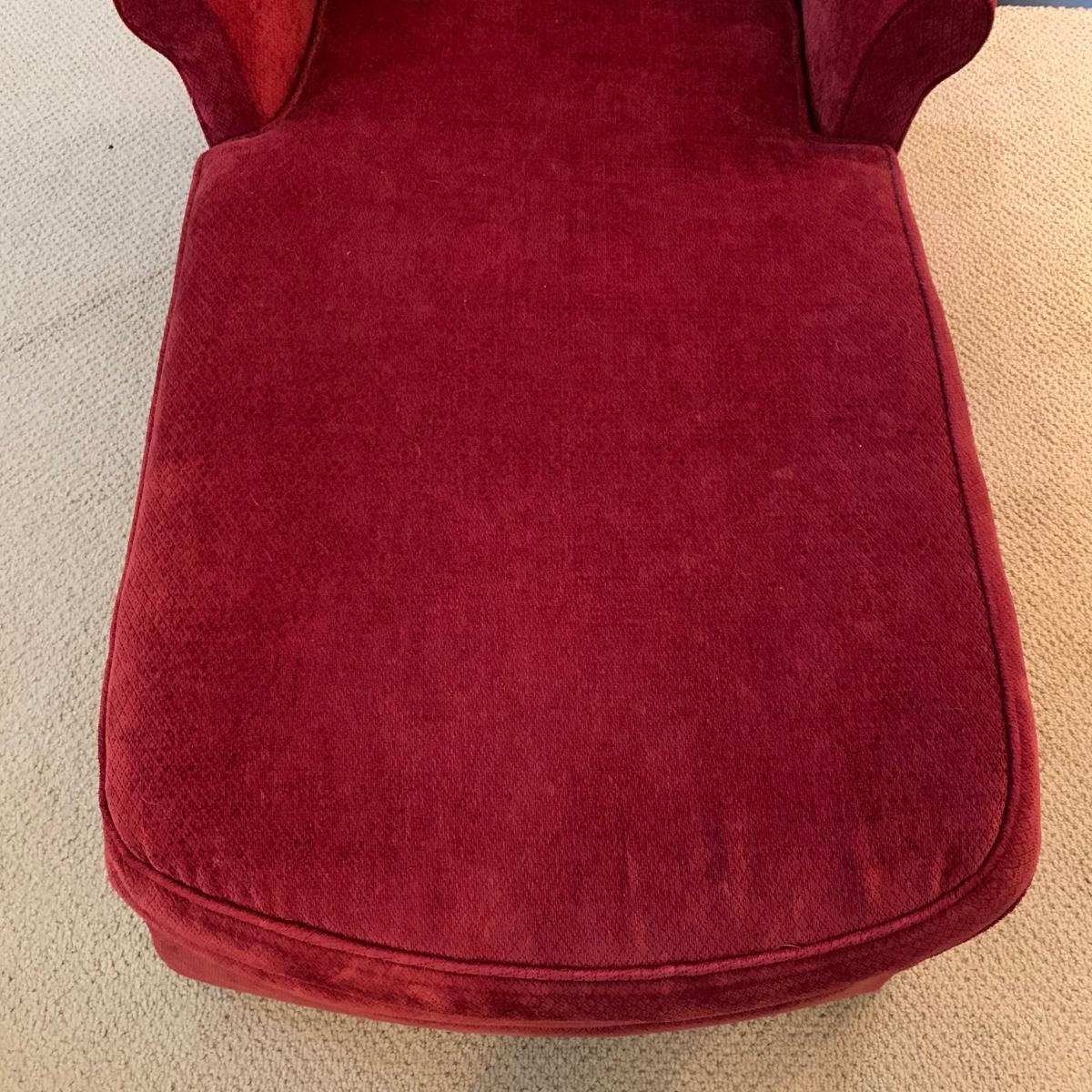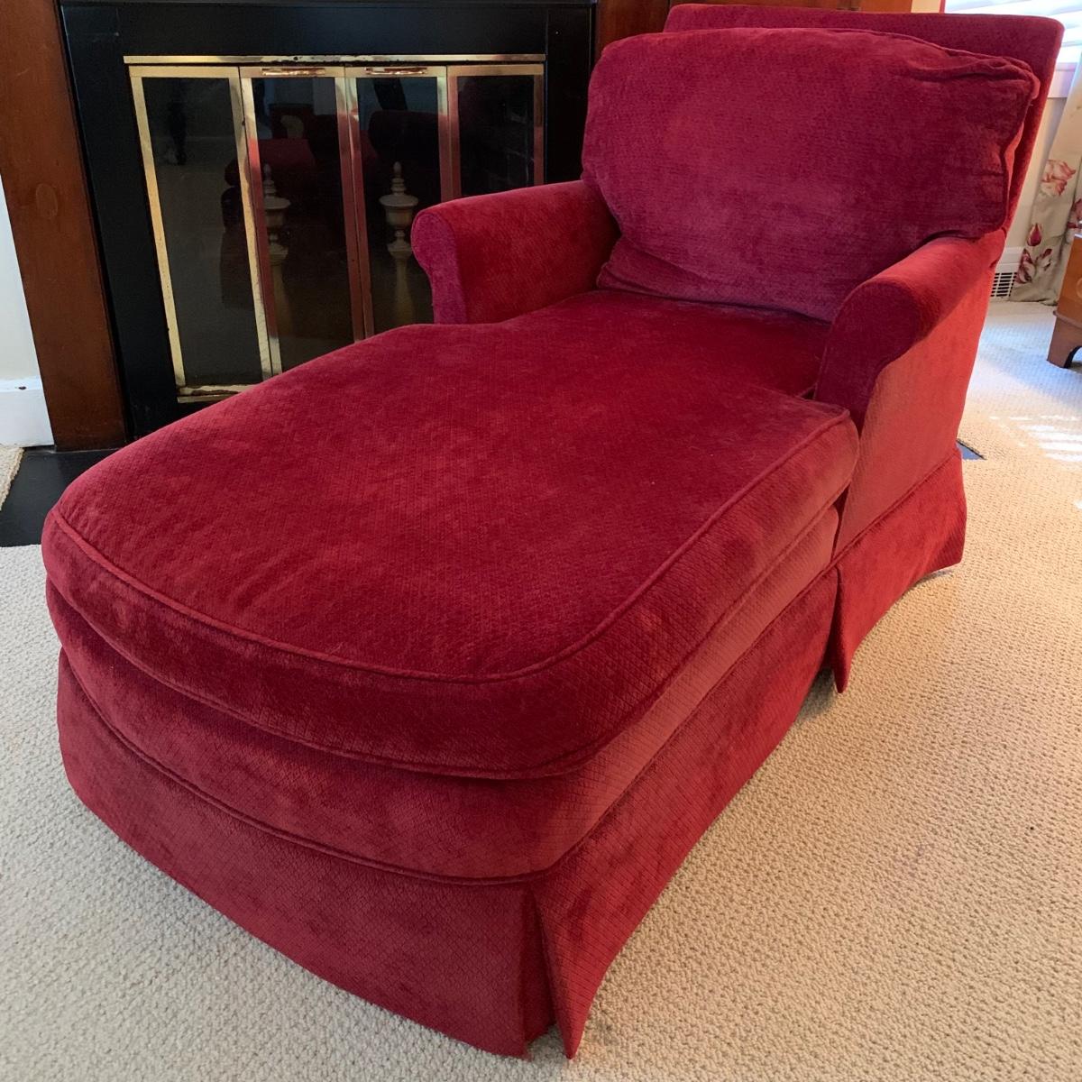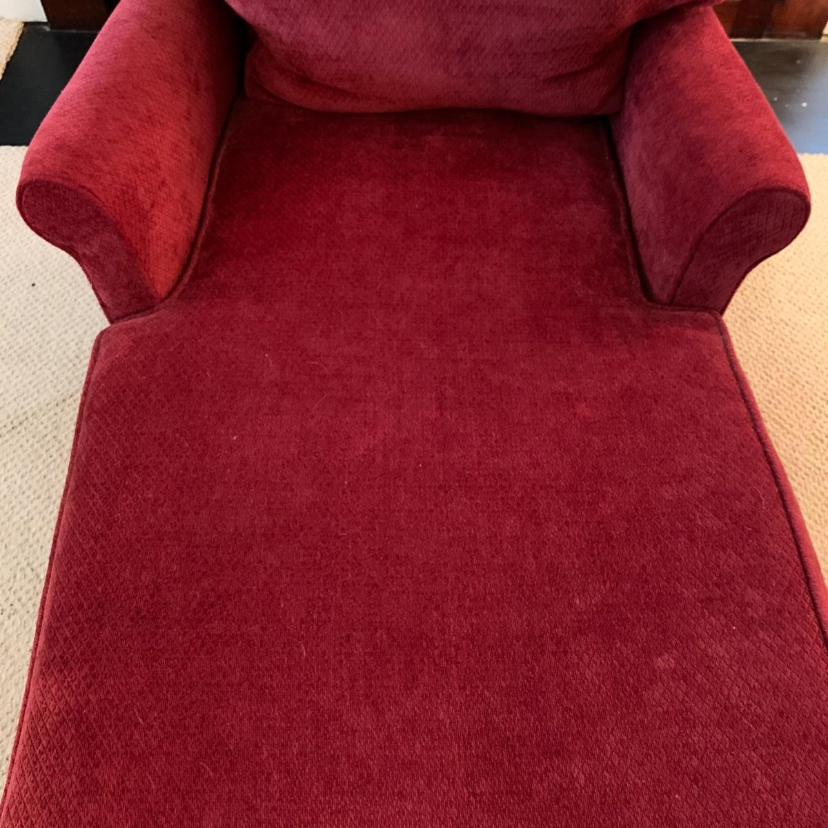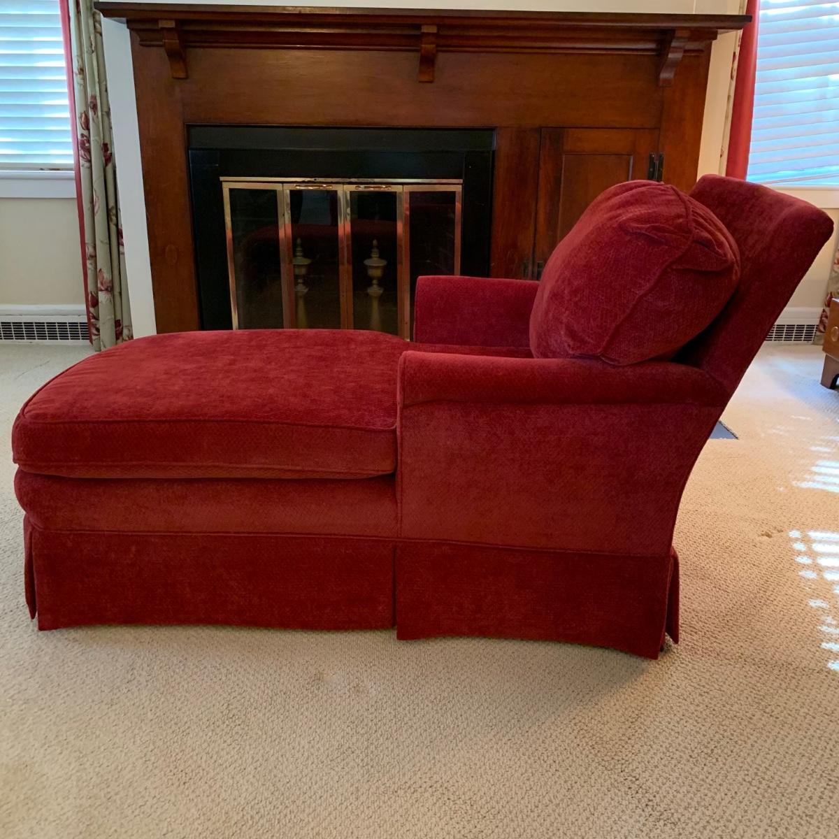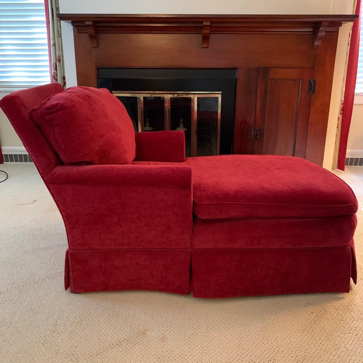Red upholstered chaise lounge with two cushions and wooden feet. Chaise measures approximately, 30” x 59” x 47”H with a seat height of 17.5”. Please see photos for more details.