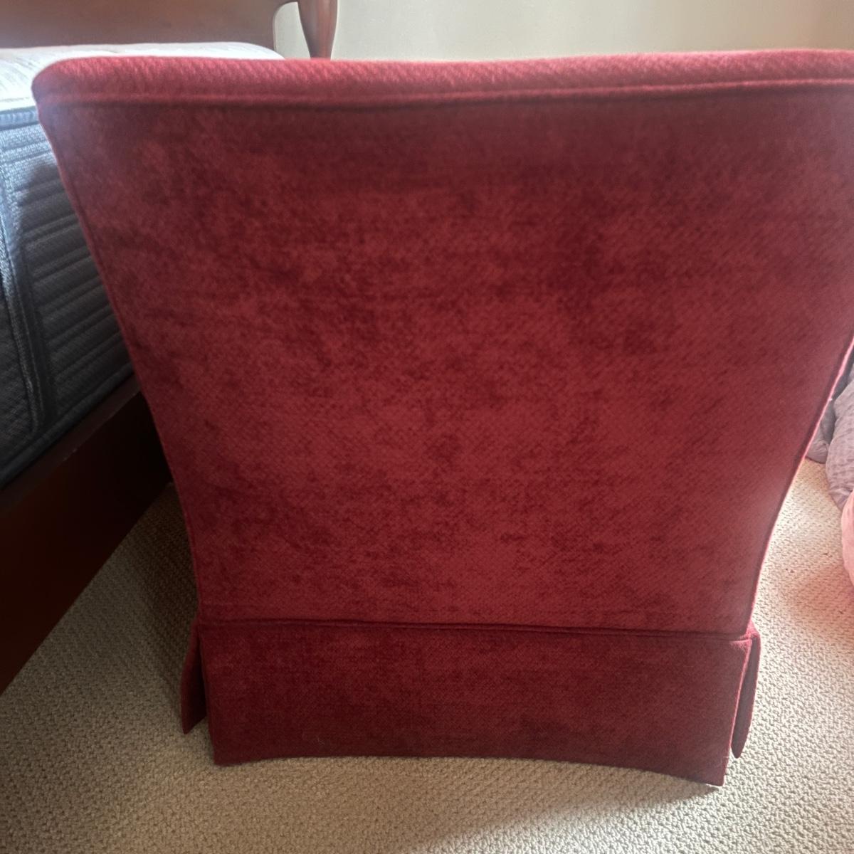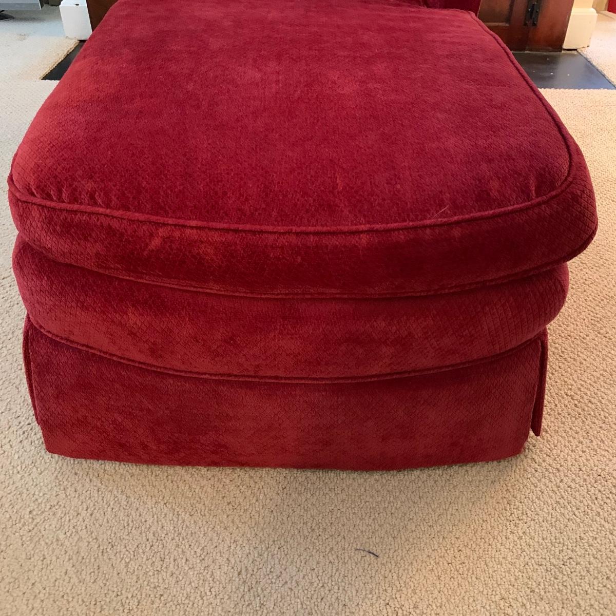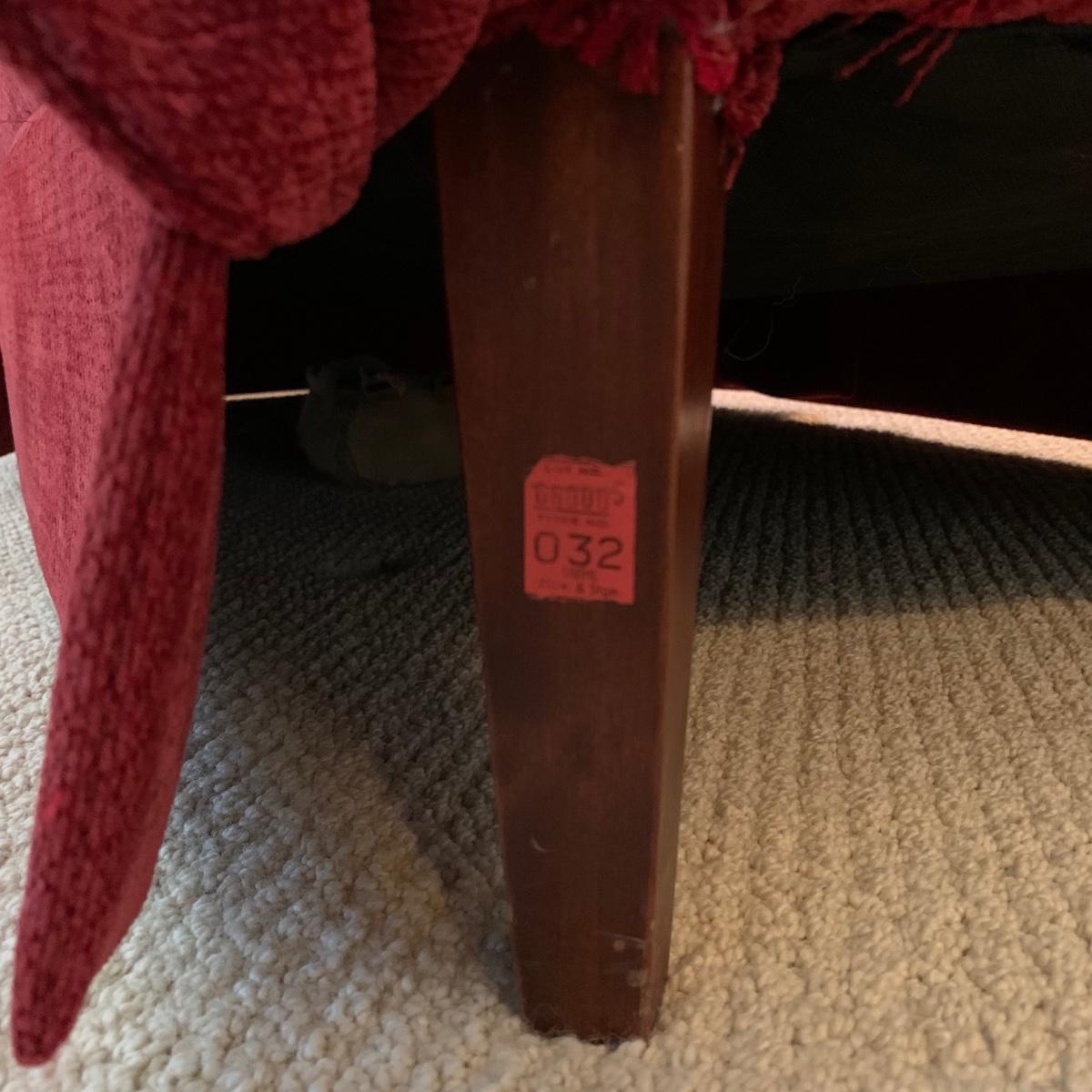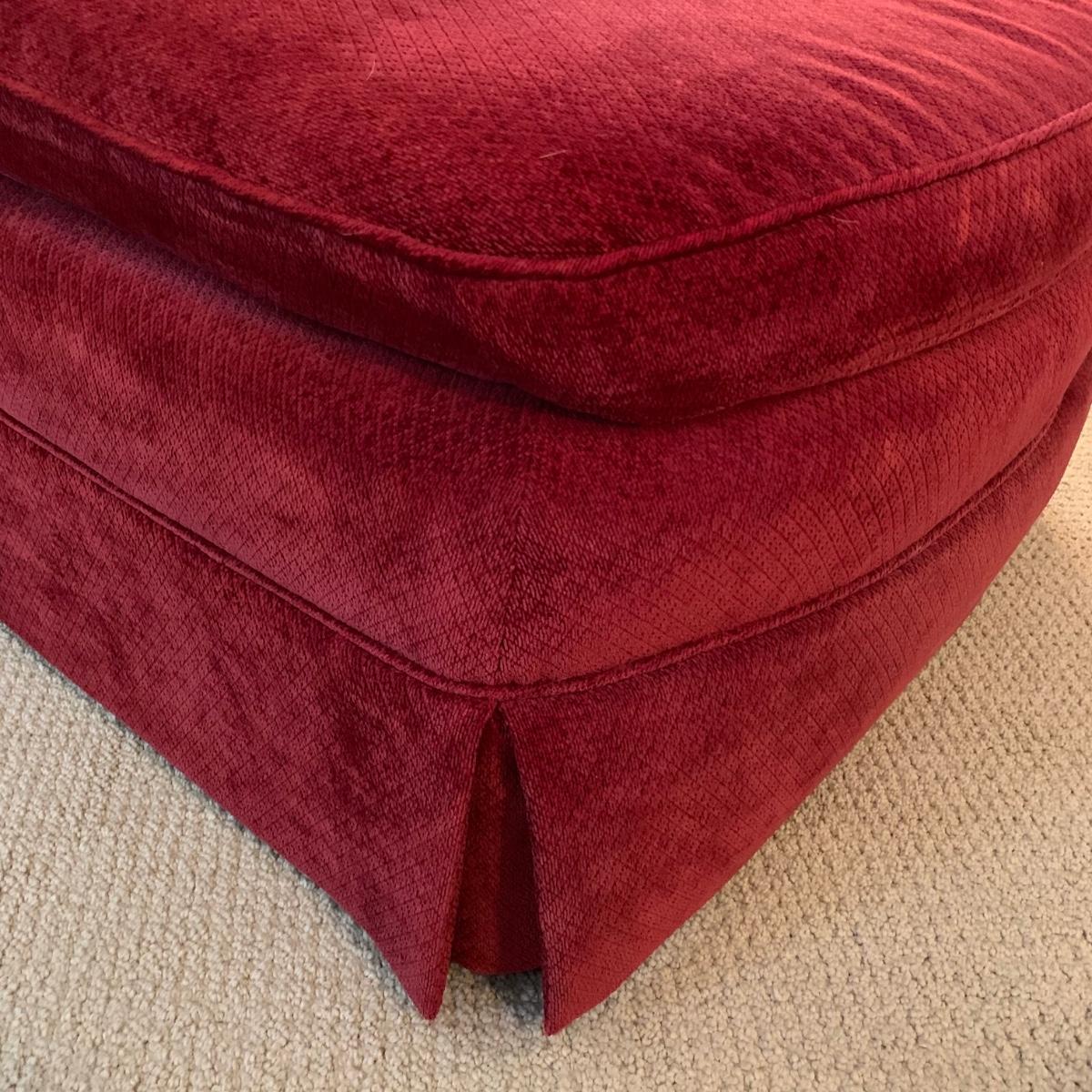 Red upholstered chaise lounge with two cushions and wooden feet. Chaise measures approximately, 30” x 59” x 47”H with a seat height of 17.5”. Please see photos for more details.