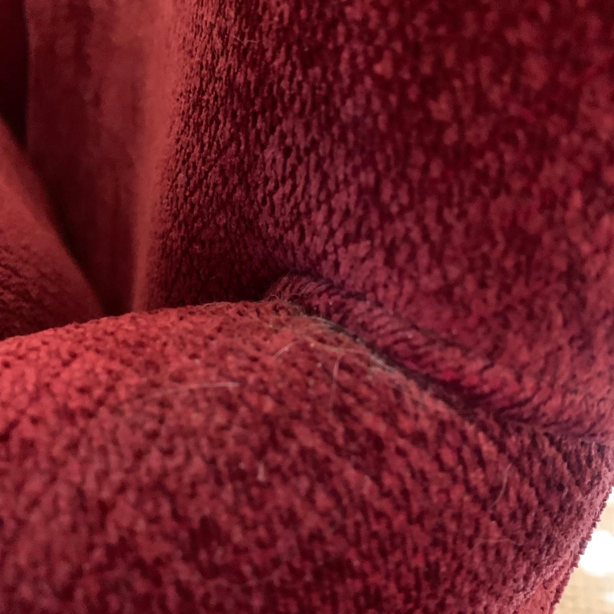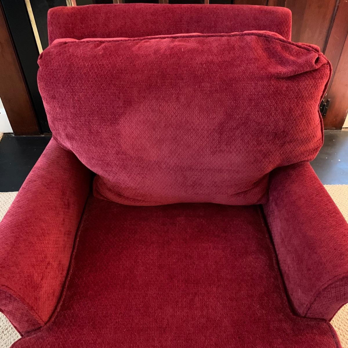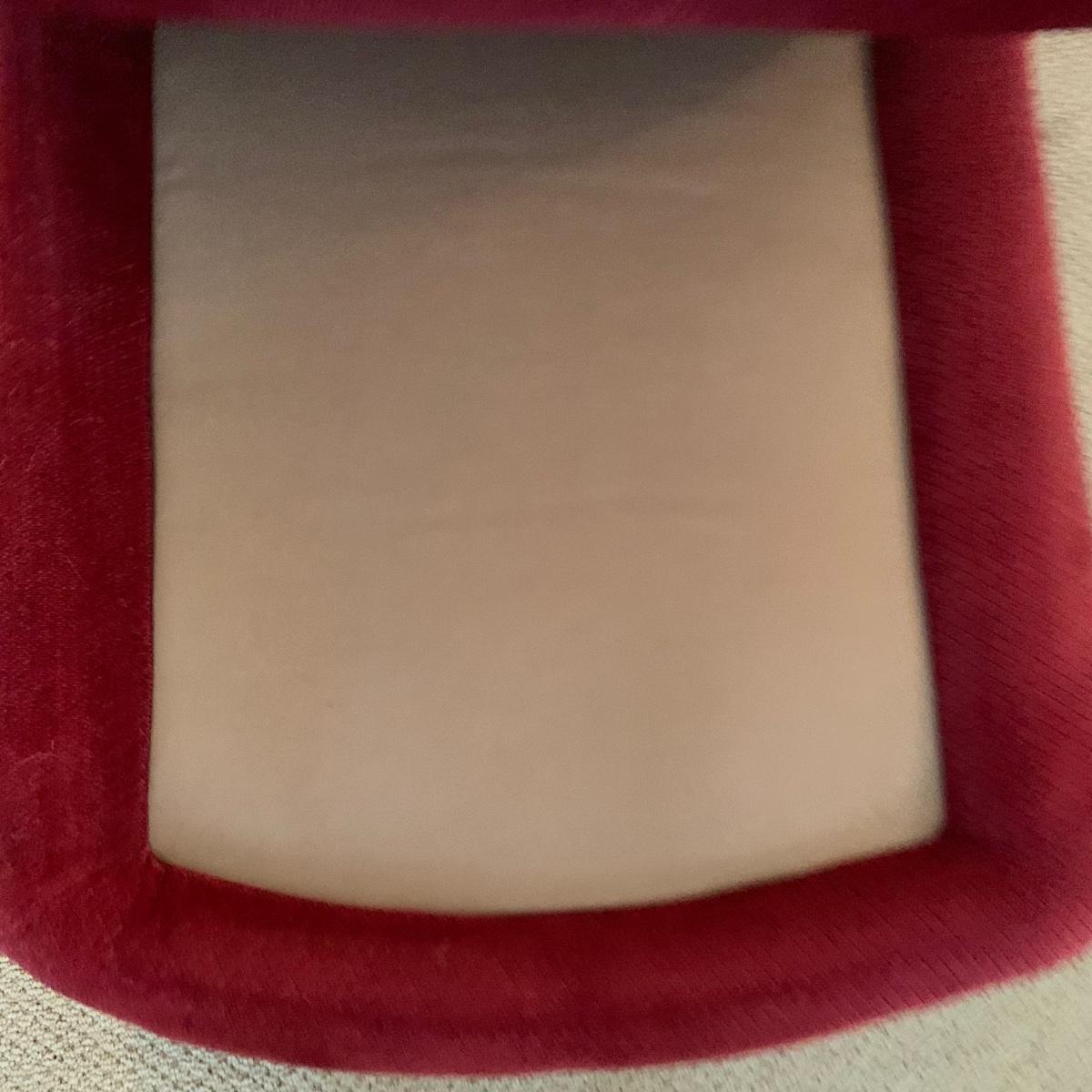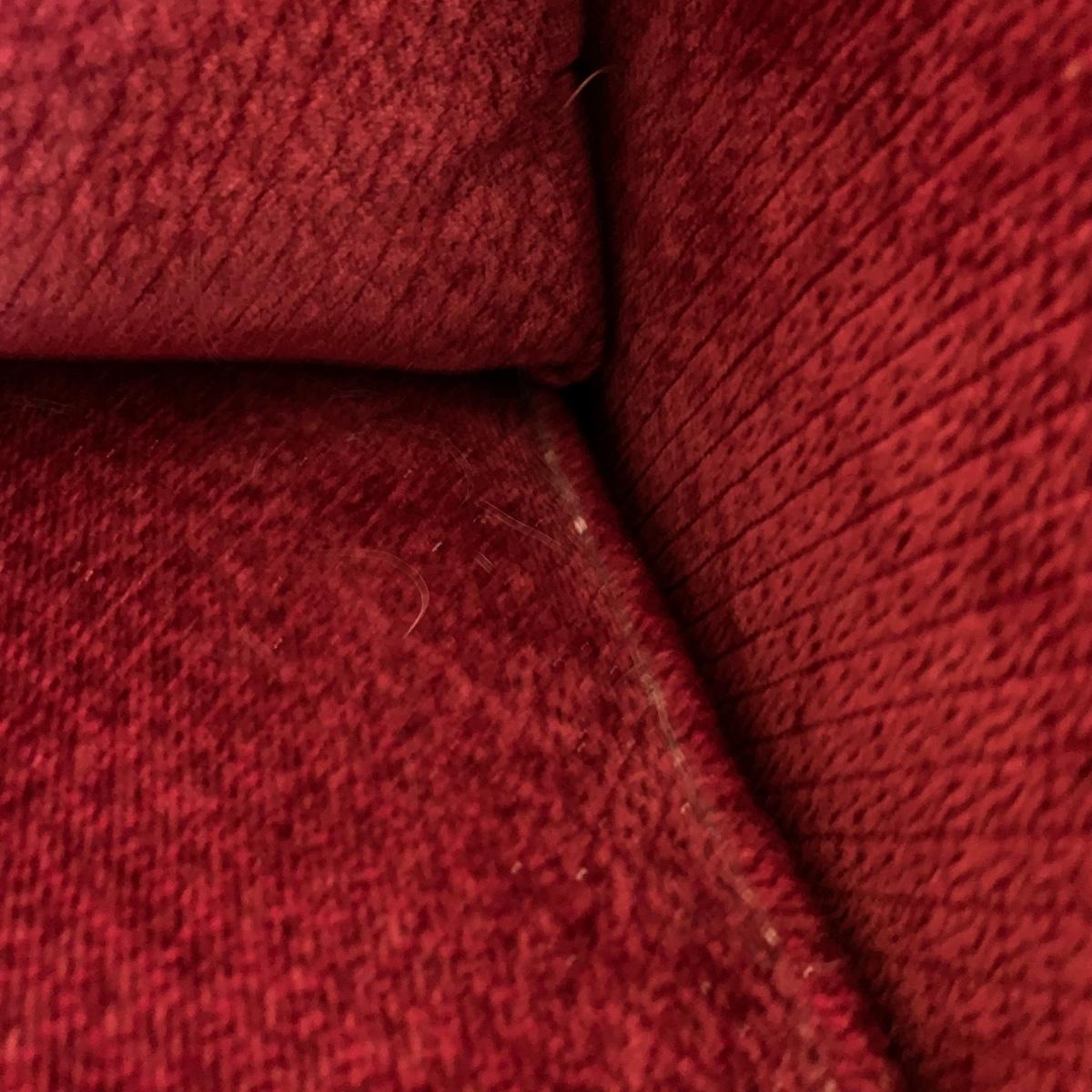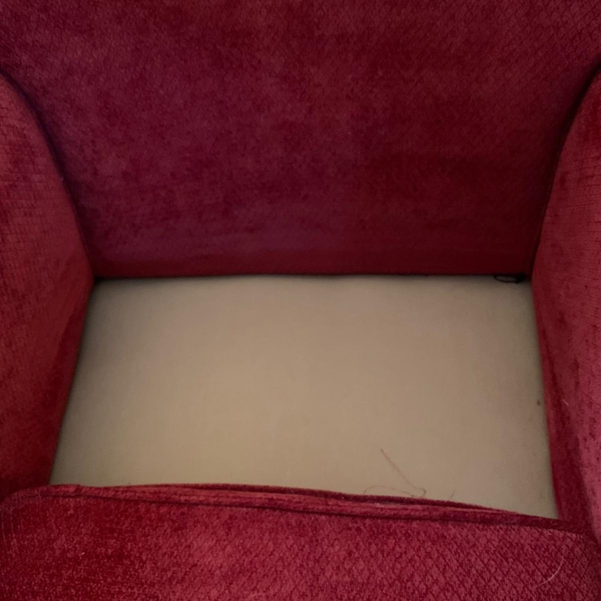 Red upholstered chaise lounge with two cushions and wooden feet. Chaise measures approximately, 30” x 59” x 47”H with a seat height of 17.5”. Please see photos for more details.