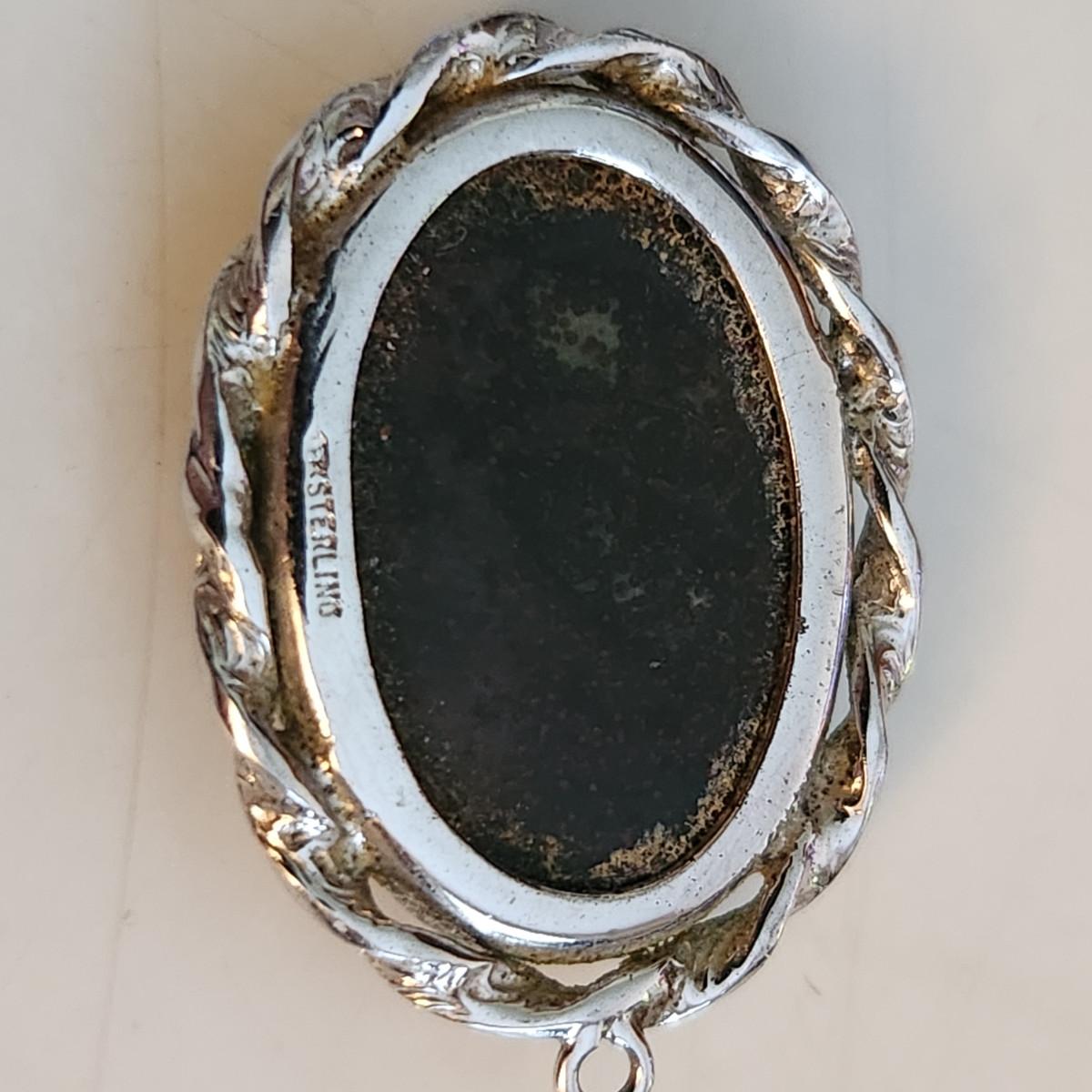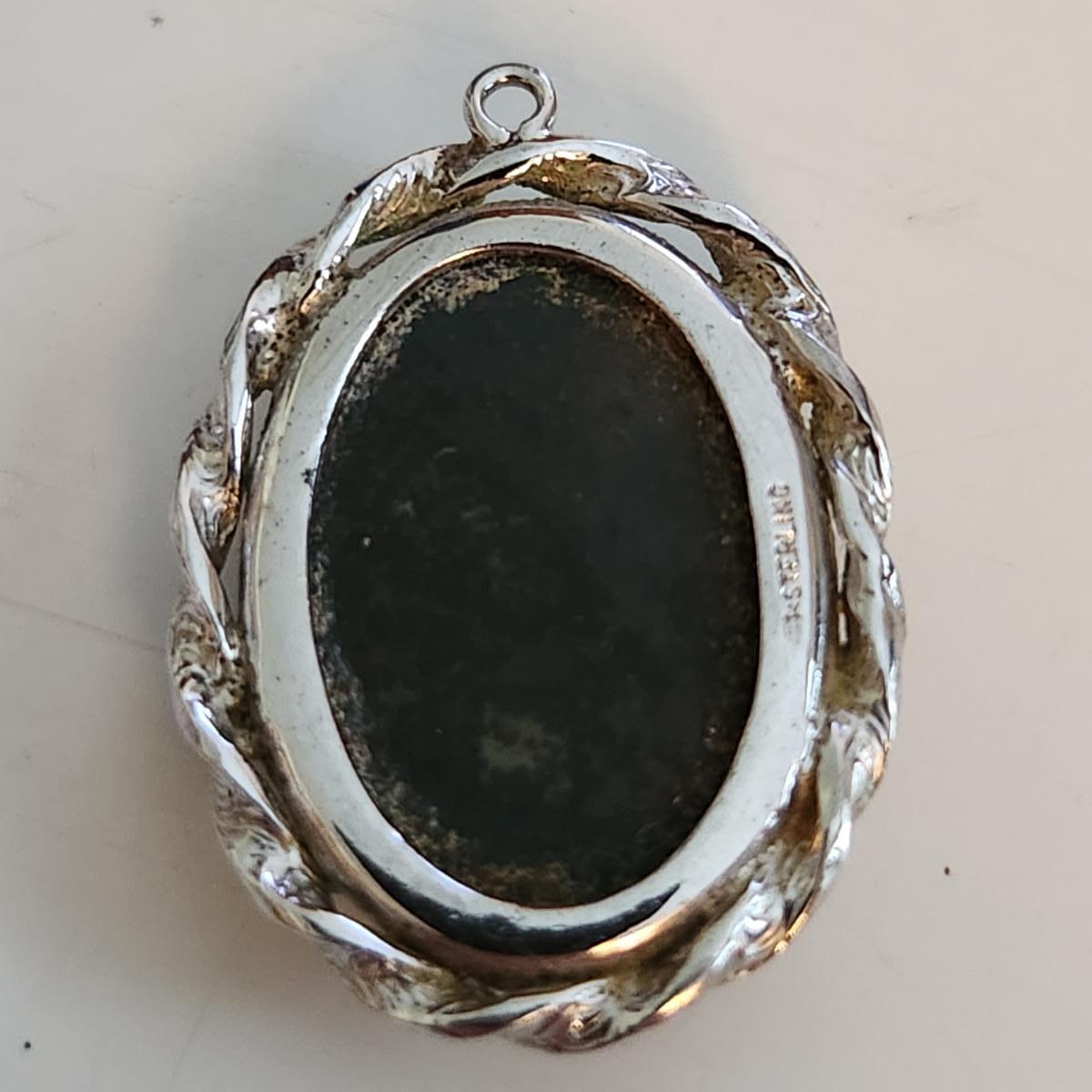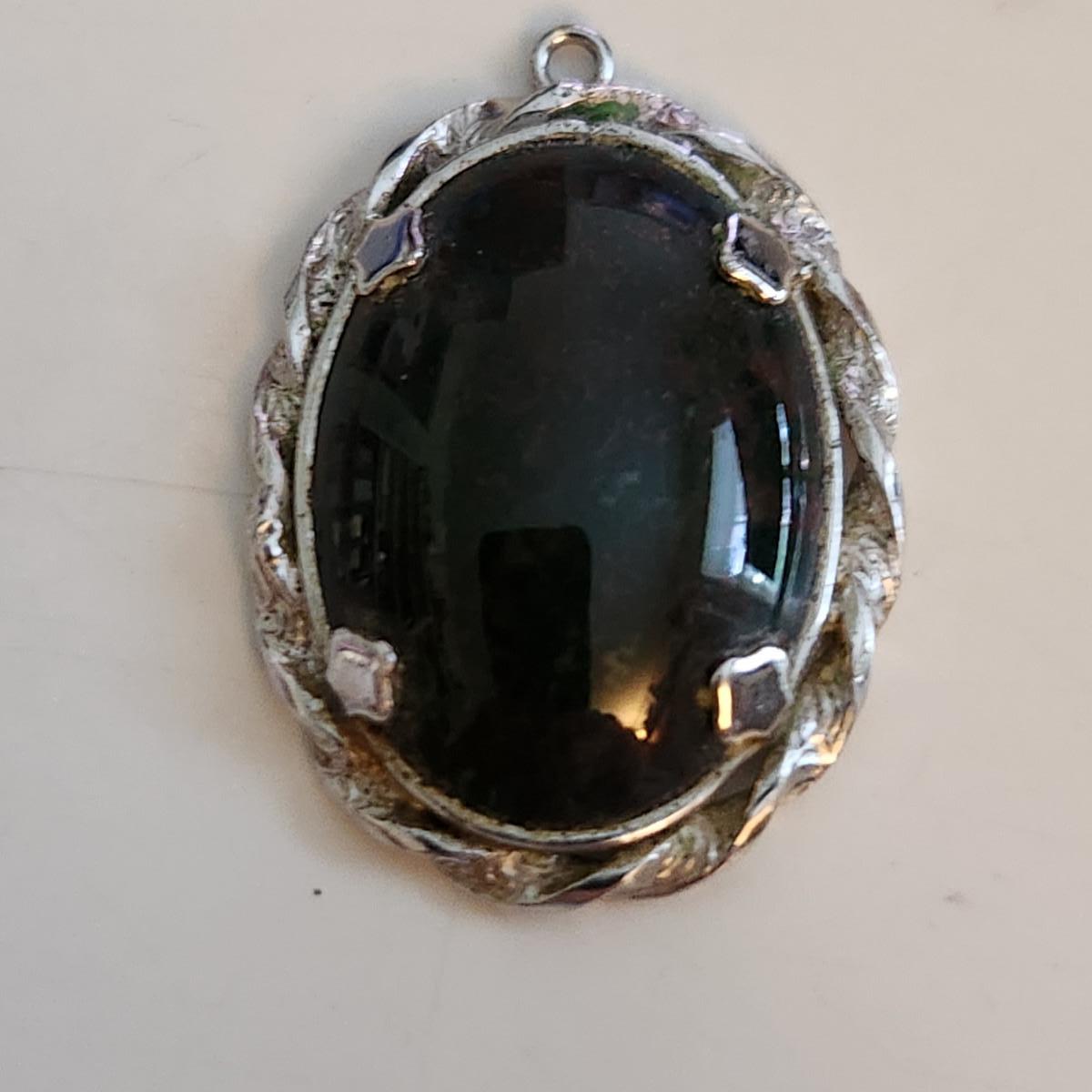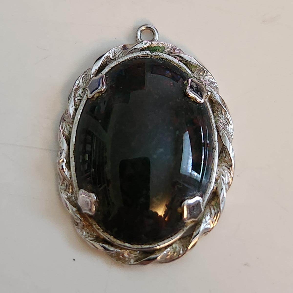 This auction lot is for a Red Vein Jasper Stone Pendant Set in Sterling Silver. Our resident gem person tells us this stone is either Red Vein Jasper or Black Vein Rhodonite - either way it is a nice stone and with its sterling silver case would look stunning on a nice chain hanging around your neck. The pendant measures about 1-inch at its tallest point.