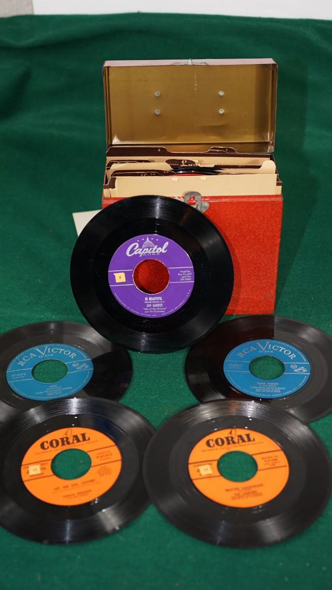 22 45 records to include Jan Garber, Vaughn Moore, Mister Sandman by The Lancers, Jazz Gillman Freddy Martin and his orchestra and more there might be a treasure in this box!