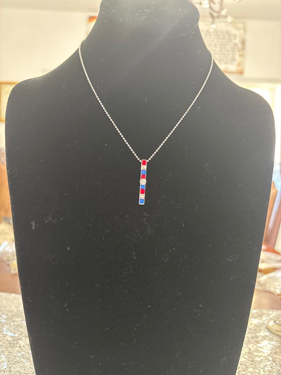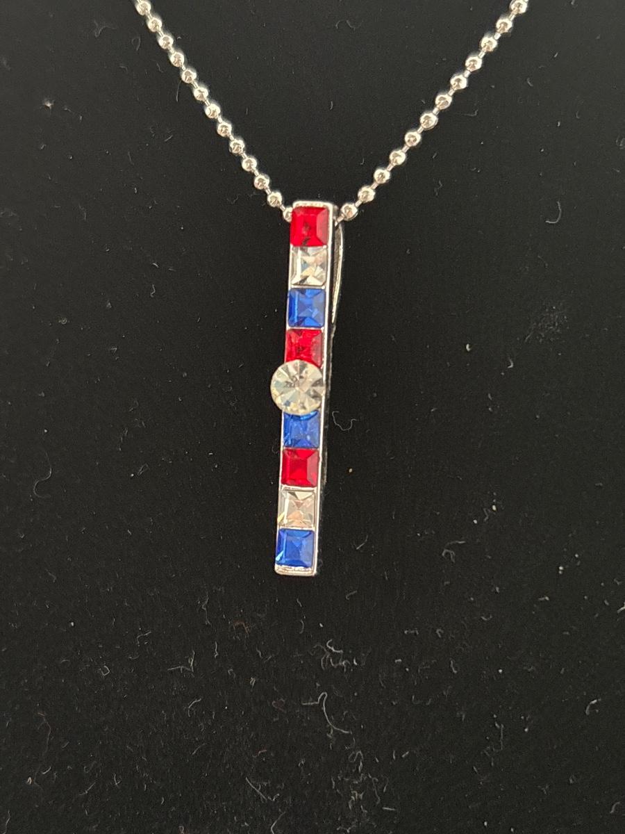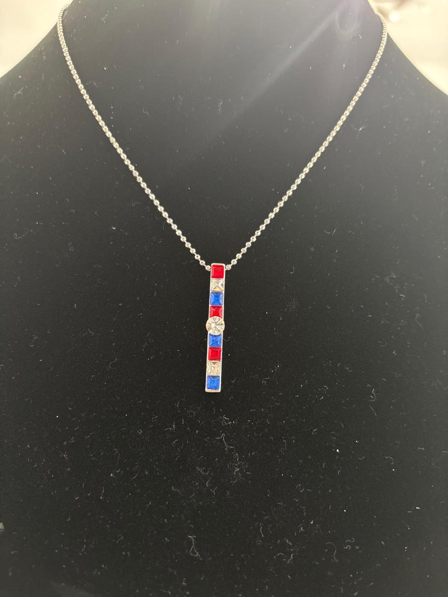 Red white and blue blue crystal pendant, silver tones chain necklace