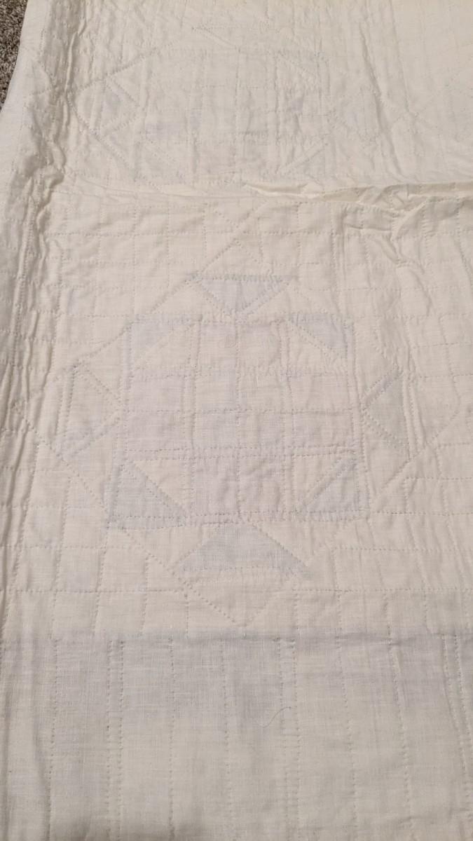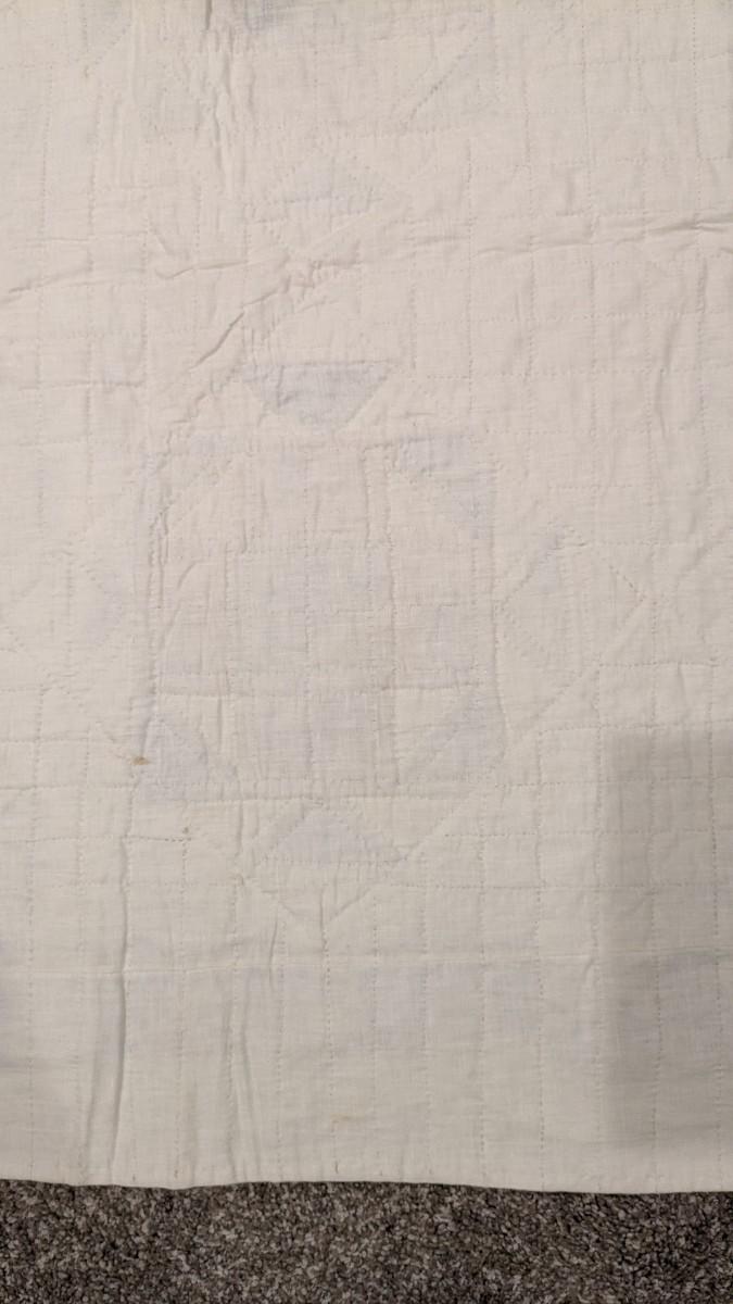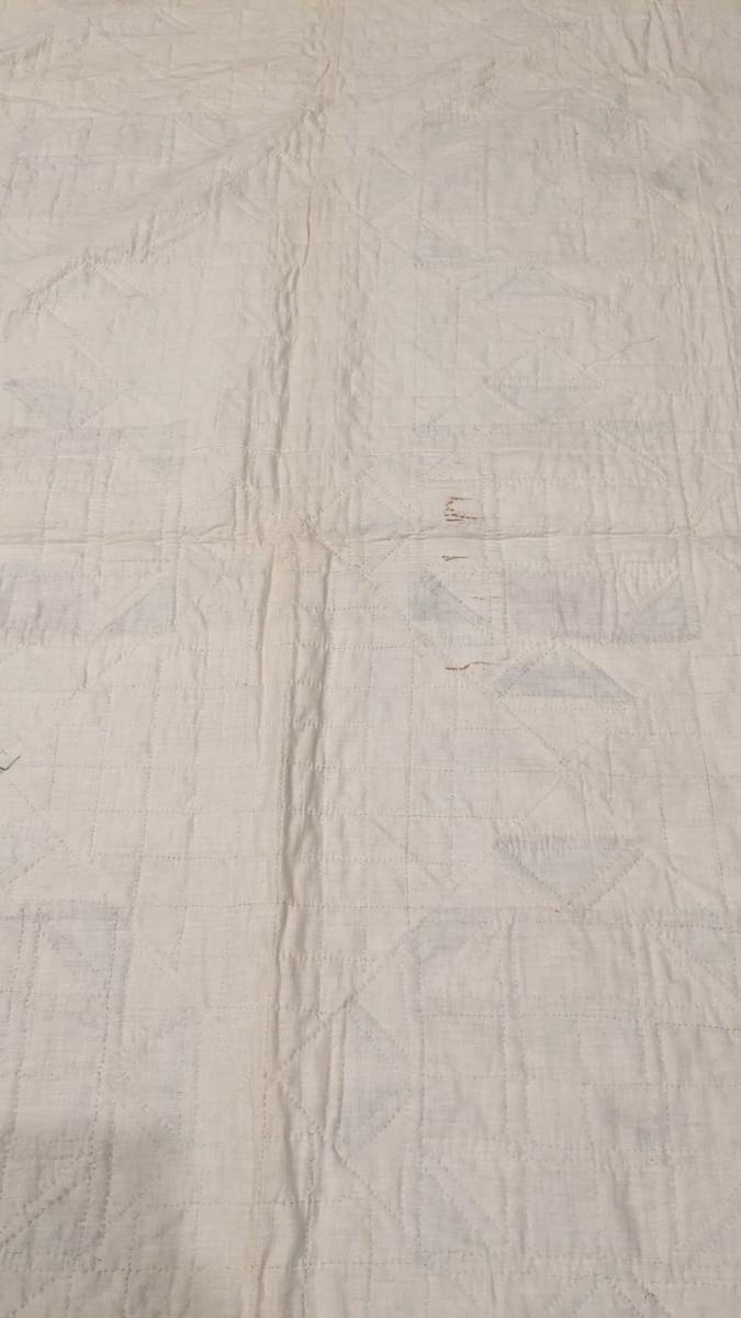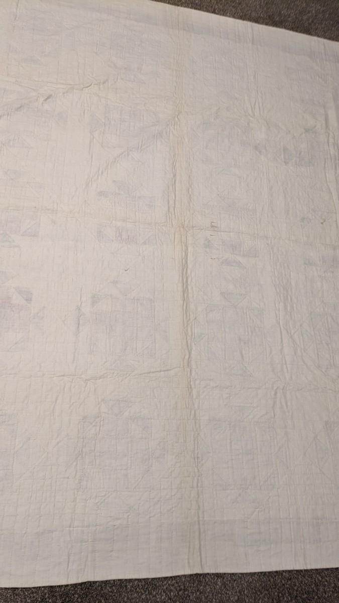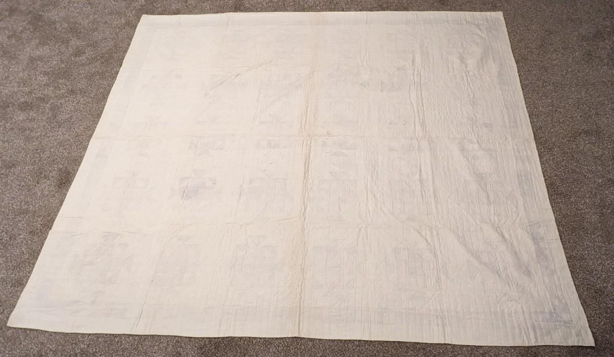 92"x 75.75". A beautiful early quilt that shows very minimal discoloration around edges and in upper left quarter as photographed. Spotting is noted on the back as well as various discoloration mainly along line seen where it was stored. This quilt was found in an attic with an unknown origin