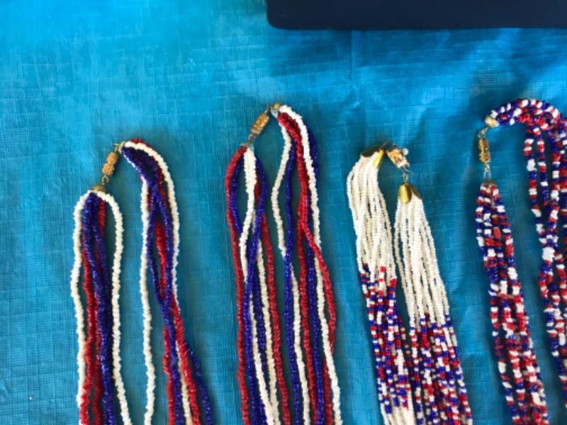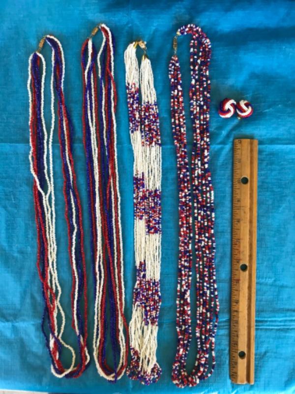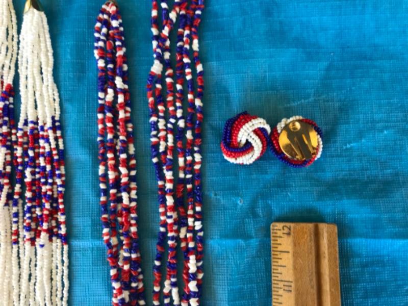 Lot of Patriotic red, white, and blue seed bead jewelry. 1 pair of clip earrings and long multi-strand necklaces.