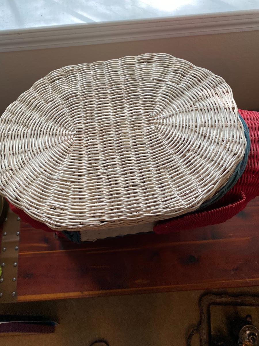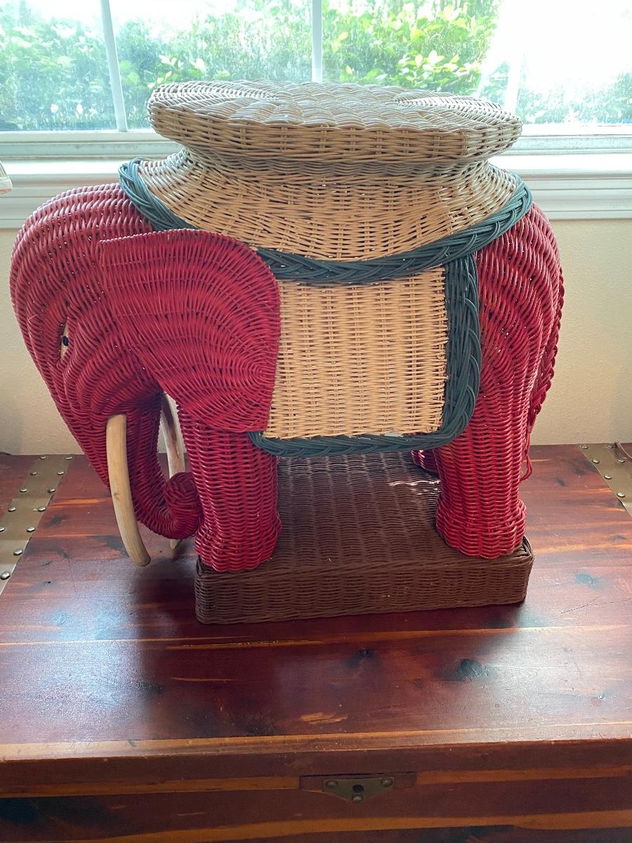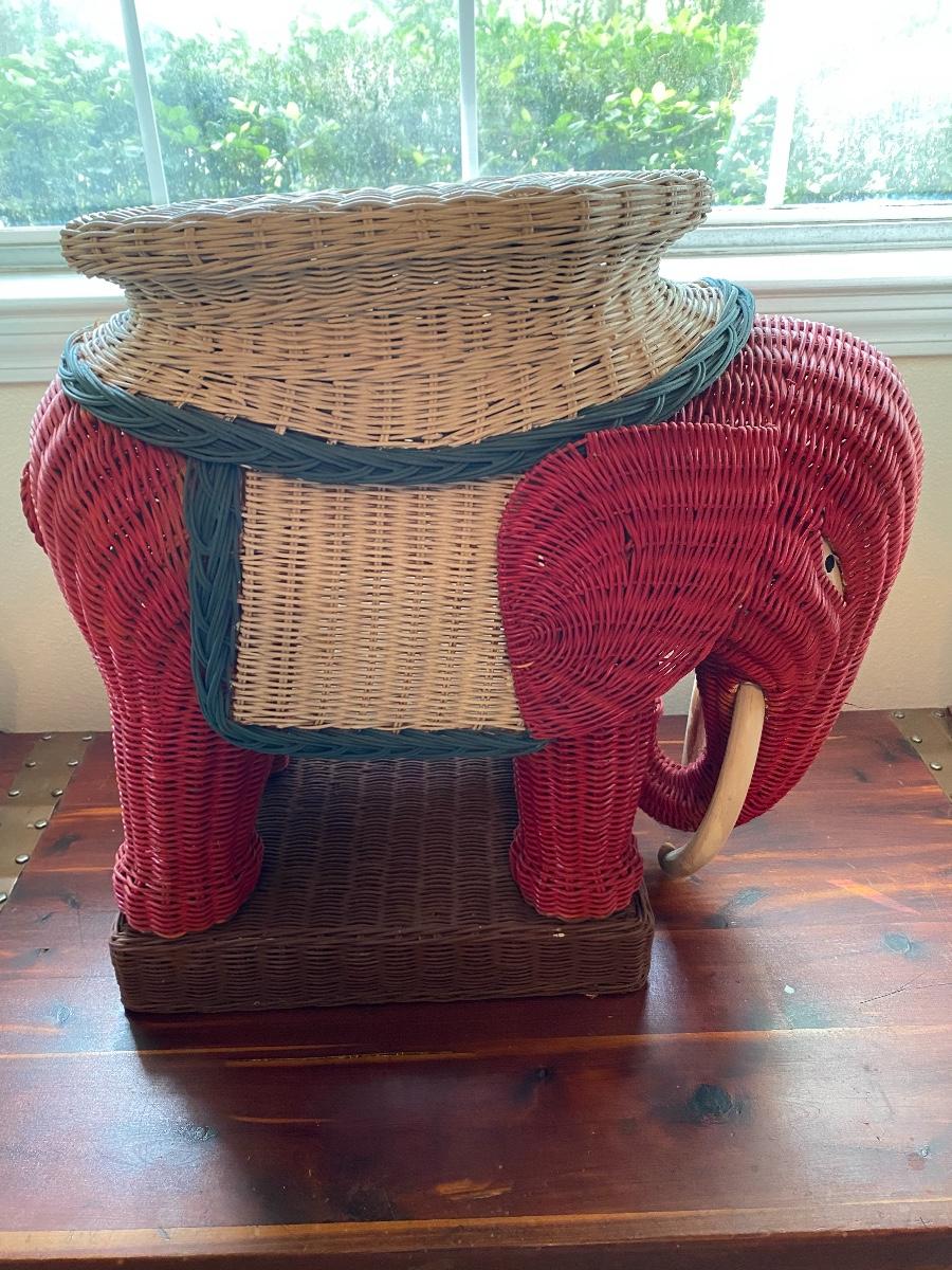 Red, White & Blue Wicker Elephant stool/plant stand. Approx. 20" H x 20 1/2" L x 9 1/2" W. In great condition