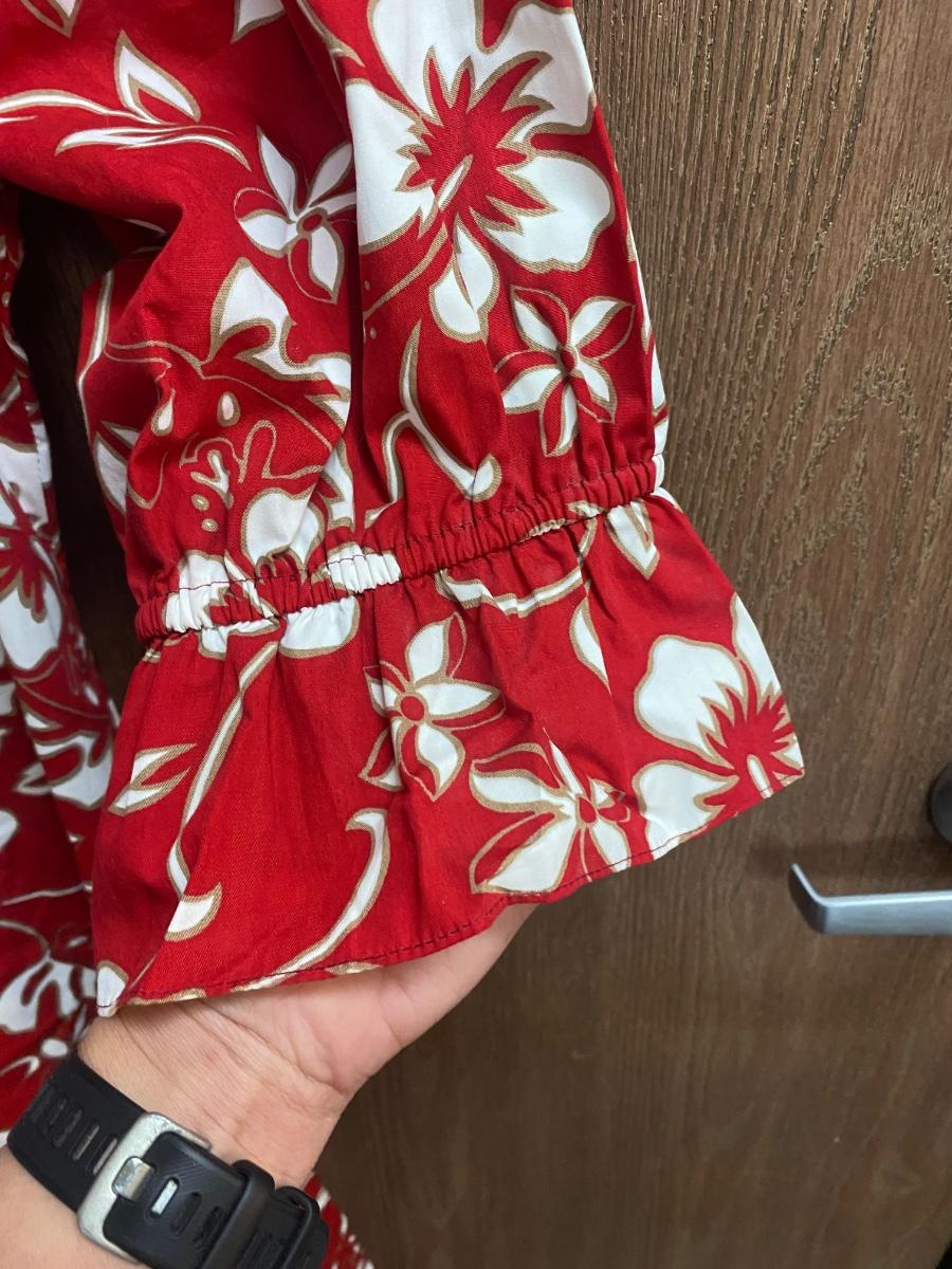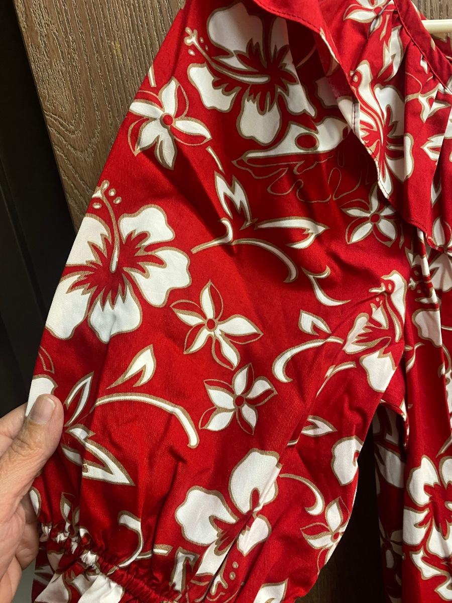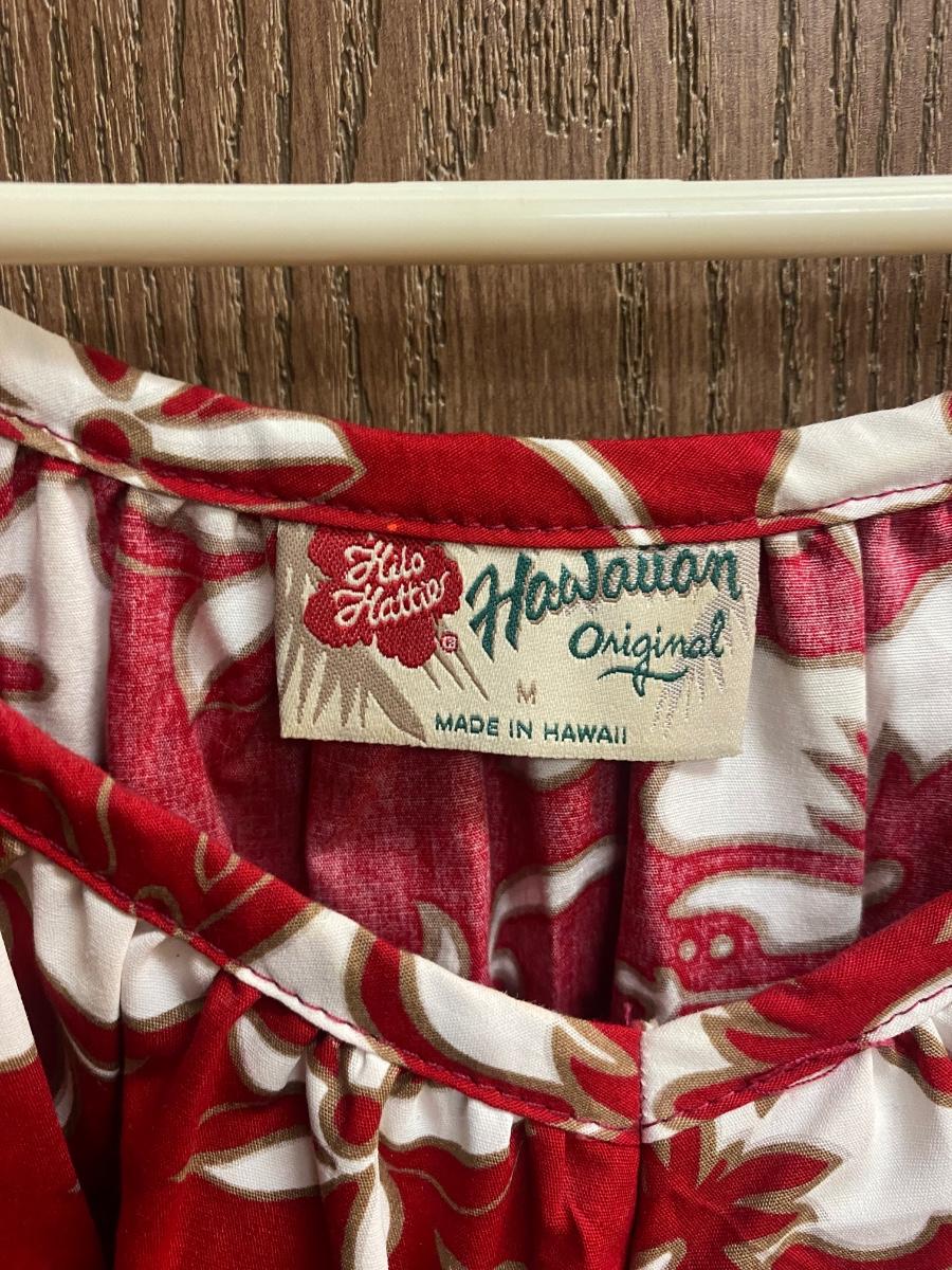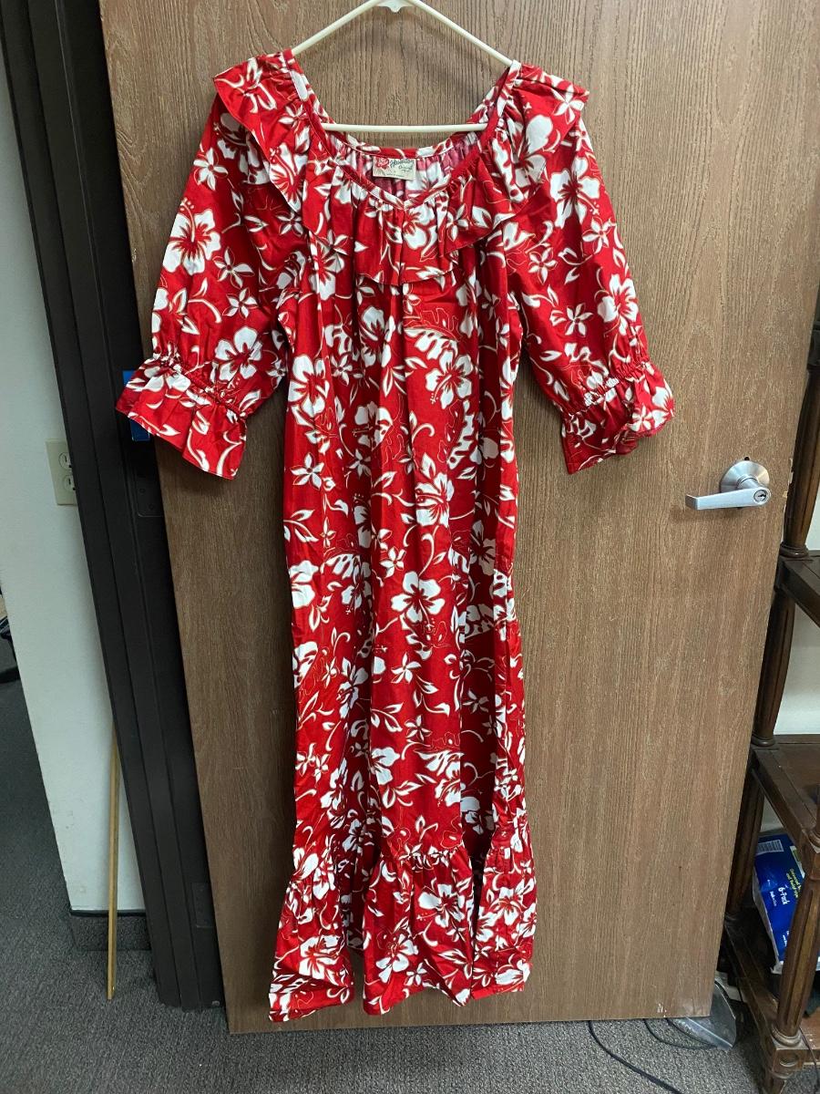 Red & White Hilo Hattie Traditional Hibiscus Pattern Hawaiian Caftan Dress Mumu. In very good condition. Size medium. Hibiscus and plumeria pattern. One pocket on the left side.