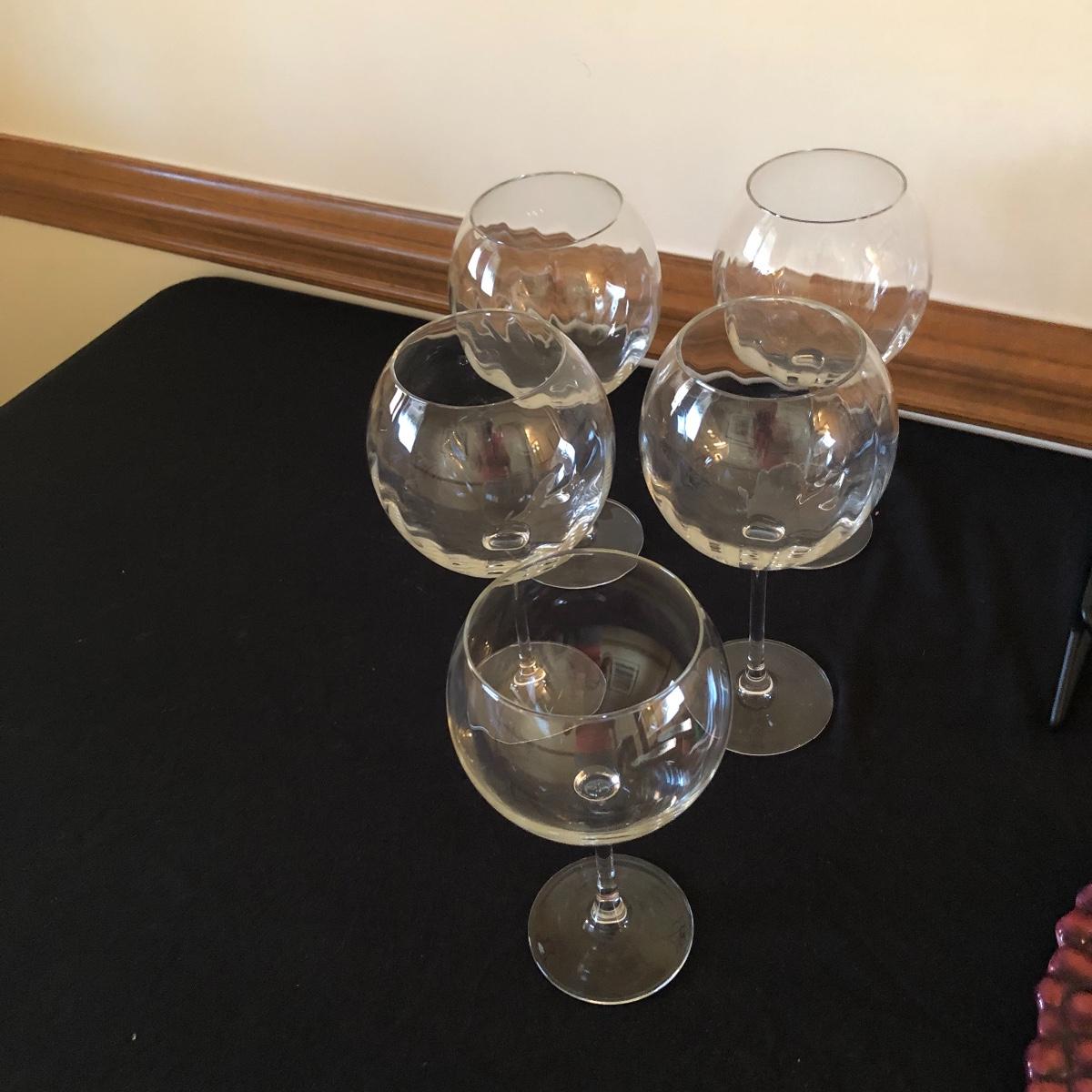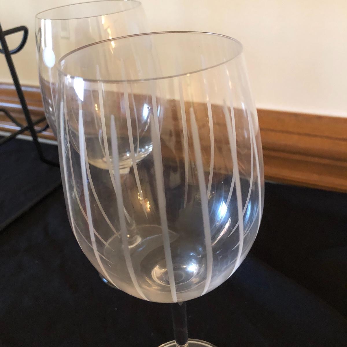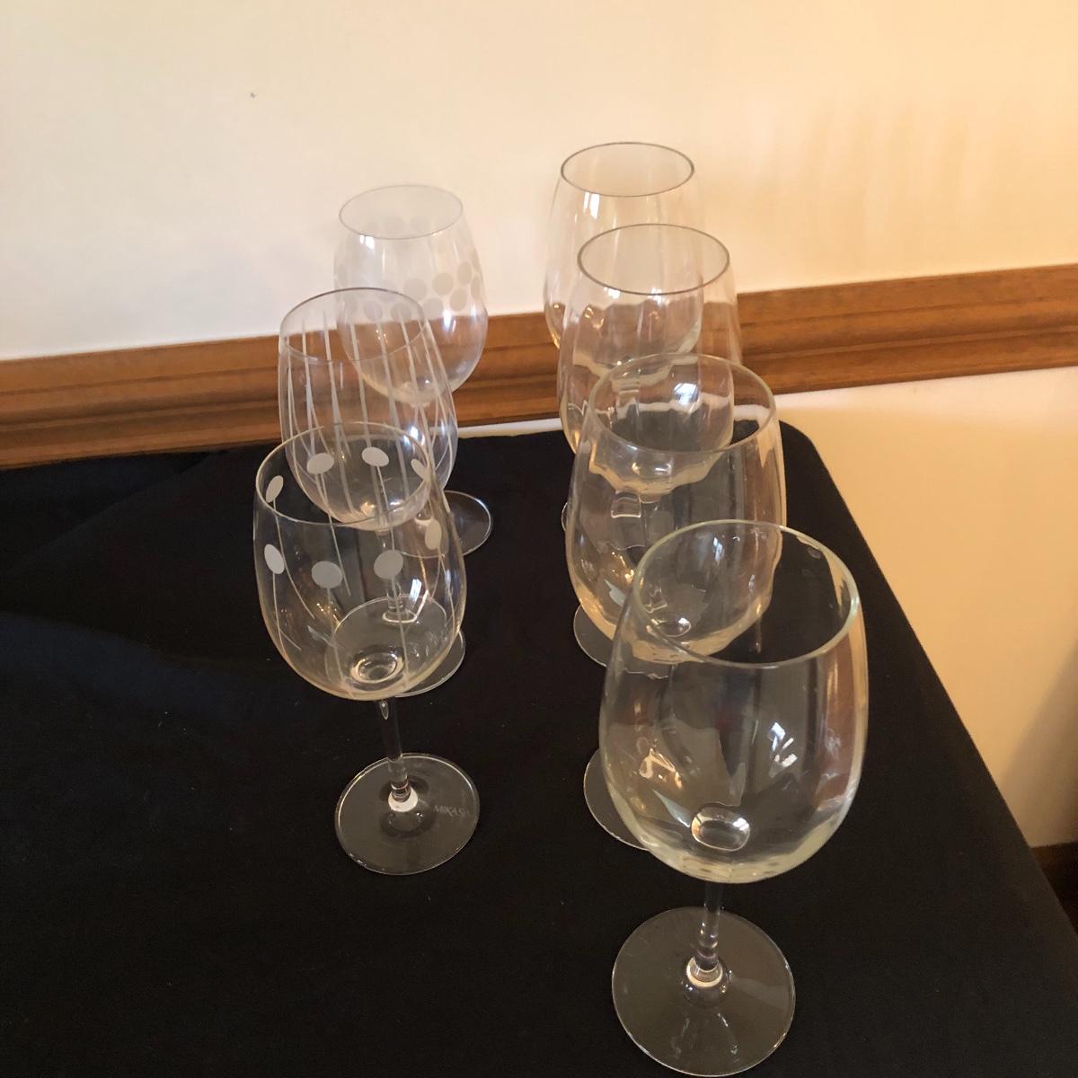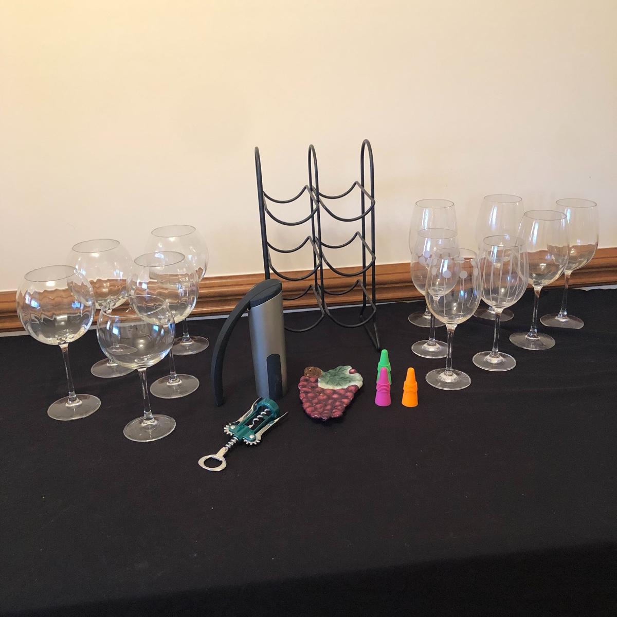 There are five red wine glasses - four of which have subtle ridges at the base of the glass. There are seven white wine glasses - three have circles and lined designs and are Mikasa. The metal wine rack hold six wine bottles. There are also two manual openers, three stoppers and a wine spoon rest. Shipping Available.