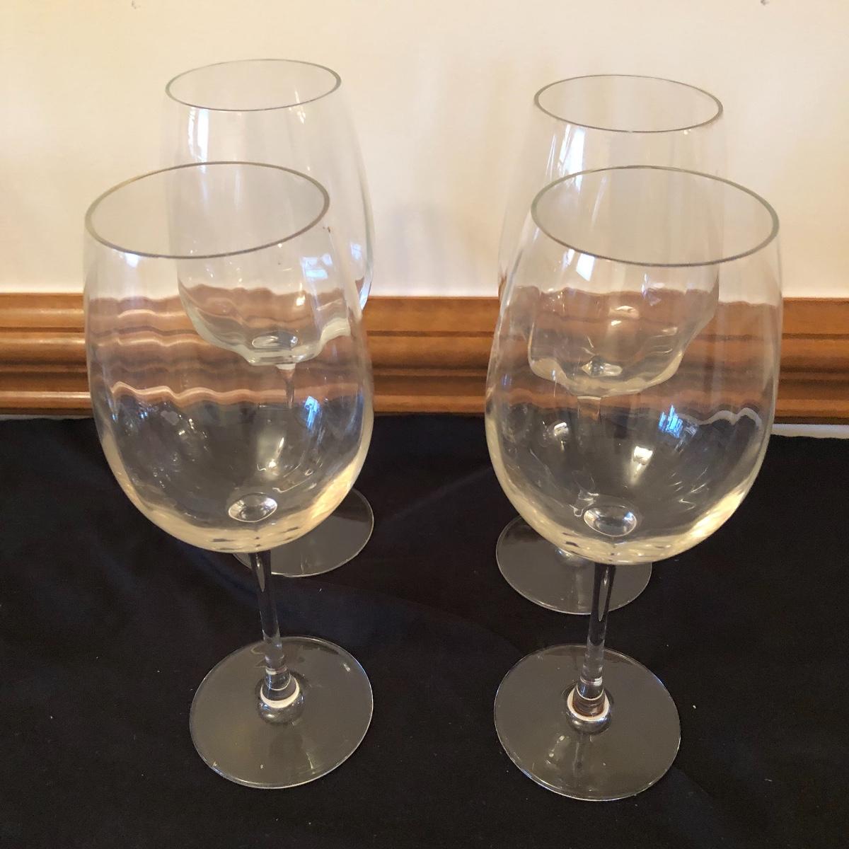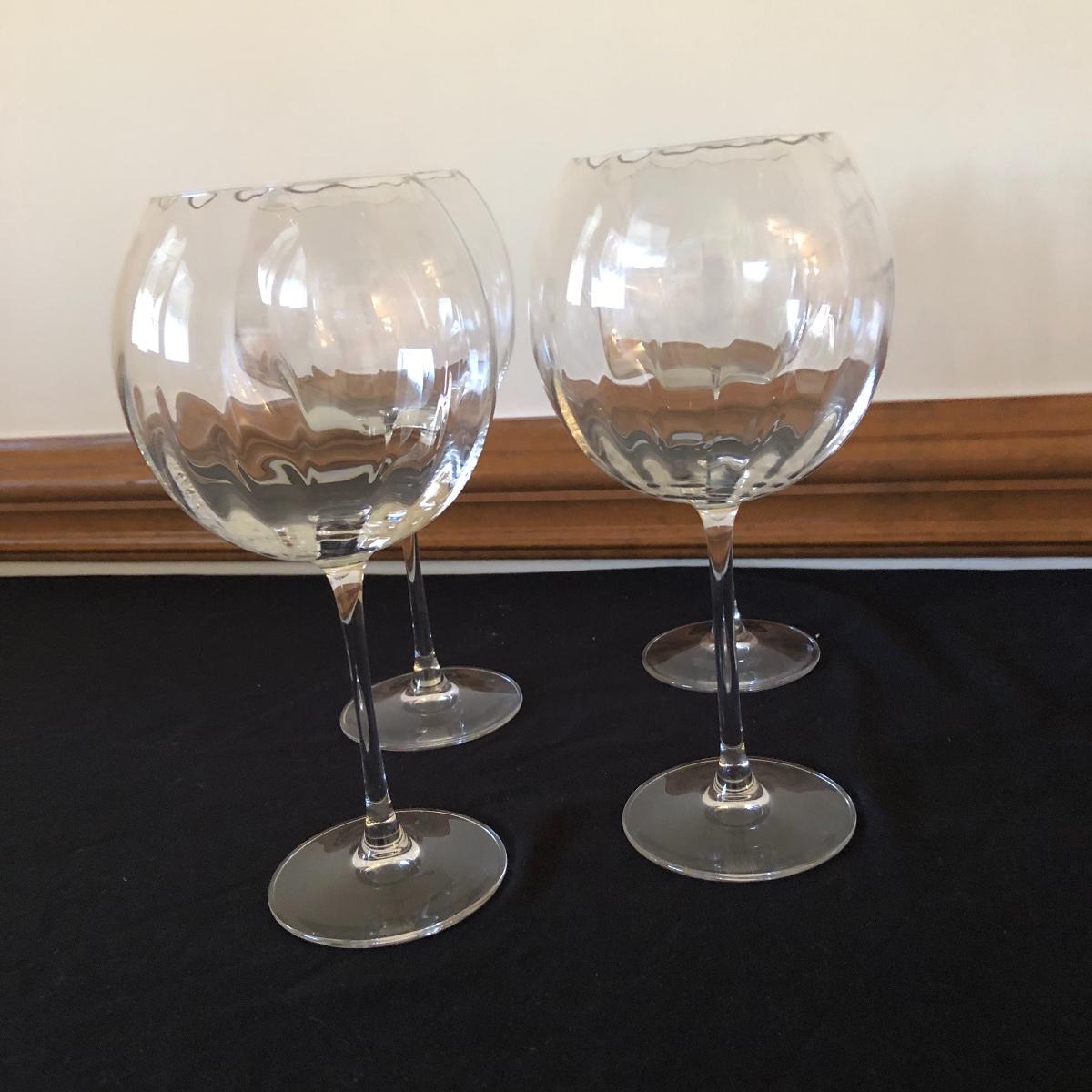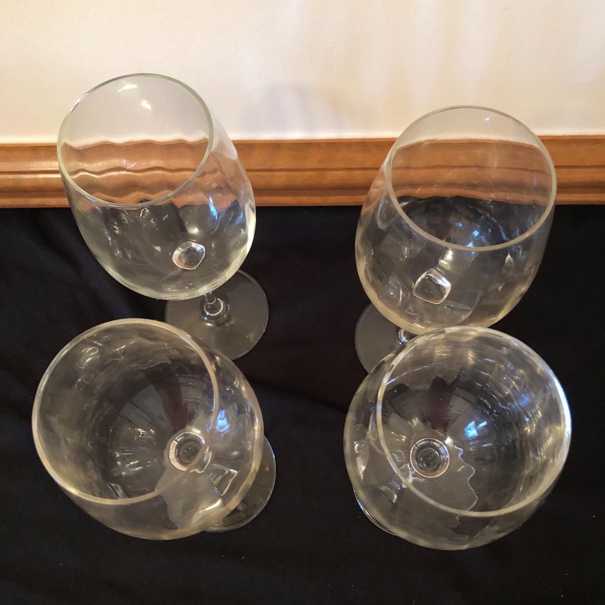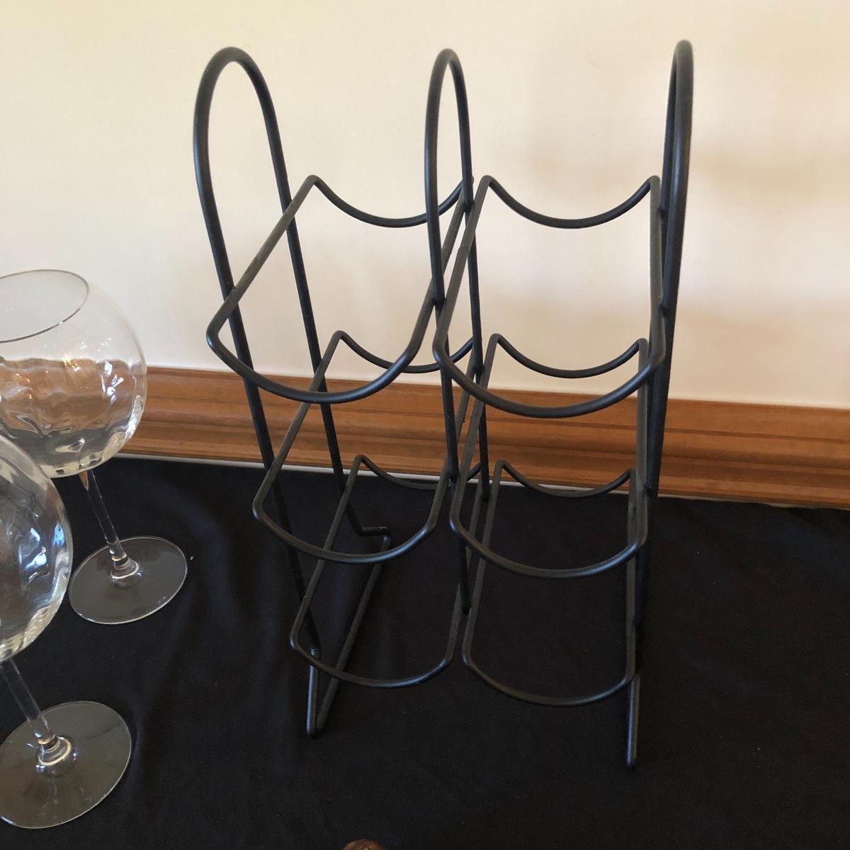 There are five red wine glasses - four of which have subtle ridges at the base of the glass. There are seven white wine glasses - three have circles and lined designs and are Mikasa. The metal wine rack hold six wine bottles. There are also two manual openers, three stoppers and a wine spoon rest. Shipping Available.