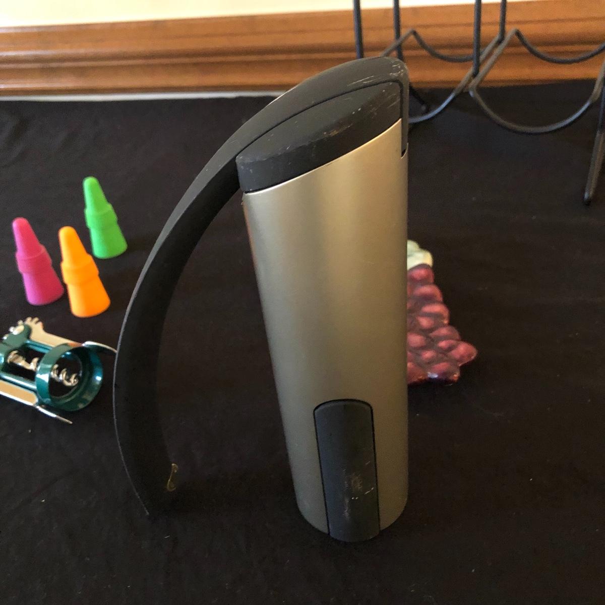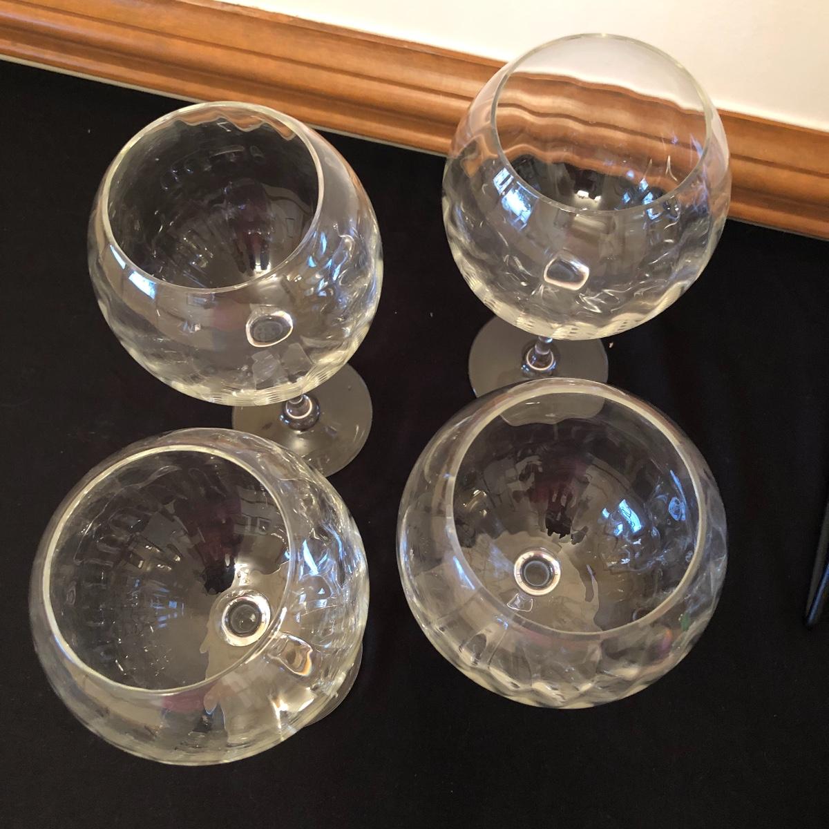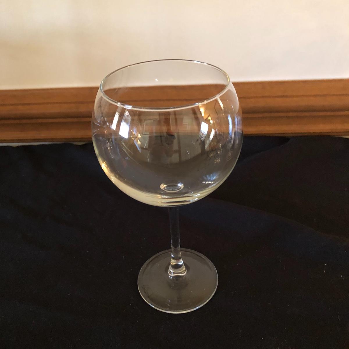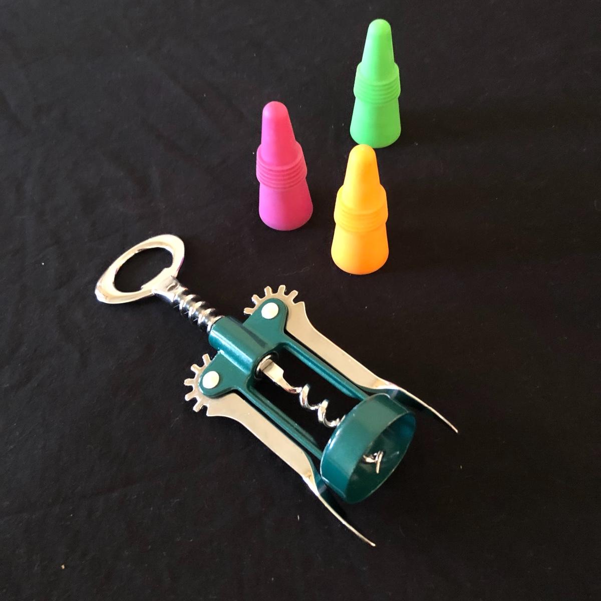 There are five red wine glasses - four of which have subtle ridges at the base of the glass. There are seven white wine glasses - three have circles and lined designs and are Mikasa. The metal wine rack hold six wine bottles. There are also two manual openers, three stoppers and a wine spoon rest. Shipping Available.