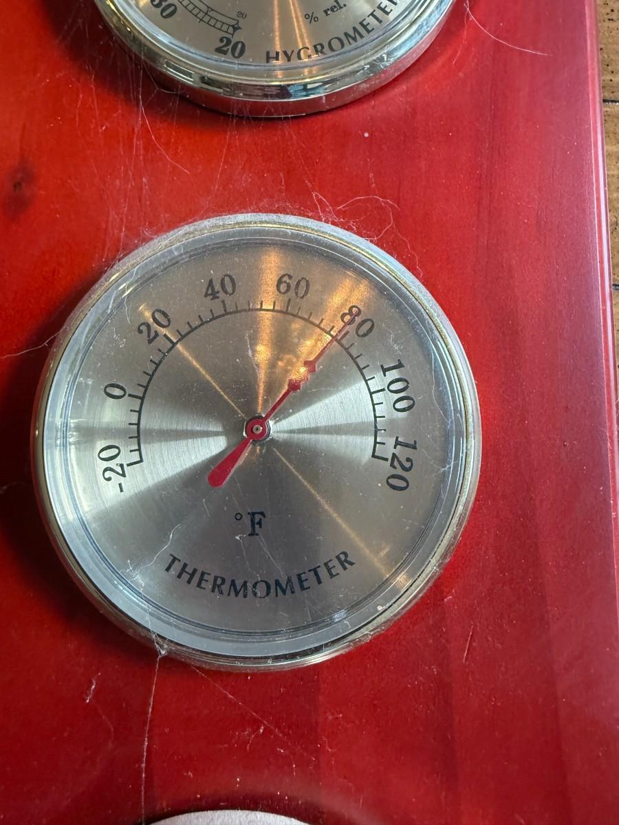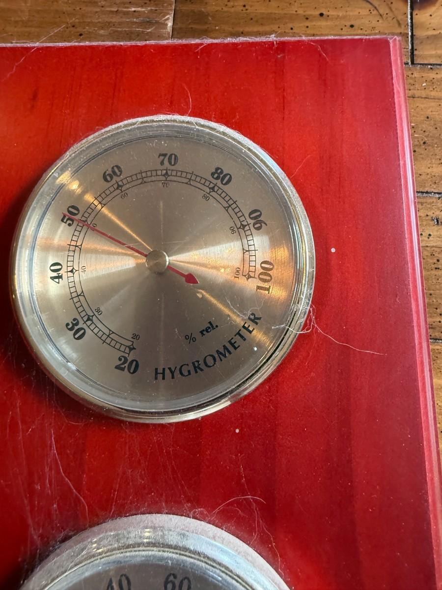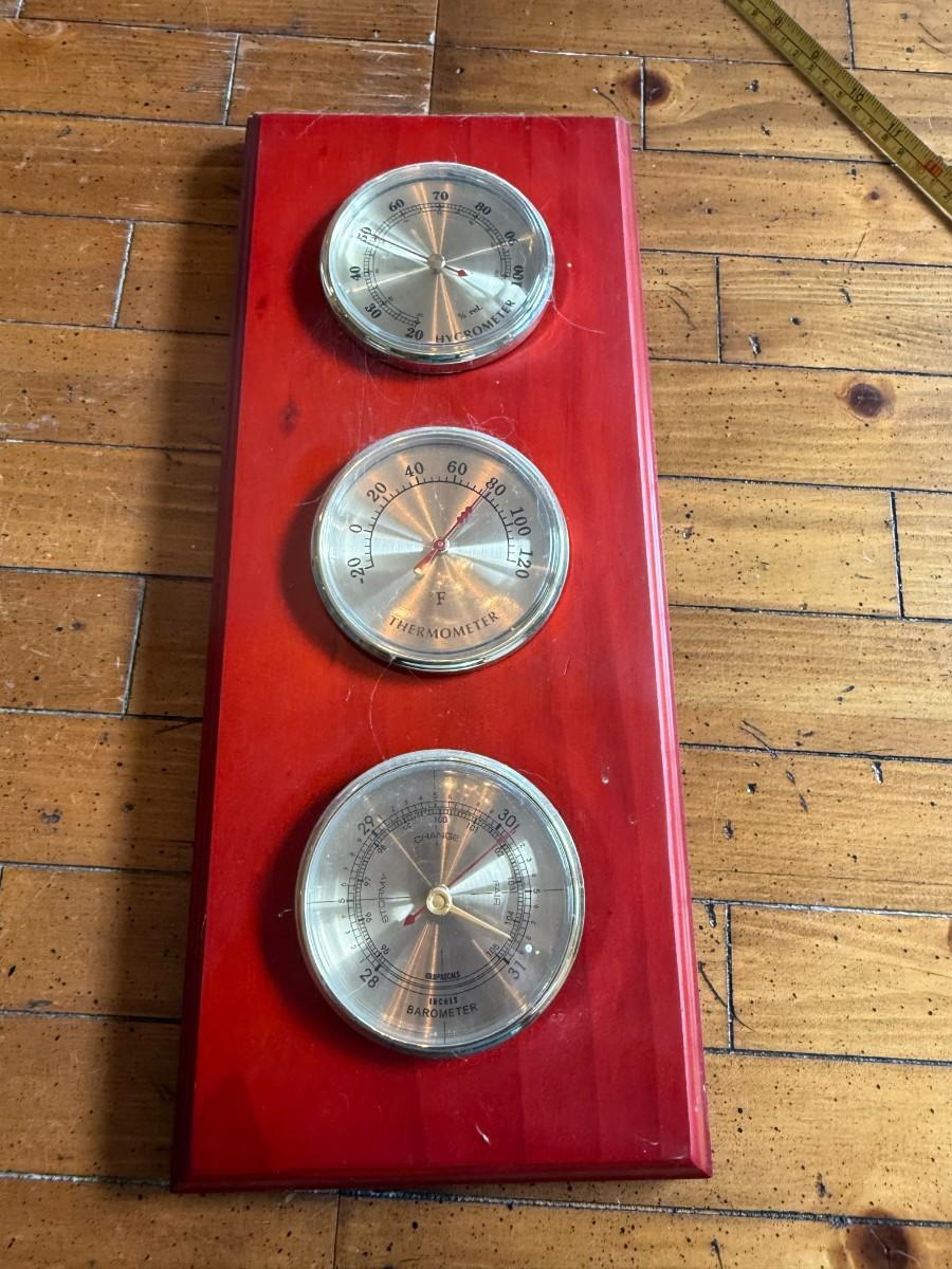 Description: Wall-mounted weather station with three brass-tone dials — hygrometer, thermometer, and barometer — on a red-stained wood base. Vintage style.