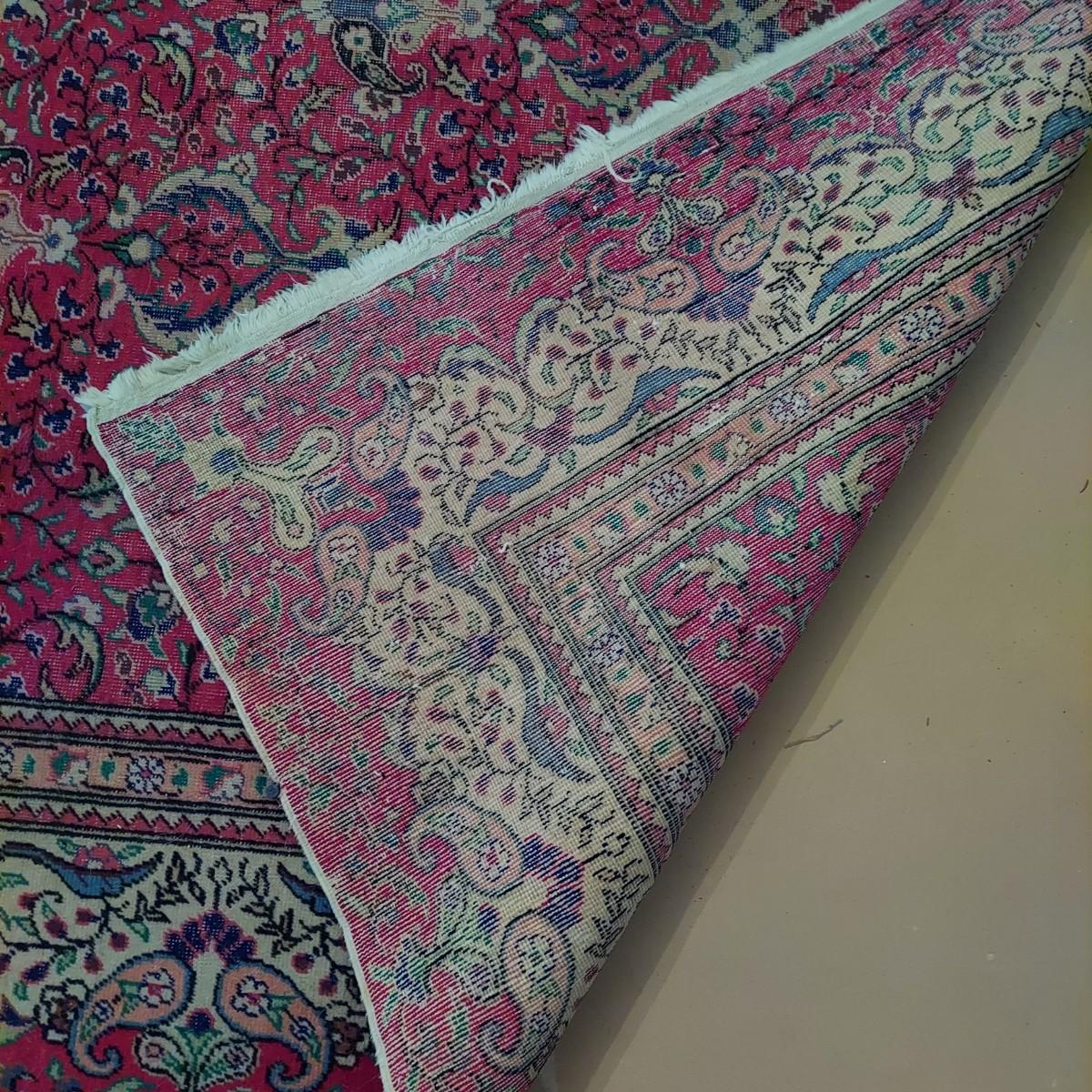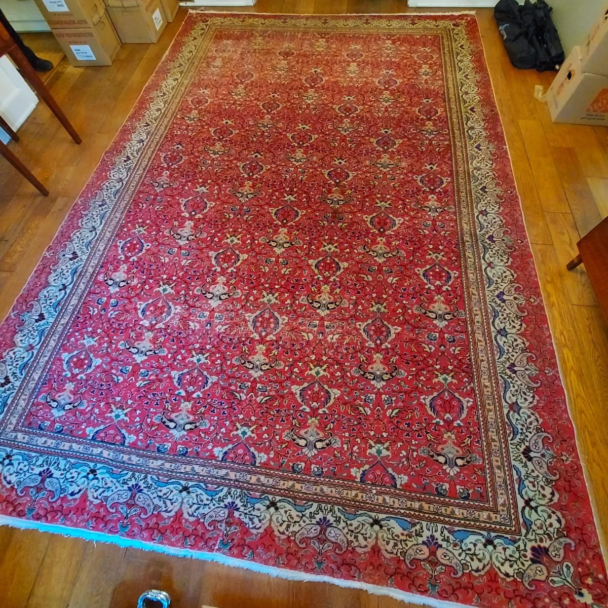 Large wool area Rug with red damask style all over print. Rug measures approximately 9'5" x 12'10". No tags, appears to be wool. Comes with rug pad. Some areas with wear. Please see photos. Local Pickup Only