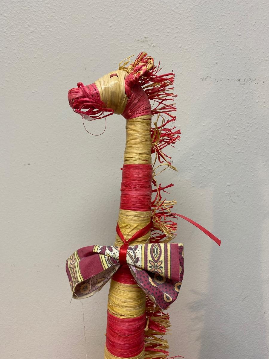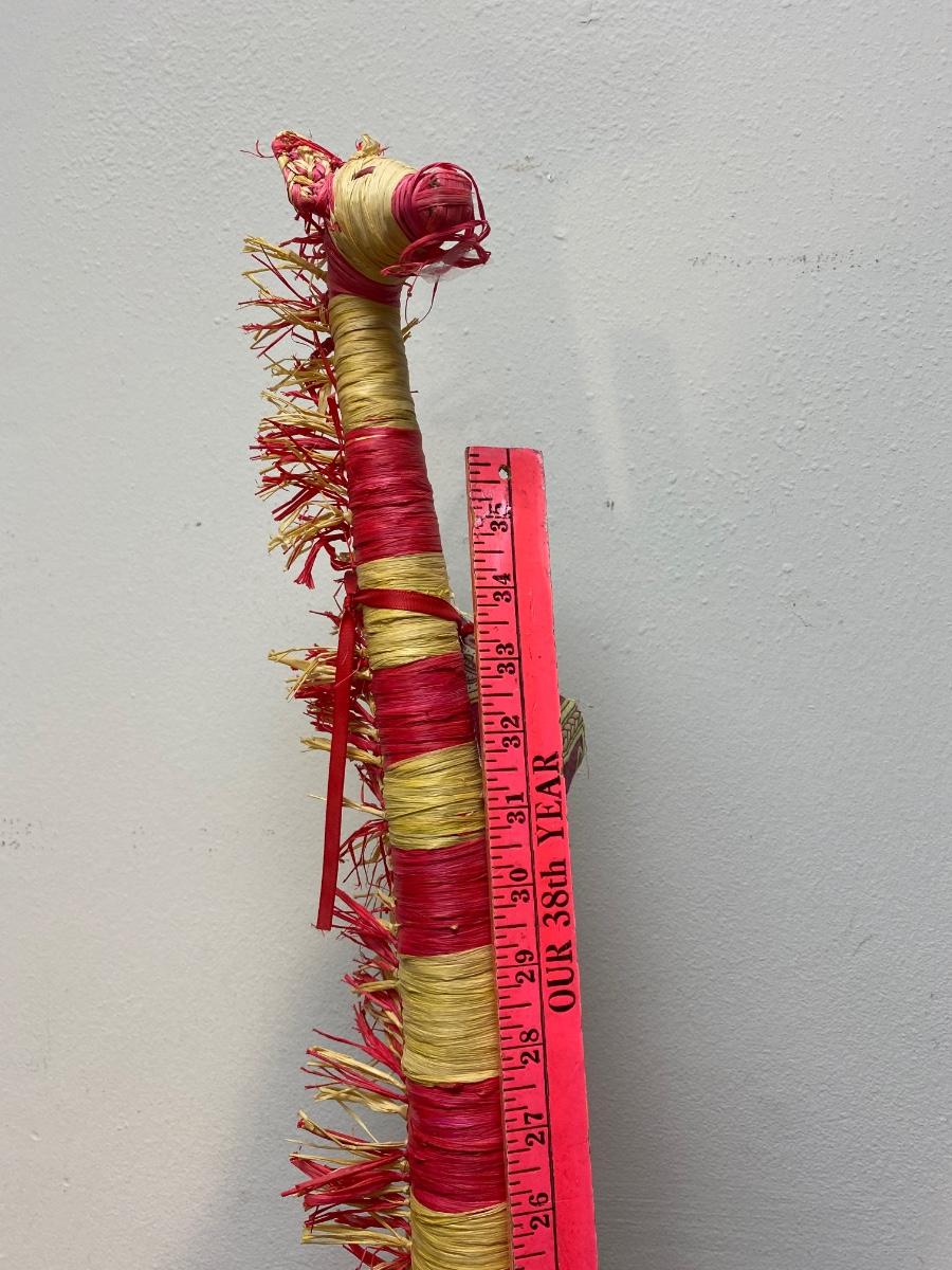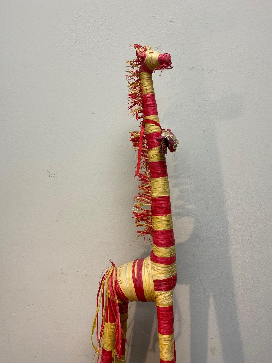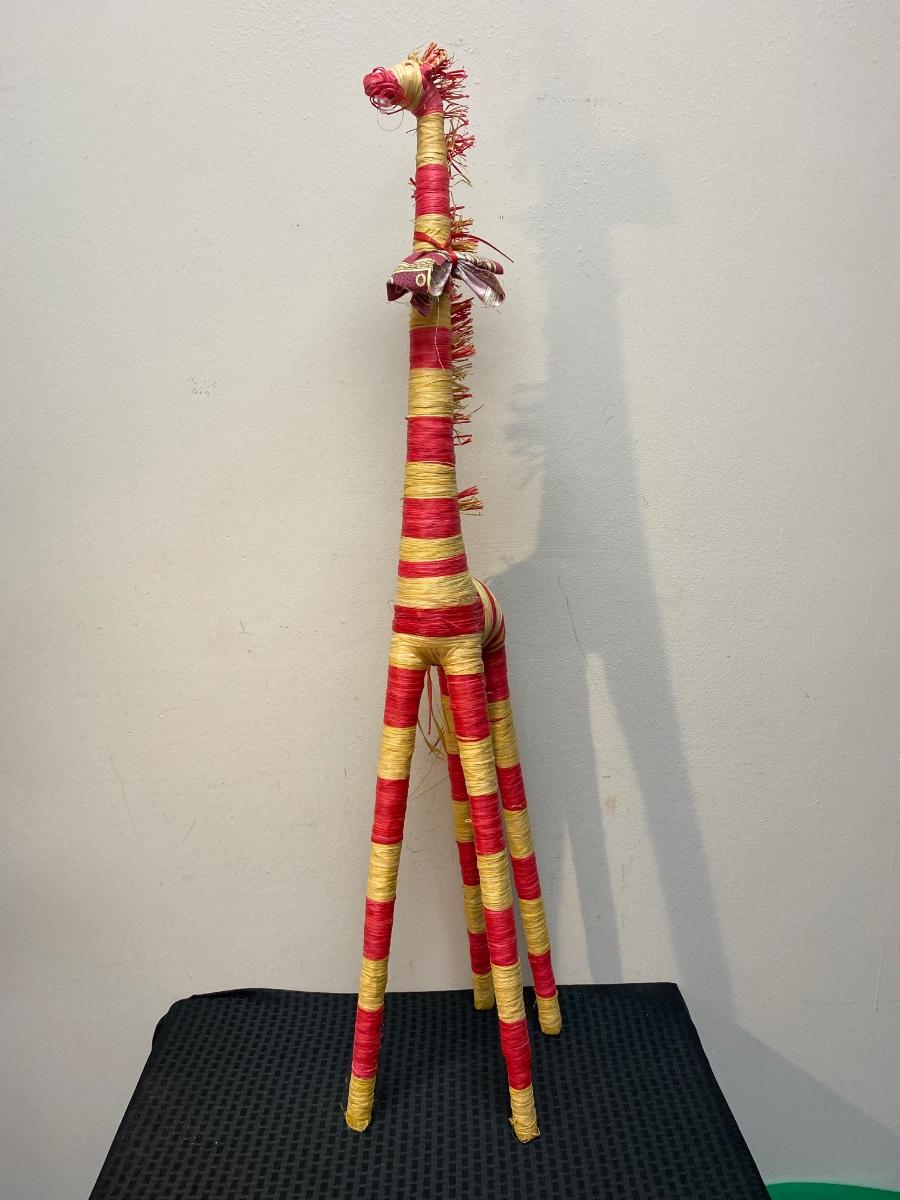 Red & yellow striped rafia palm wrapped giraffe. Tall, almost 40". In good vintage condition.