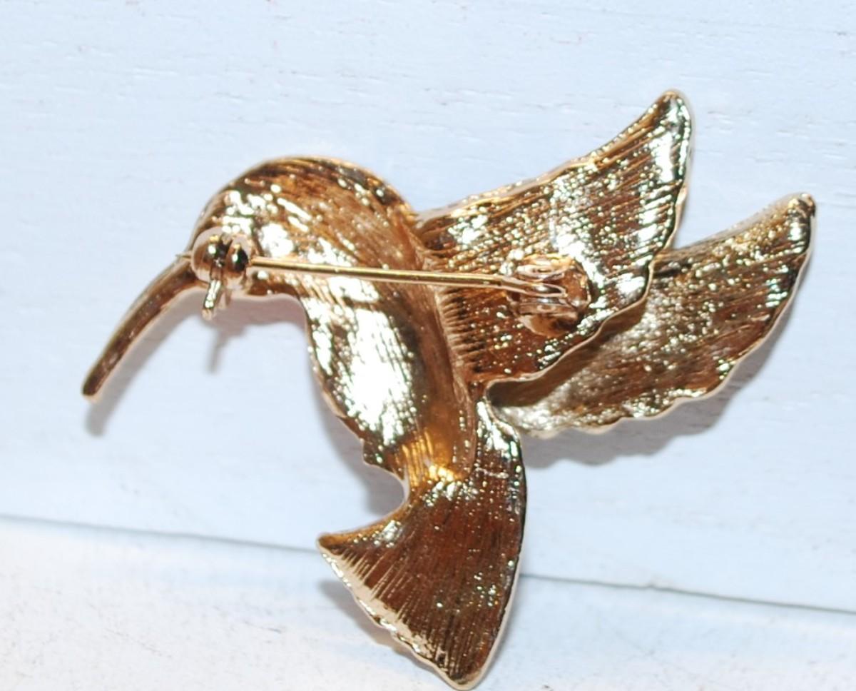 Reddish Pink, Black & Gold Hummingbird BROOCH (2" x 1½") on a Gold Tone Setting