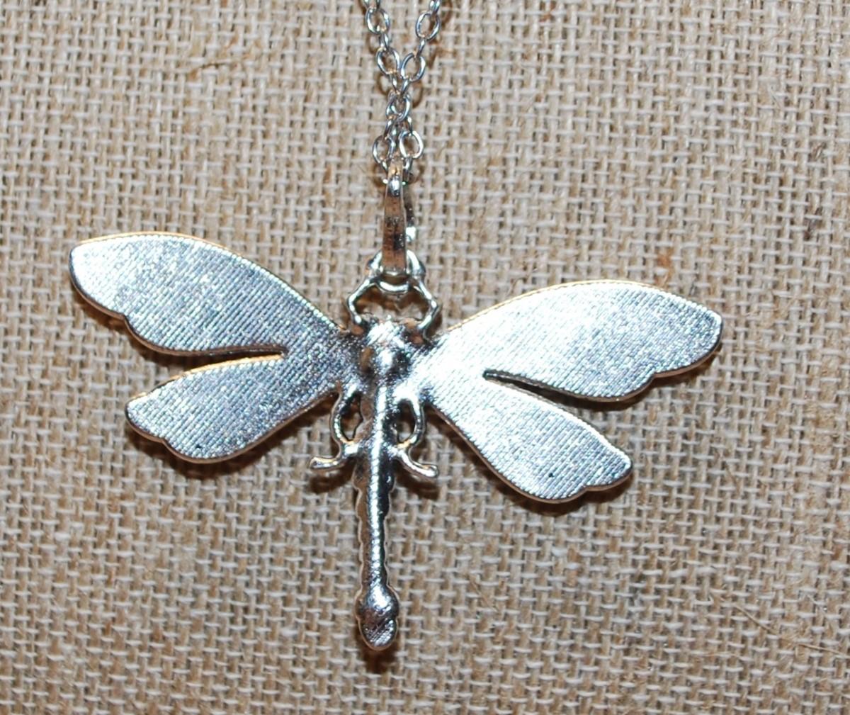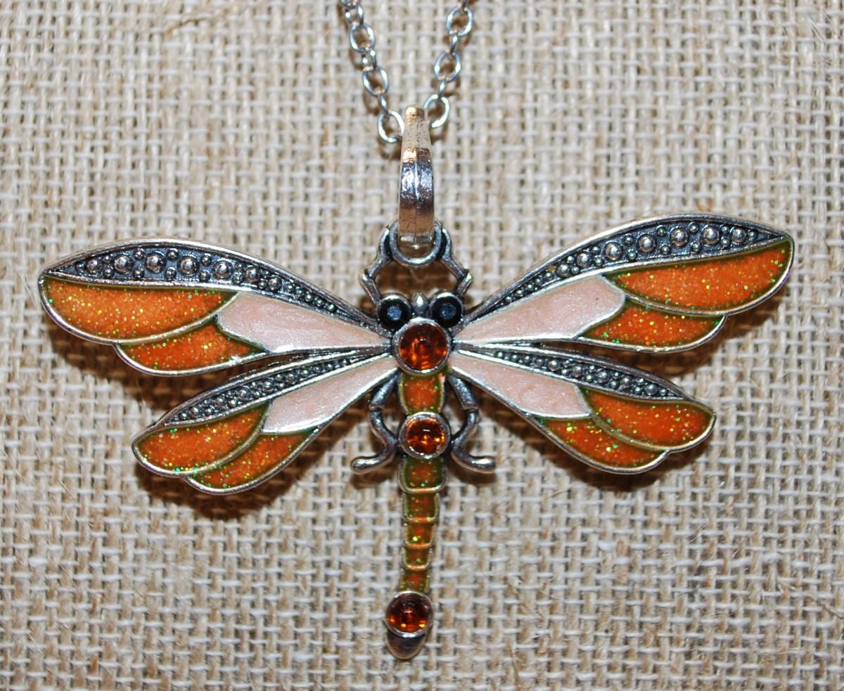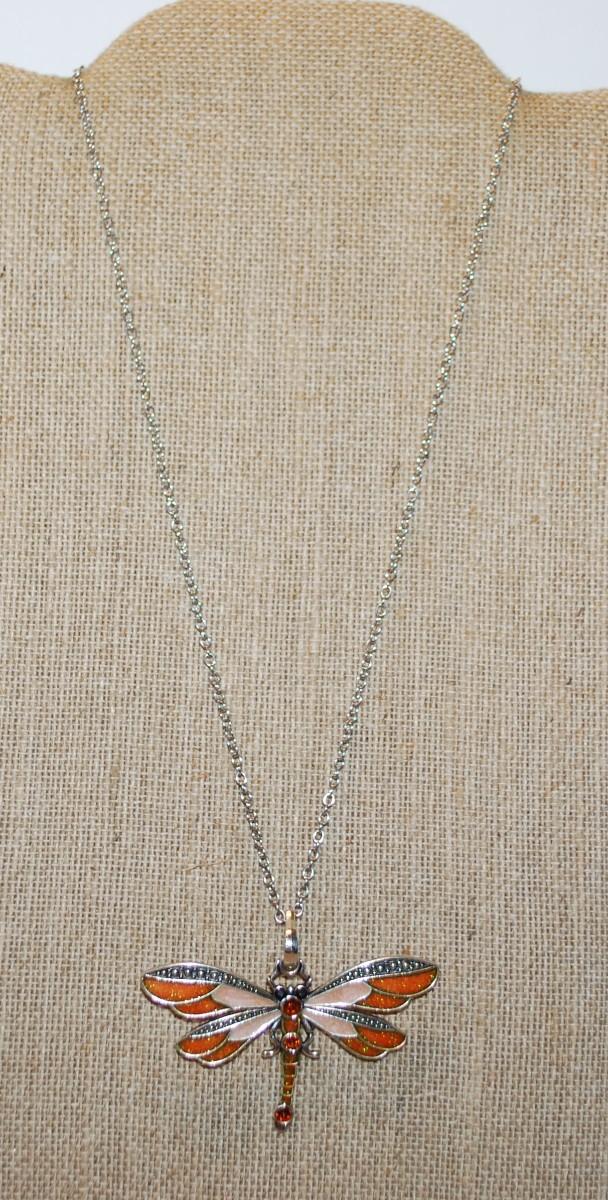 RED/ORANGE & PINK Dragonfly PENDANT (2½" x 2") on a Silver Tone Necklace Chain 19" L