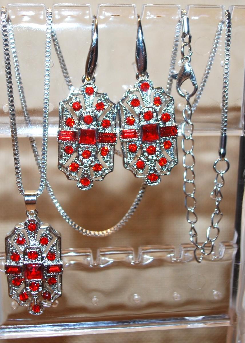 Red/Silver JEWELRY SET Includes Earrings (1½" x ¾") with Wire Hook & PENDANT (1½" x ¾") on a Silver Tone Necklace Chain 18" L