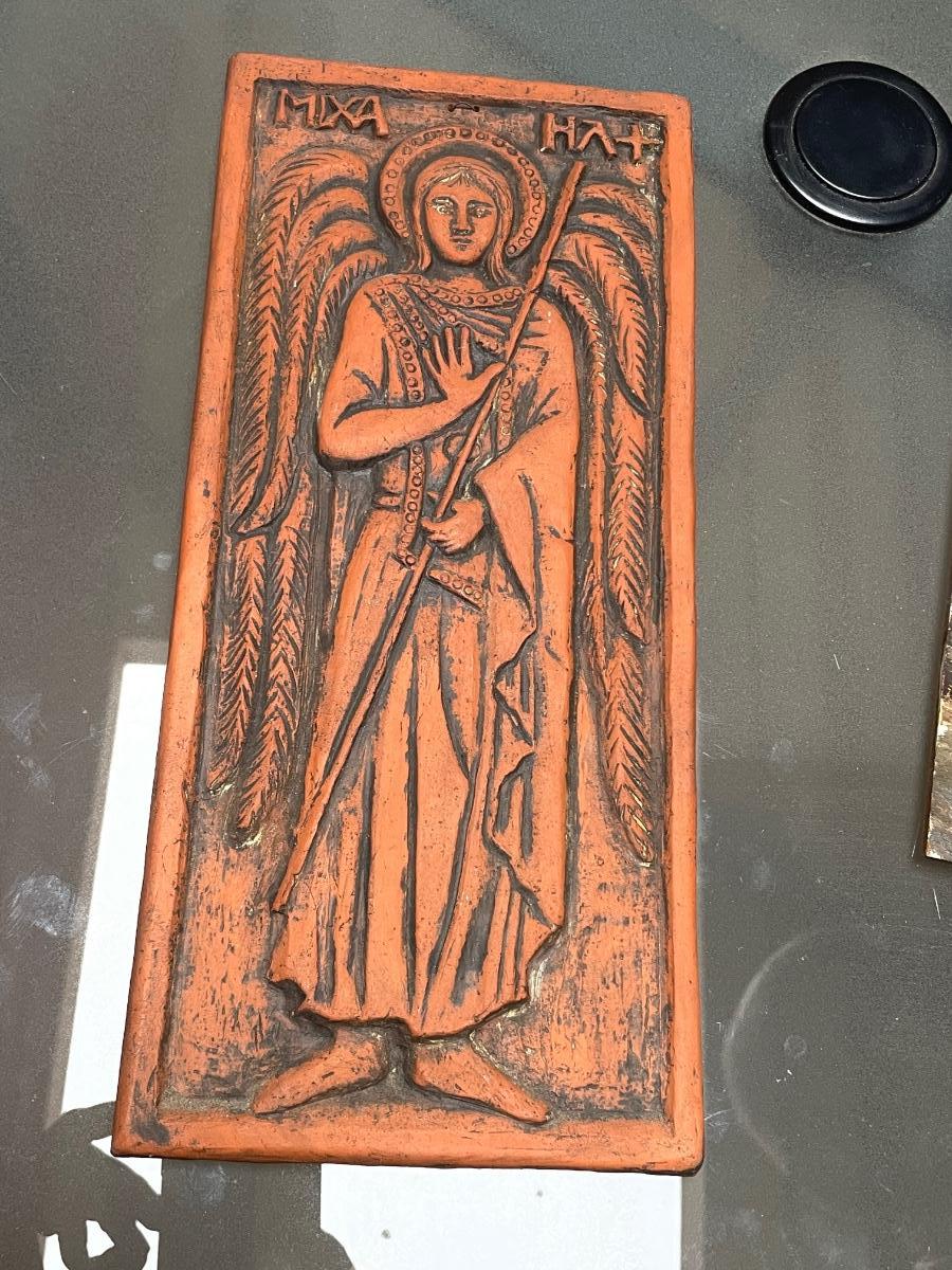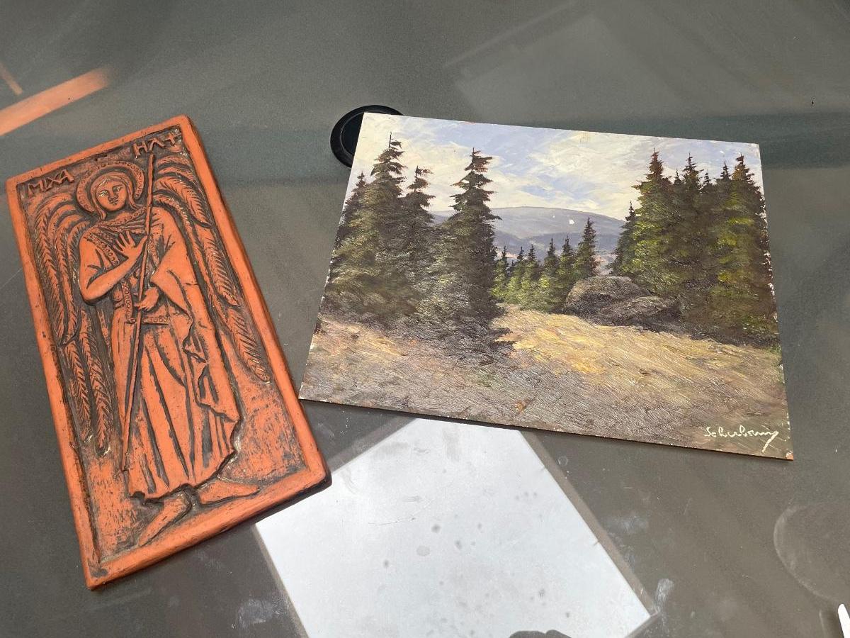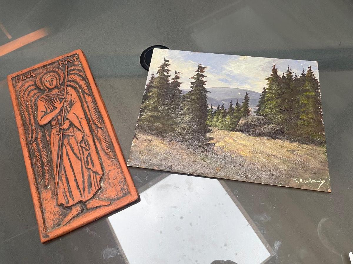 REDWARE PLAQUE, signed PVI / OIL ON BOARD, Artist signed