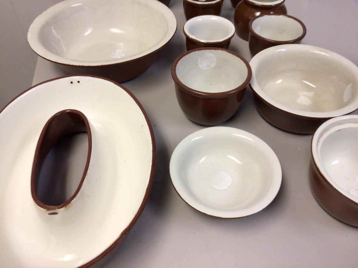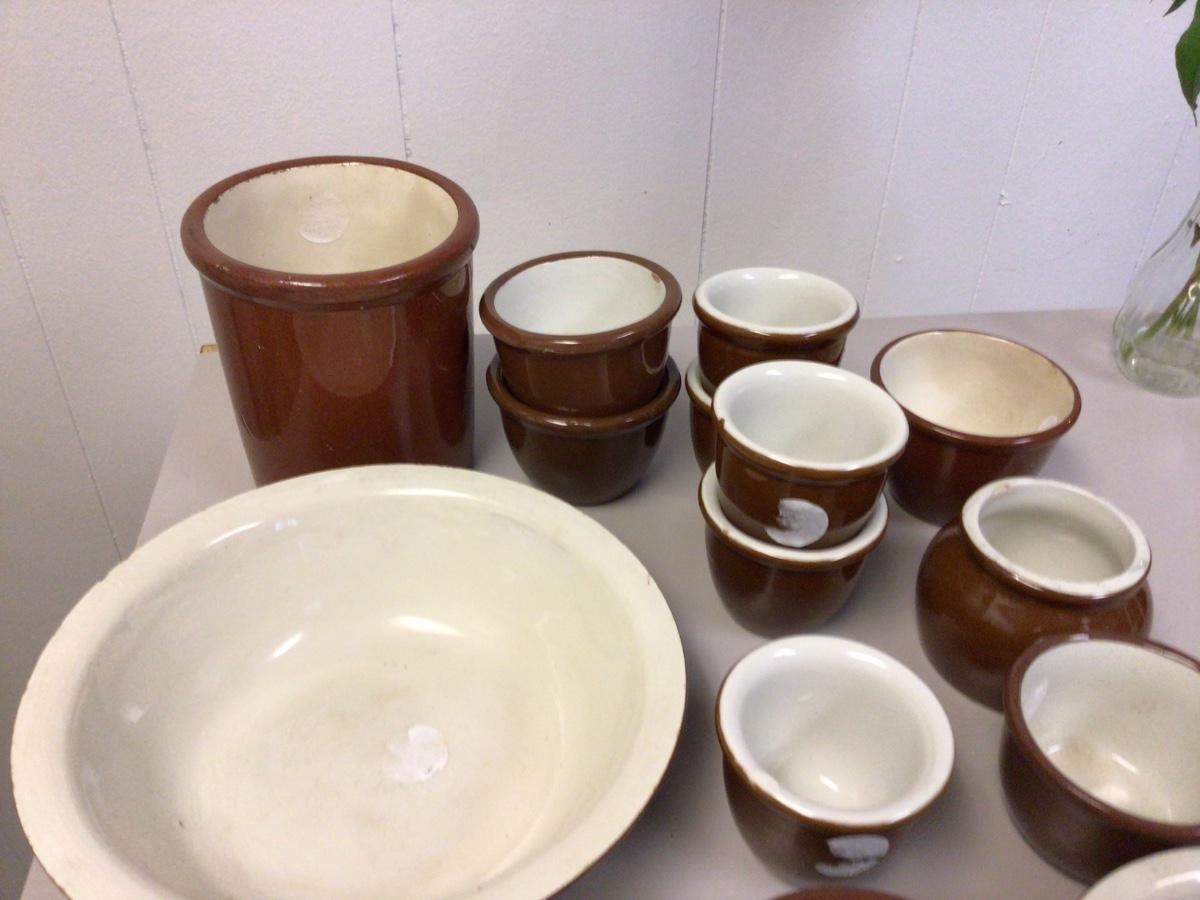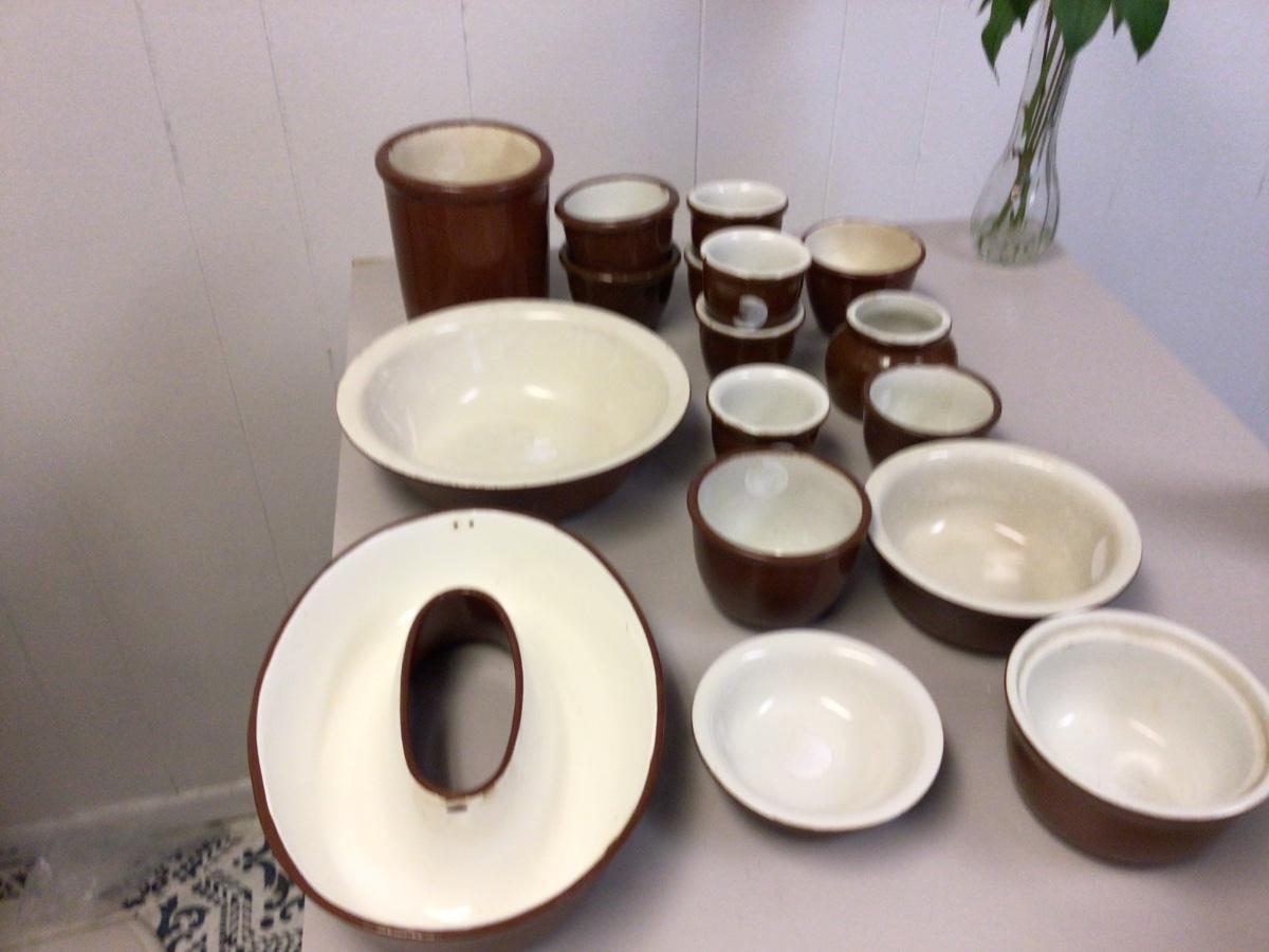 This is a great lot of redware kitchen dishes. There are, bowls, baking pans, dipping bowls, bean pot, beater bowl. Somer are marked Weller, and Hall. All in good condition.