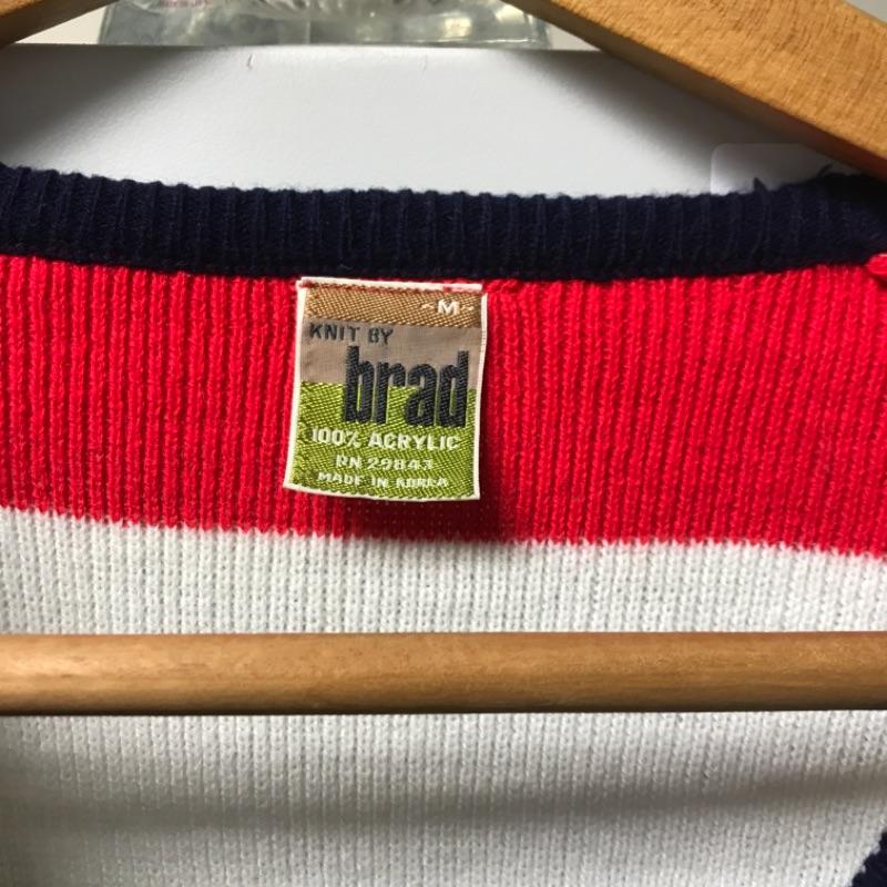 Up for auction is a red, white, and navy blue sweater vest made by, “Knit by Brad”. There is a small stain on the lower left bottom of the front, and the lower left bottom of the back; see pictures.