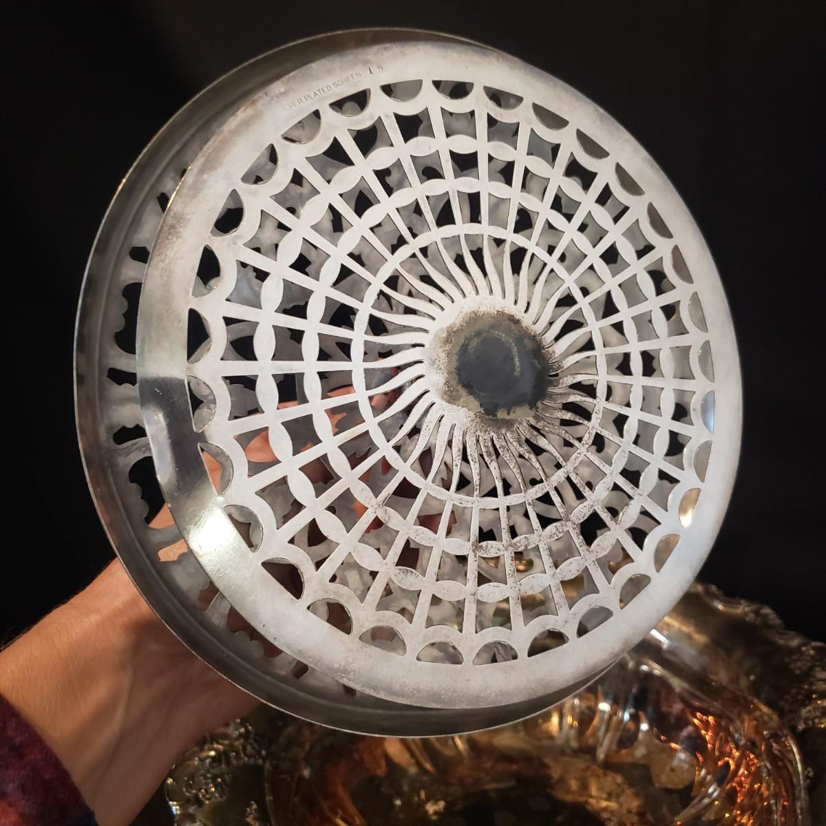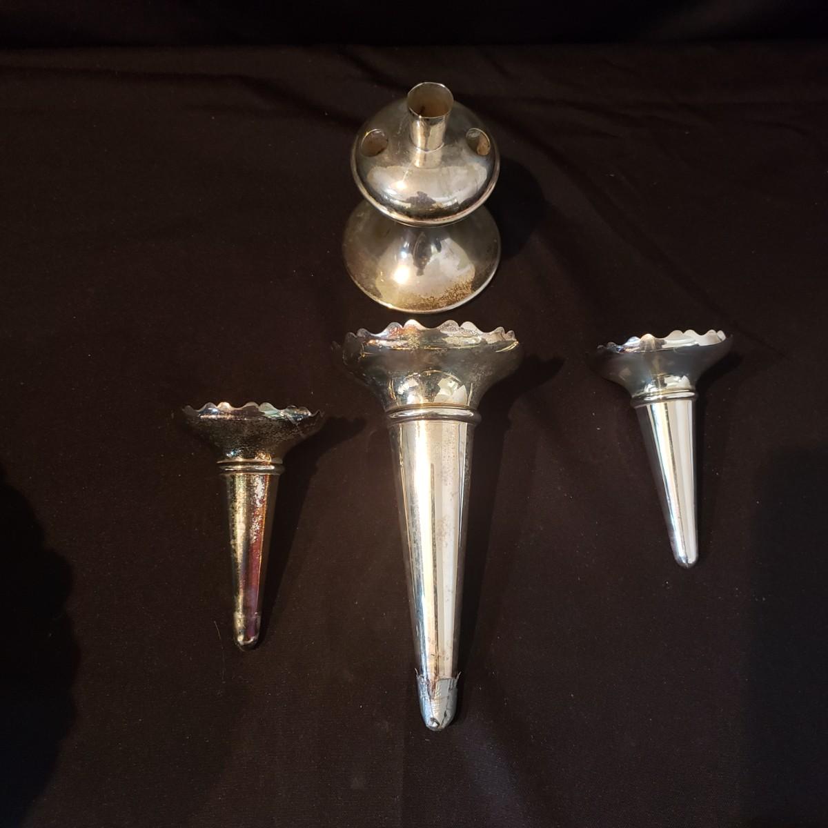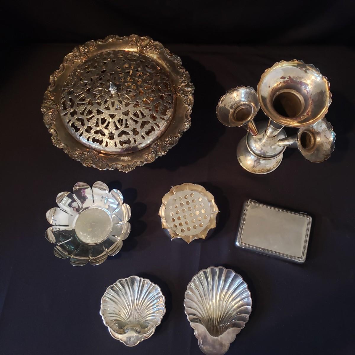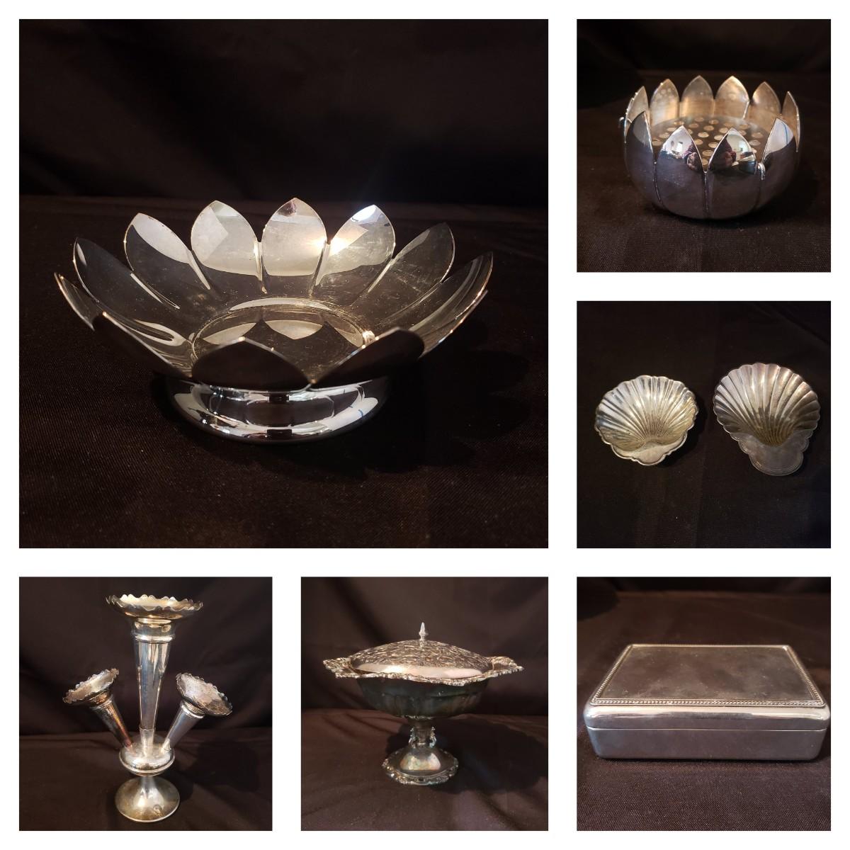 This fun and interesting lot features silver plated floral and decor pieces. The Wallace Baroque piece (11" x 7"H) is photographed with a silver plated ornate frog that fits perfectly! The three fluted vase is so unique! The largest flute has some duck tape at the end, yet is hidden when inserted in the vase. There is some rusting on the insides. The two pedal bowl/frog pieces by Reed and Barton are adorable. There are two shell bowls and lastly a heavy to the touch lidded box by Sheridan.