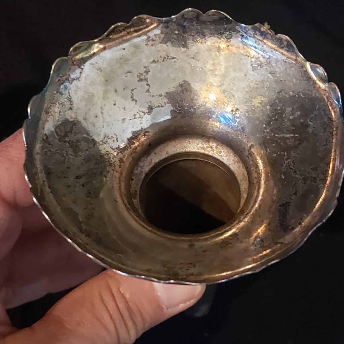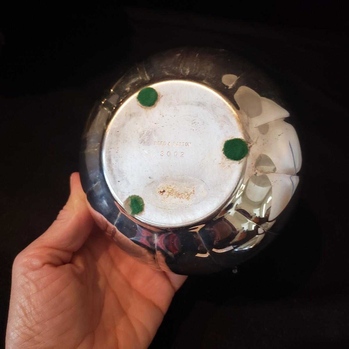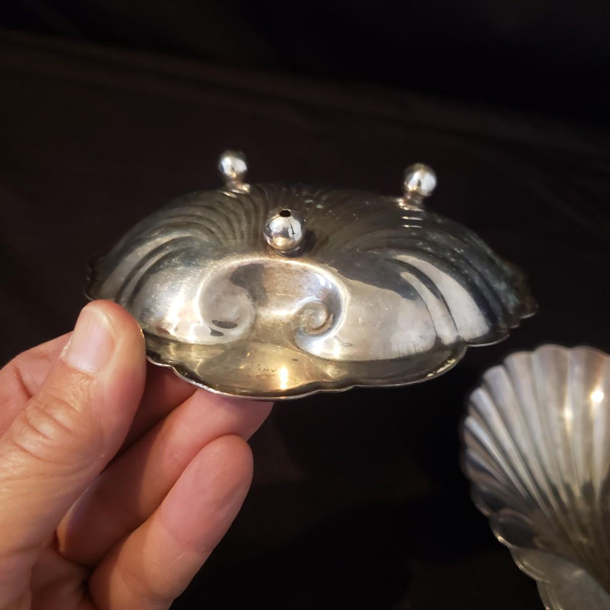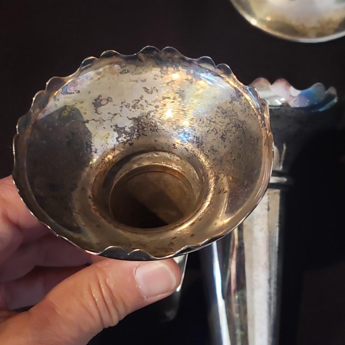 This fun and interesting lot features silver plated floral and decor pieces. The Wallace Baroque piece (11" x 7"H) is photographed with a silver plated ornate frog that fits perfectly! The three fluted vase is so unique! The largest flute has some duck tape at the end, yet is hidden when inserted in the vase. There is some rusting on the insides. The two pedal bowl/frog pieces by Reed and Barton are adorable. There are two shell bowls and lastly a heavy to the touch lidded box by Sheridan.