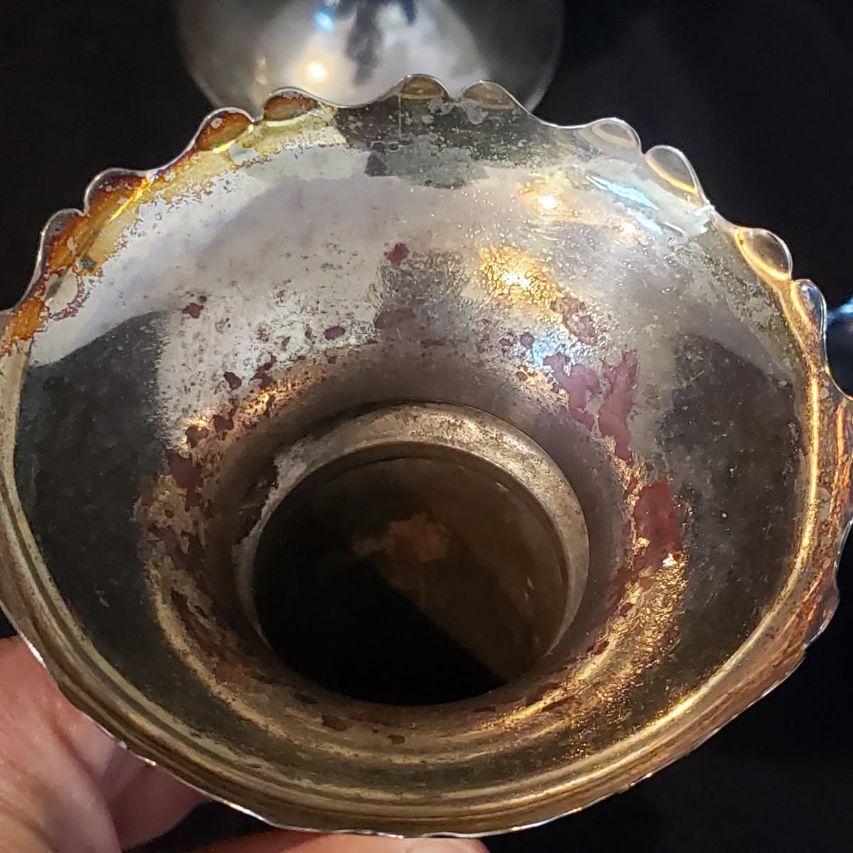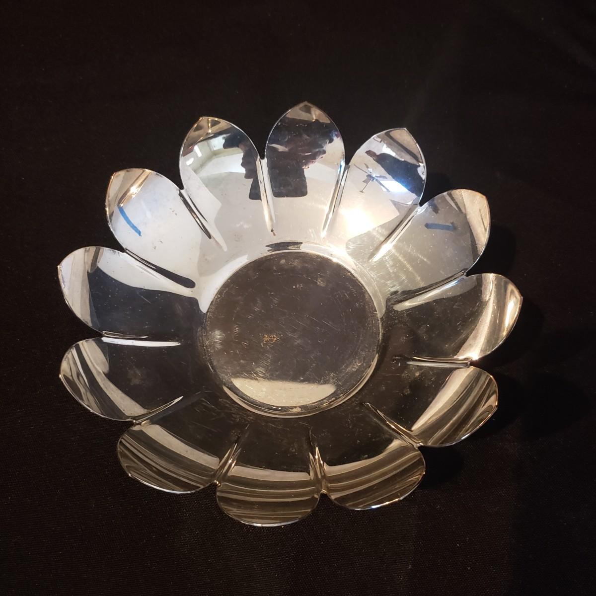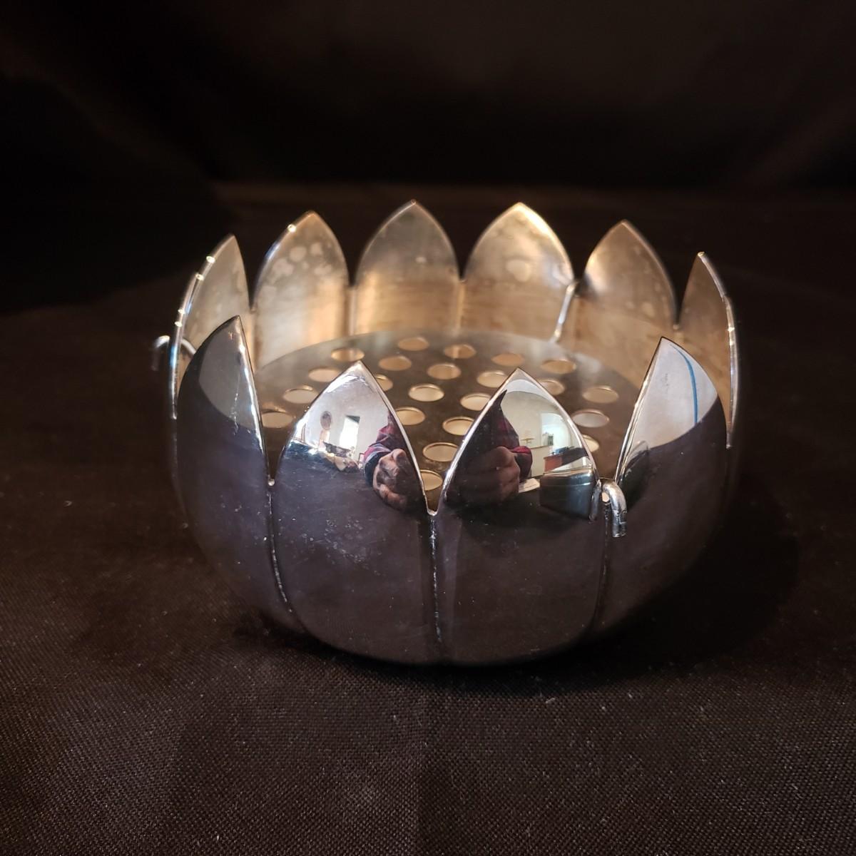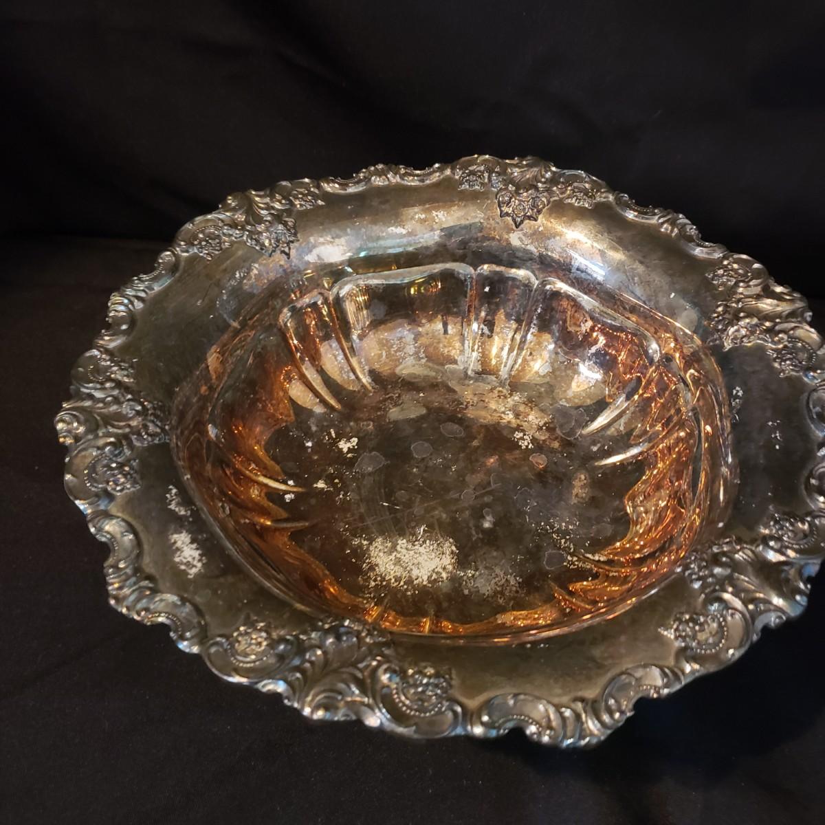 This fun and interesting lot features silver plated floral and decor pieces. The Wallace Baroque piece (11" x 7"H) is photographed with a silver plated ornate frog that fits perfectly! The three fluted vase is so unique! The largest flute has some duck tape at the end, yet is hidden when inserted in the vase. There is some rusting on the insides. The two pedal bowl/frog pieces by Reed and Barton are adorable. There are two shell bowls and lastly a heavy to the touch lidded box by Sheridan.