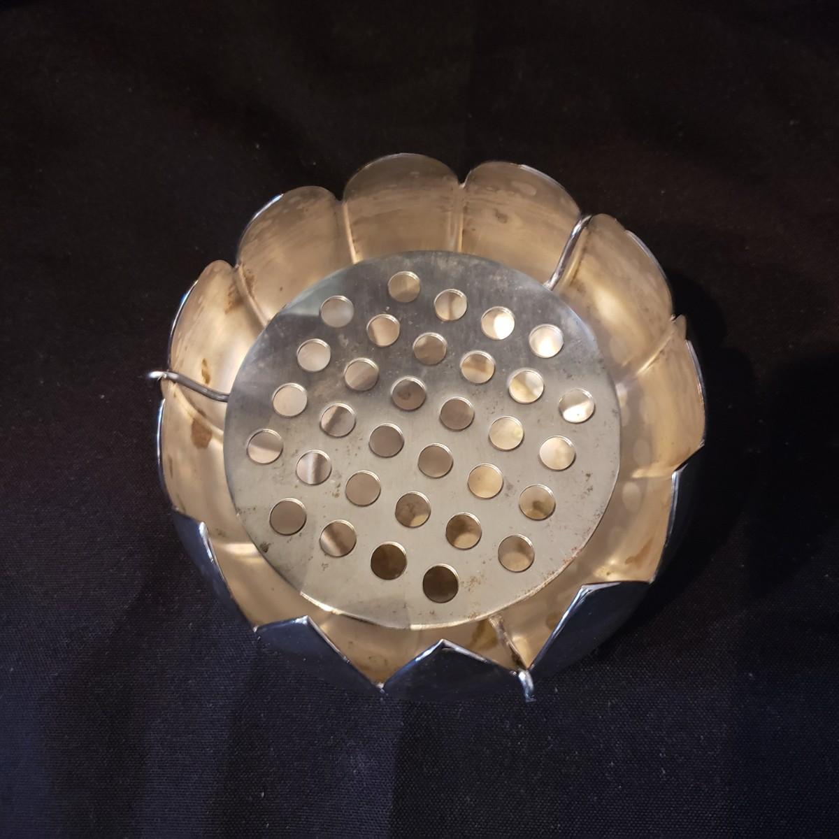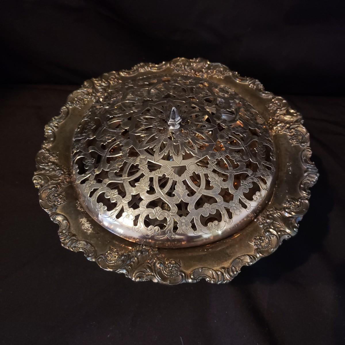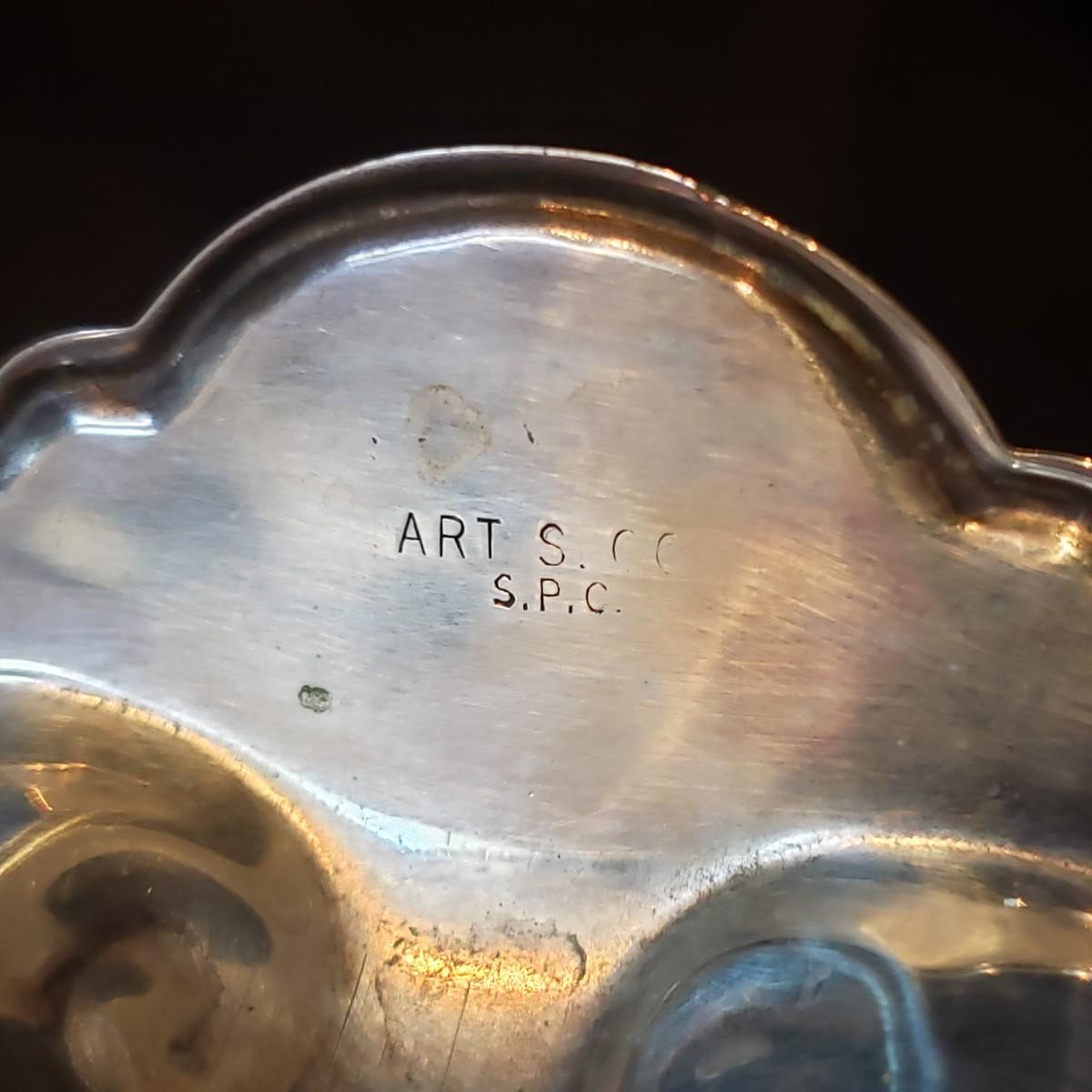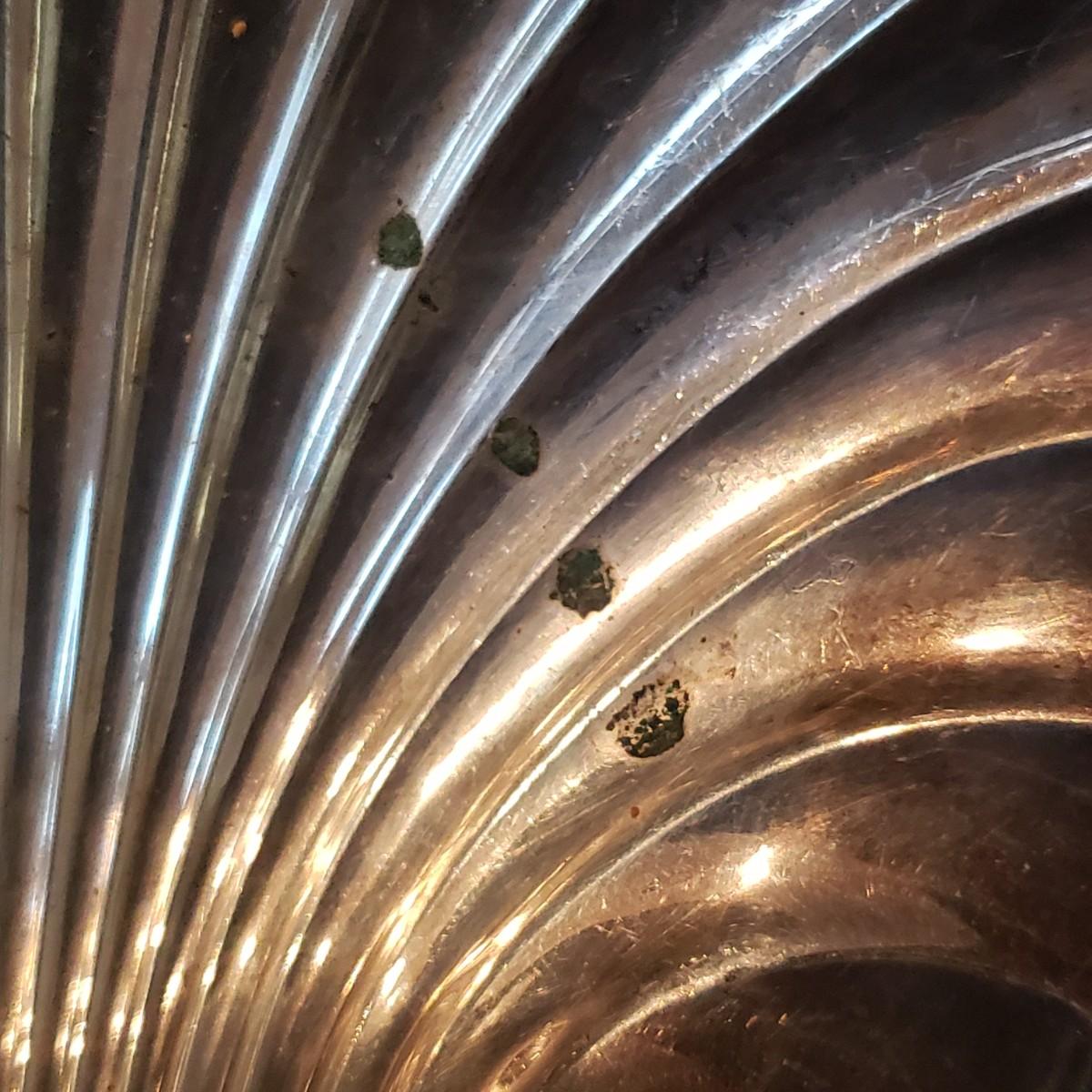 This fun and interesting lot features silver plated floral and decor pieces. The Wallace Baroque piece (11" x 7"H) is photographed with a silver plated ornate frog that fits perfectly! The three fluted vase is so unique! The largest flute has some duck tape at the end, yet is hidden when inserted in the vase. There is some rusting on the insides. The two pedal bowl/frog pieces by Reed and Barton are adorable. There are two shell bowls and lastly a heavy to the touch lidded box by Sheridan.
