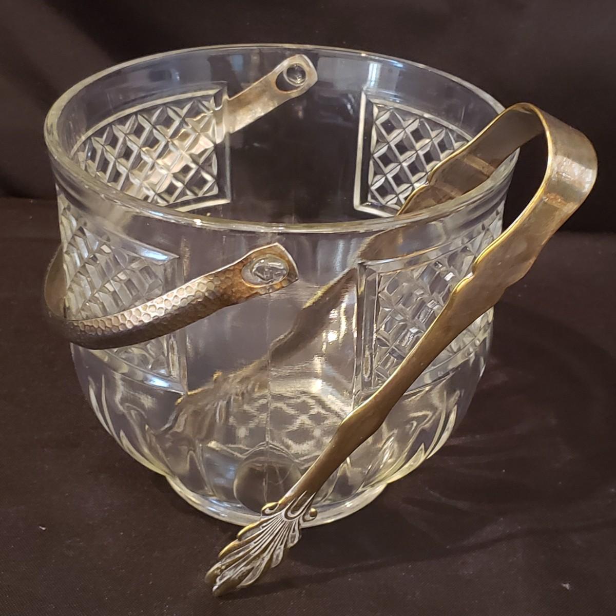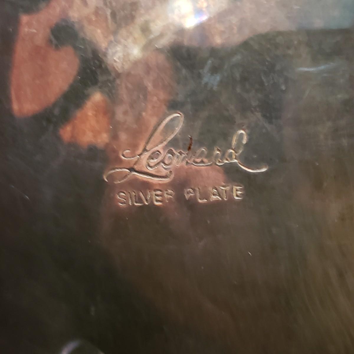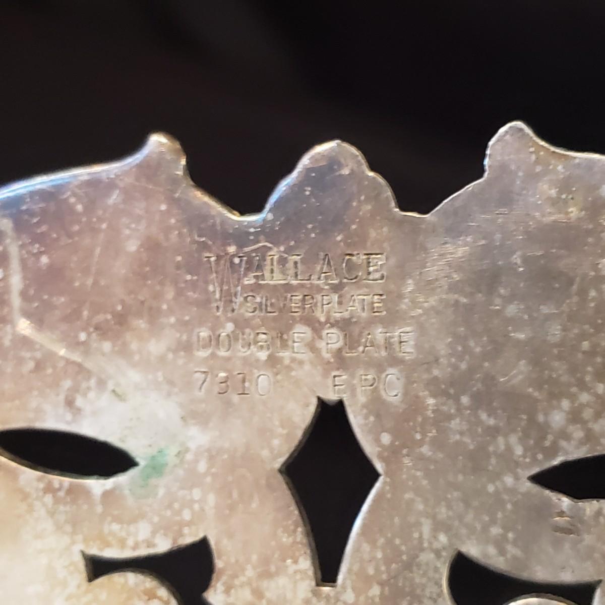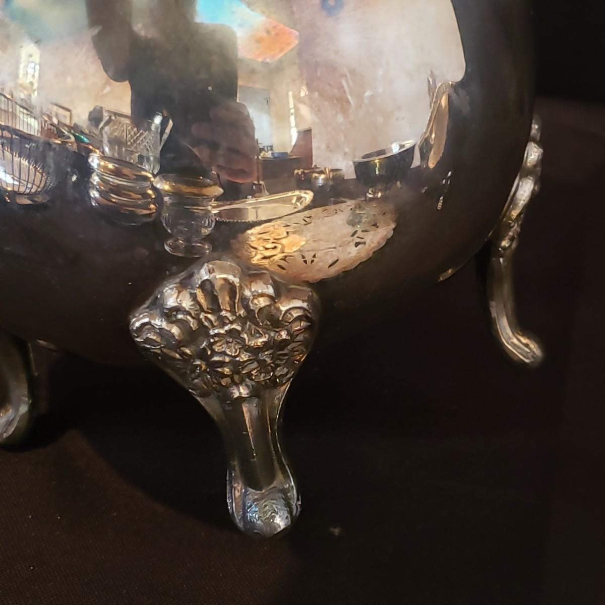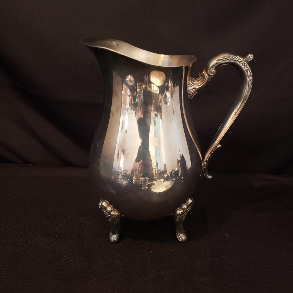 This is a large lot of serving ware from Reed and Barton, The International Silver Co. Wallace and more! The beautiful pitcher has an intricate feet design and measures 8" x 9"H. There are two nodules on the spout that probably from the spout lid. The wire basket is made by Gorham. The glass with metal handle ice bucket comes with tongs. There are four rimmed glass coasters with a glass and silver-plated rimmed egg holder. See pictures for details.