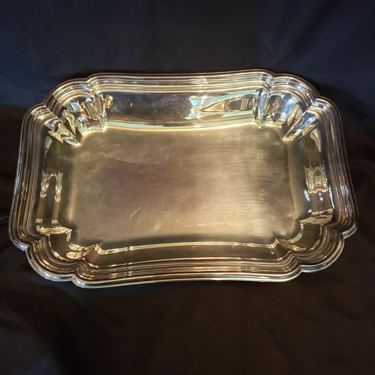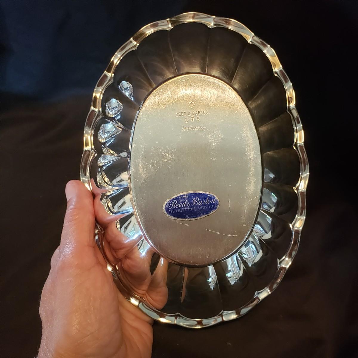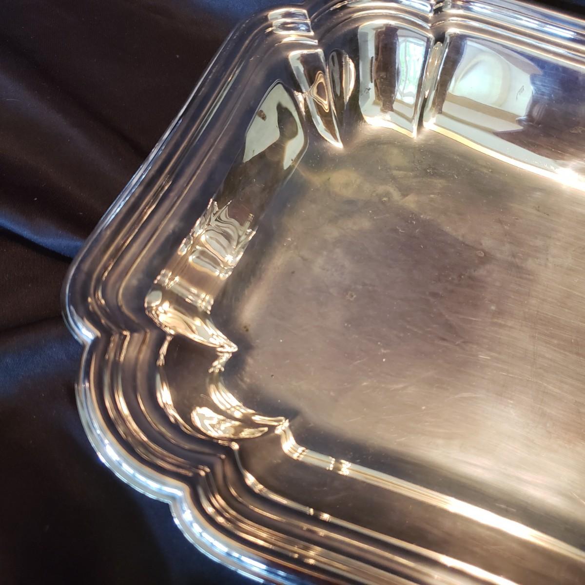 This silver platter and bowl lot contains Reed & Barton, Chadwick and Chippendale silverplate platters and bowls. The rectangular bowl measures 12" x 8" x 2" H.