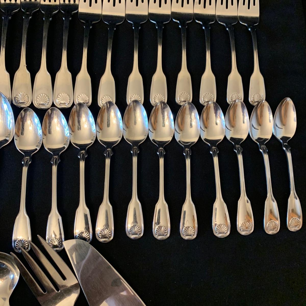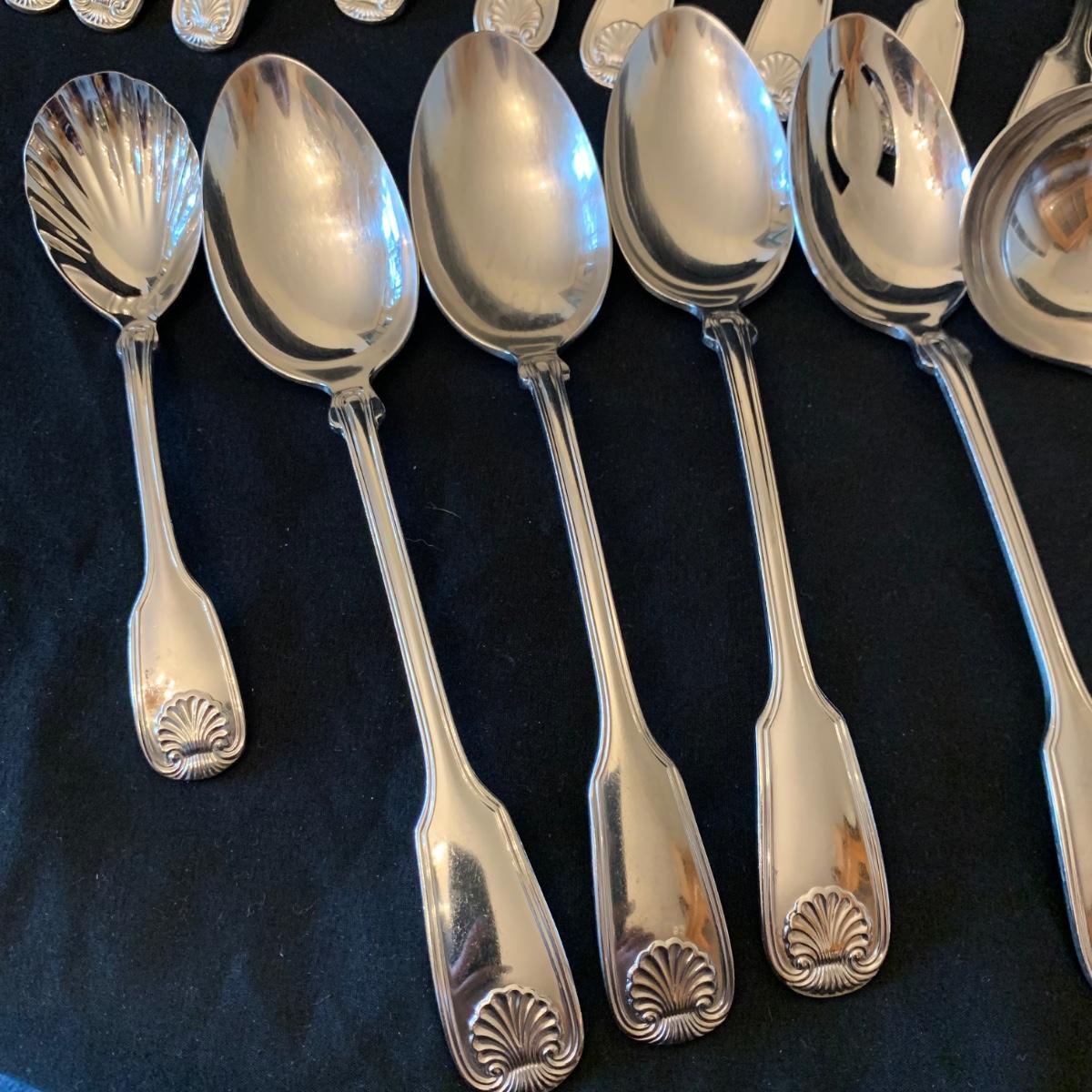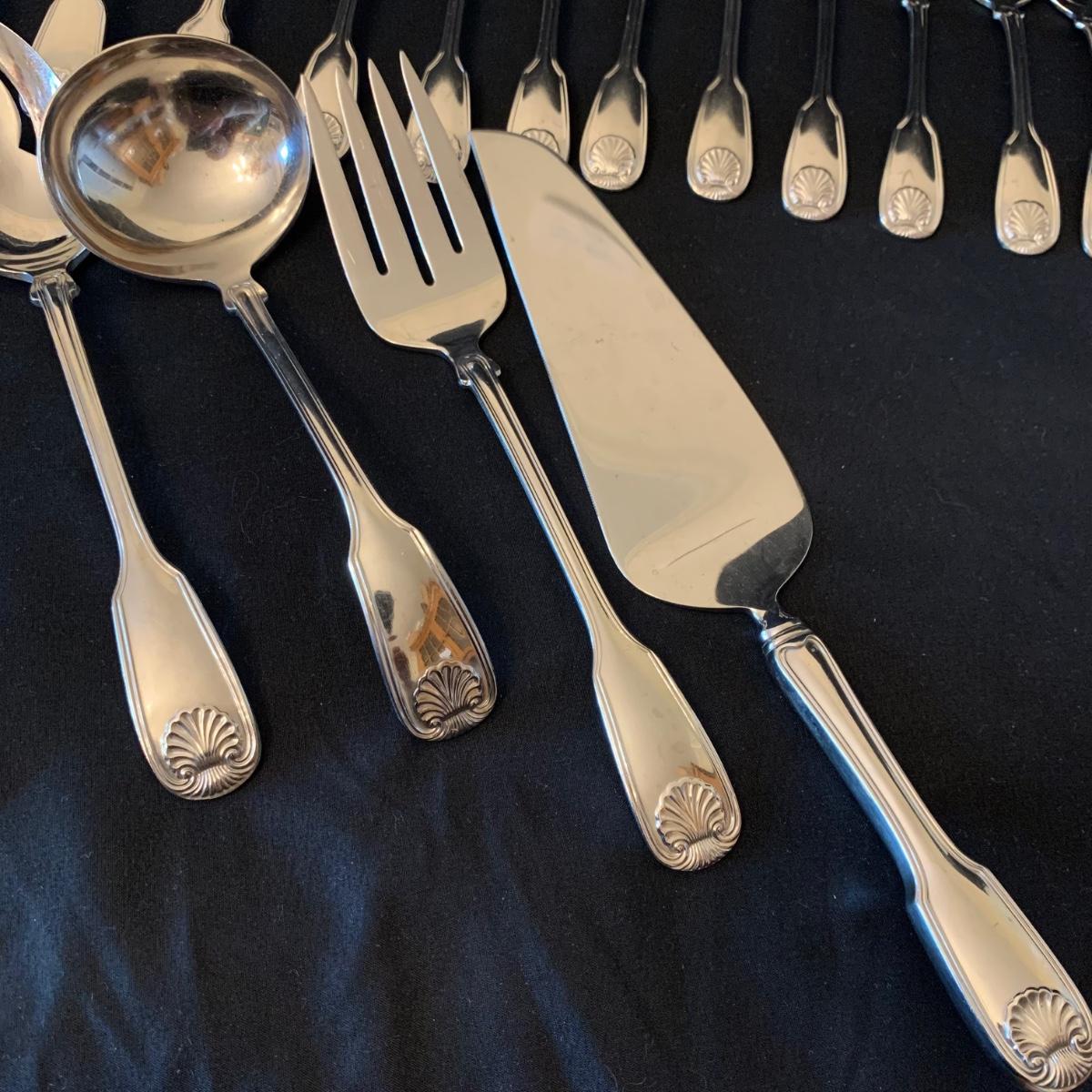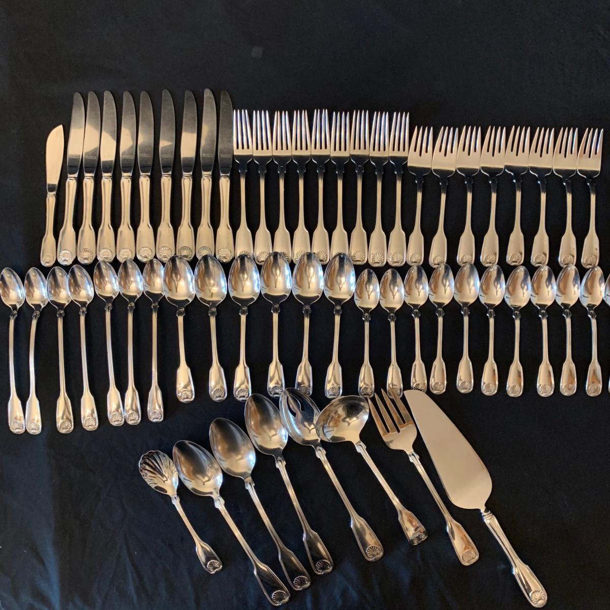 Set of Reed and Barton stainless steel flatware with their “˜Colonial Shell’ design. fifty-nine pieces total. A six person set plus extras. Includes knives, dinner forks, salad forks, soup spoons, dessert spoons, teaspoons, and serving utensils. In very good condition, just needs a good cleaning.